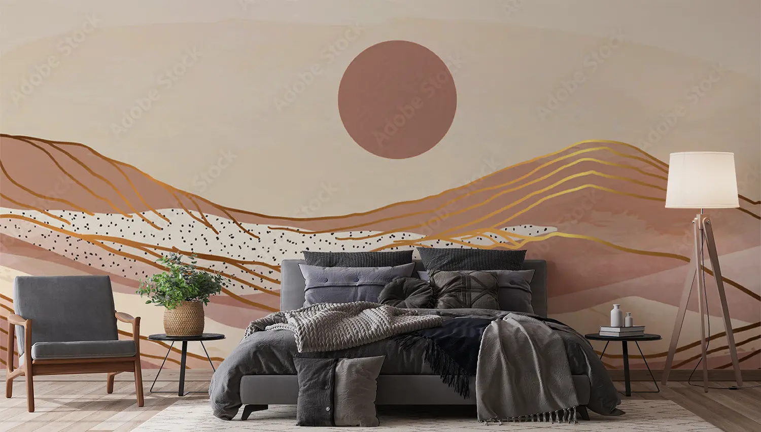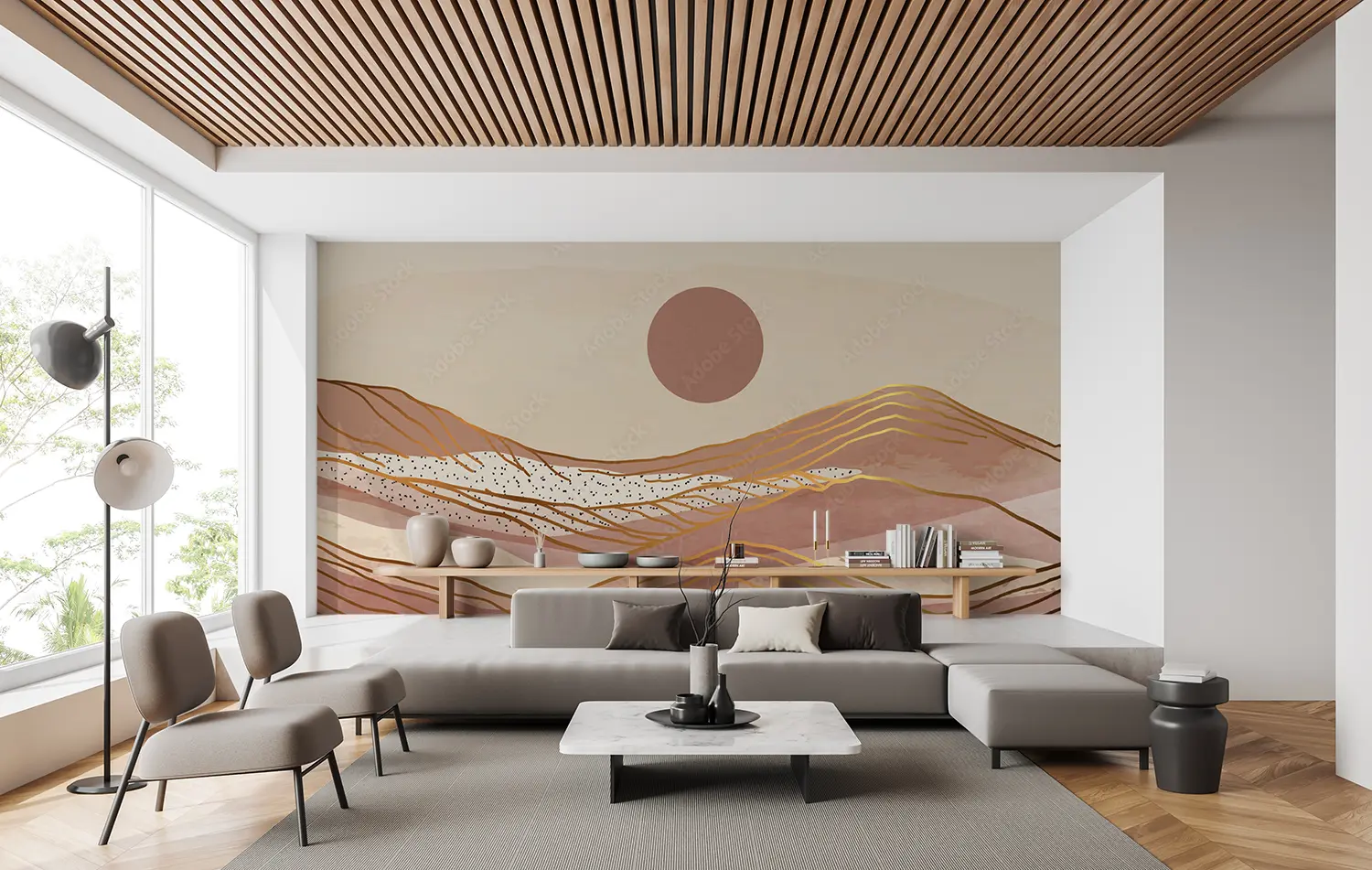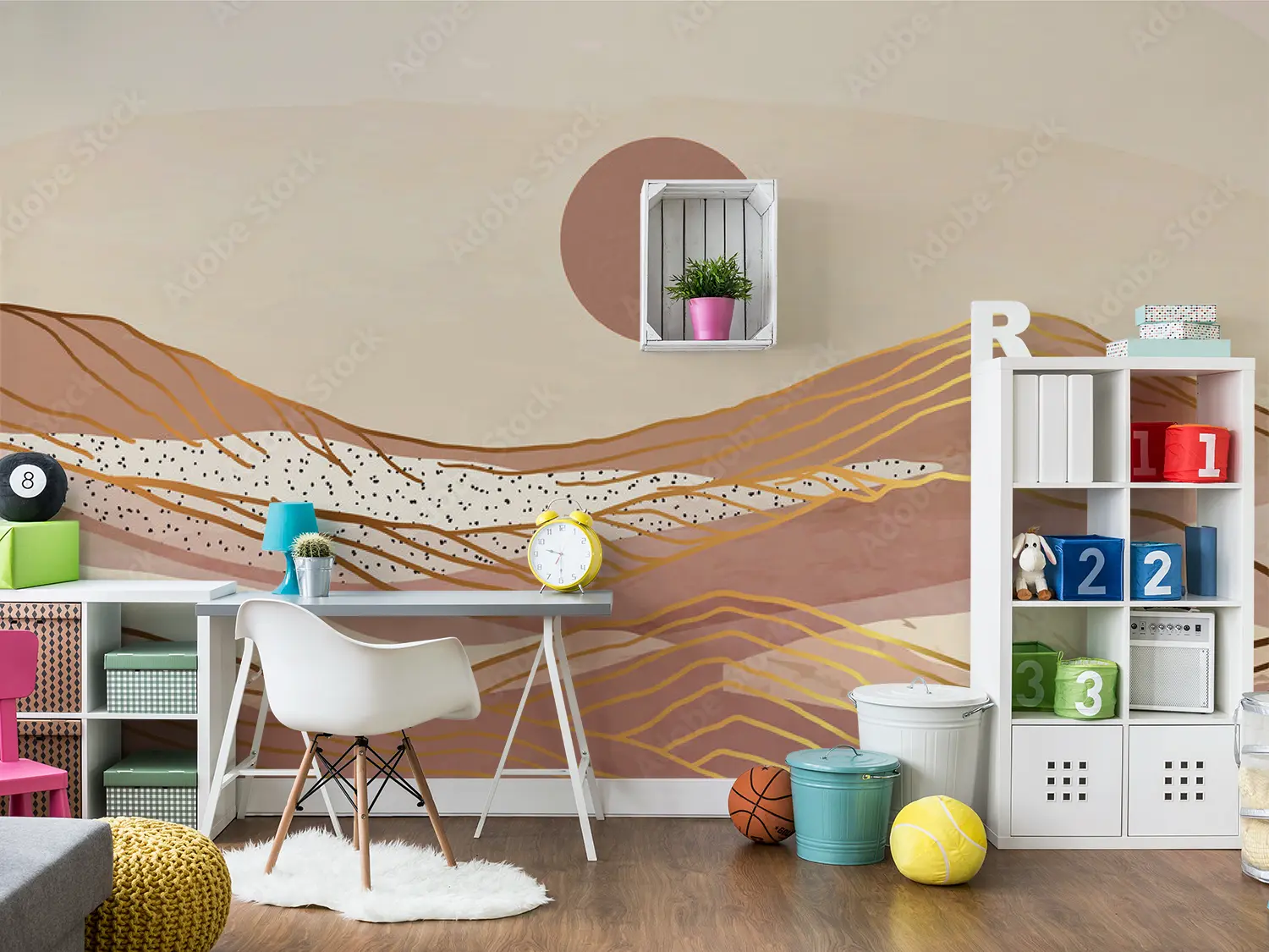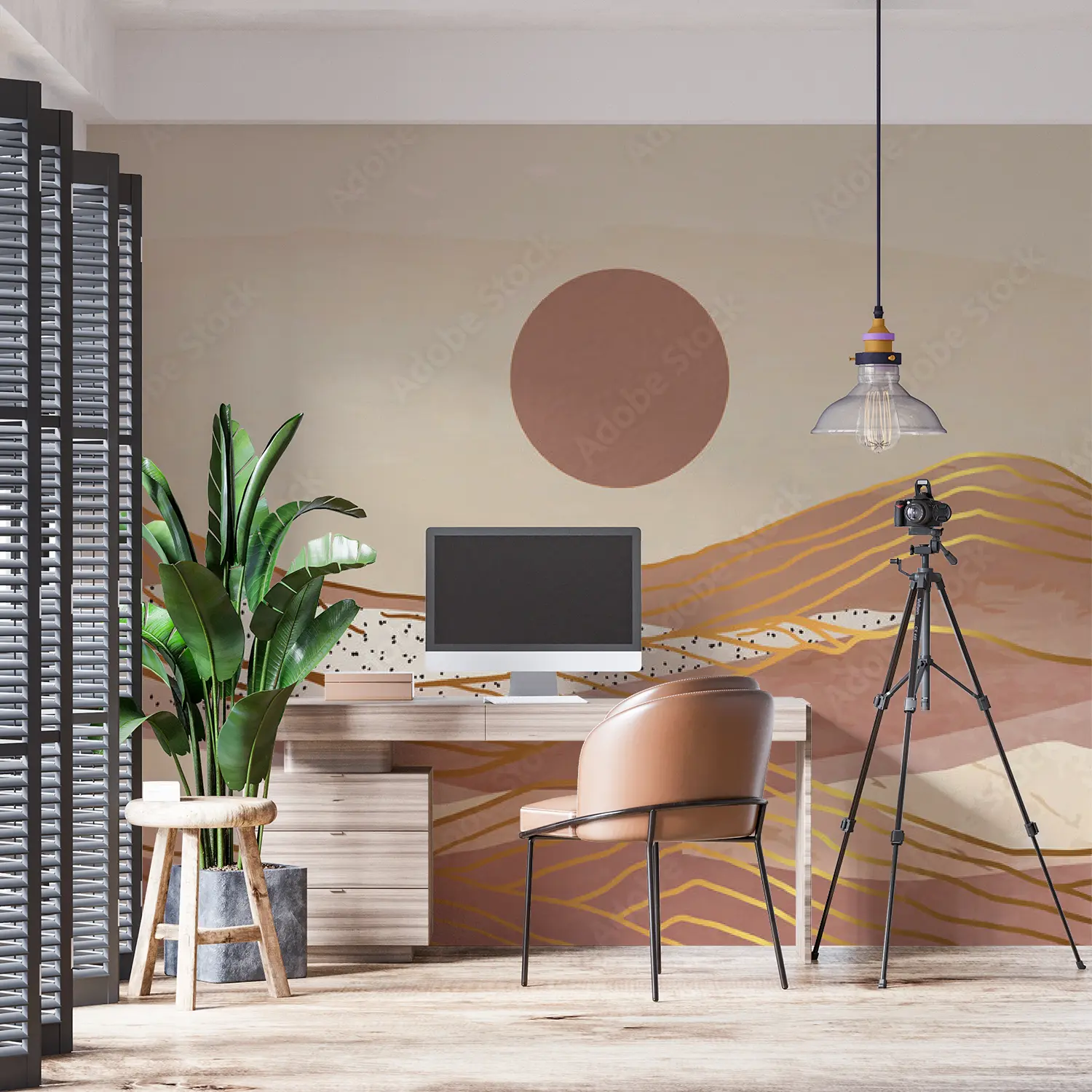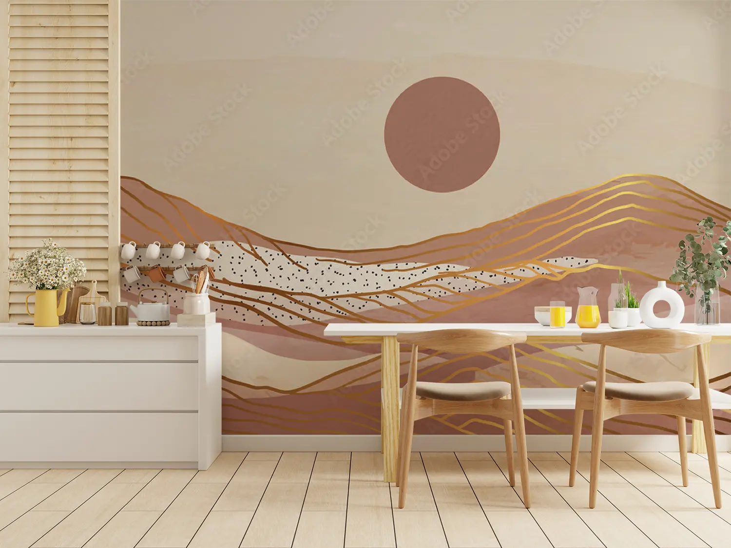 Transform your space with this stunning wall art featuring a picturesque mountain landscape bathed in the warm glow of a setting sun. The earthy tones of brown, pink, and white create a calming and inviting atmosphere, perfect for adding a touch of nature-inspired beauty to your home decor. Bring the beauty of the great outdoors inside with this captivating piece.