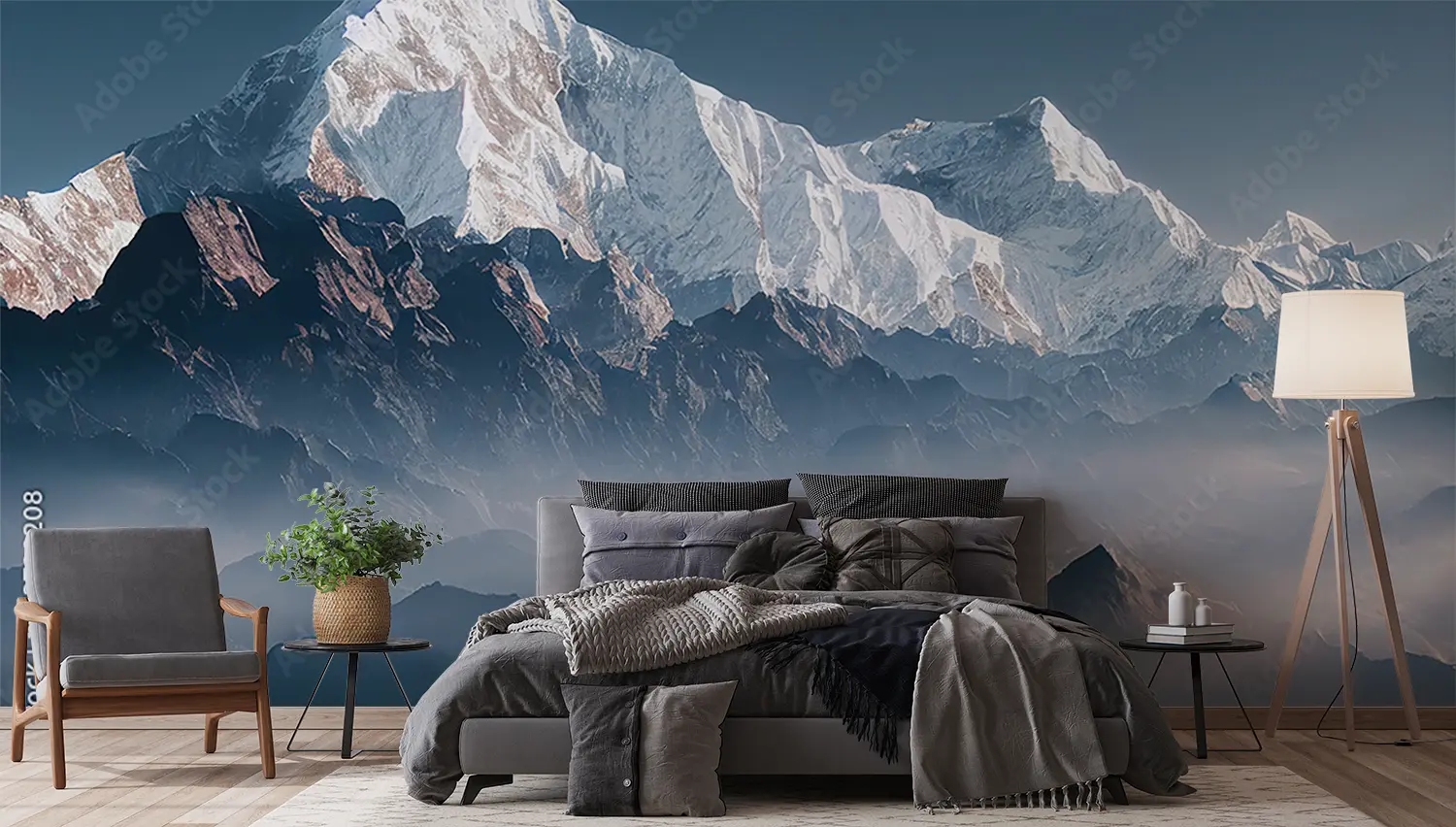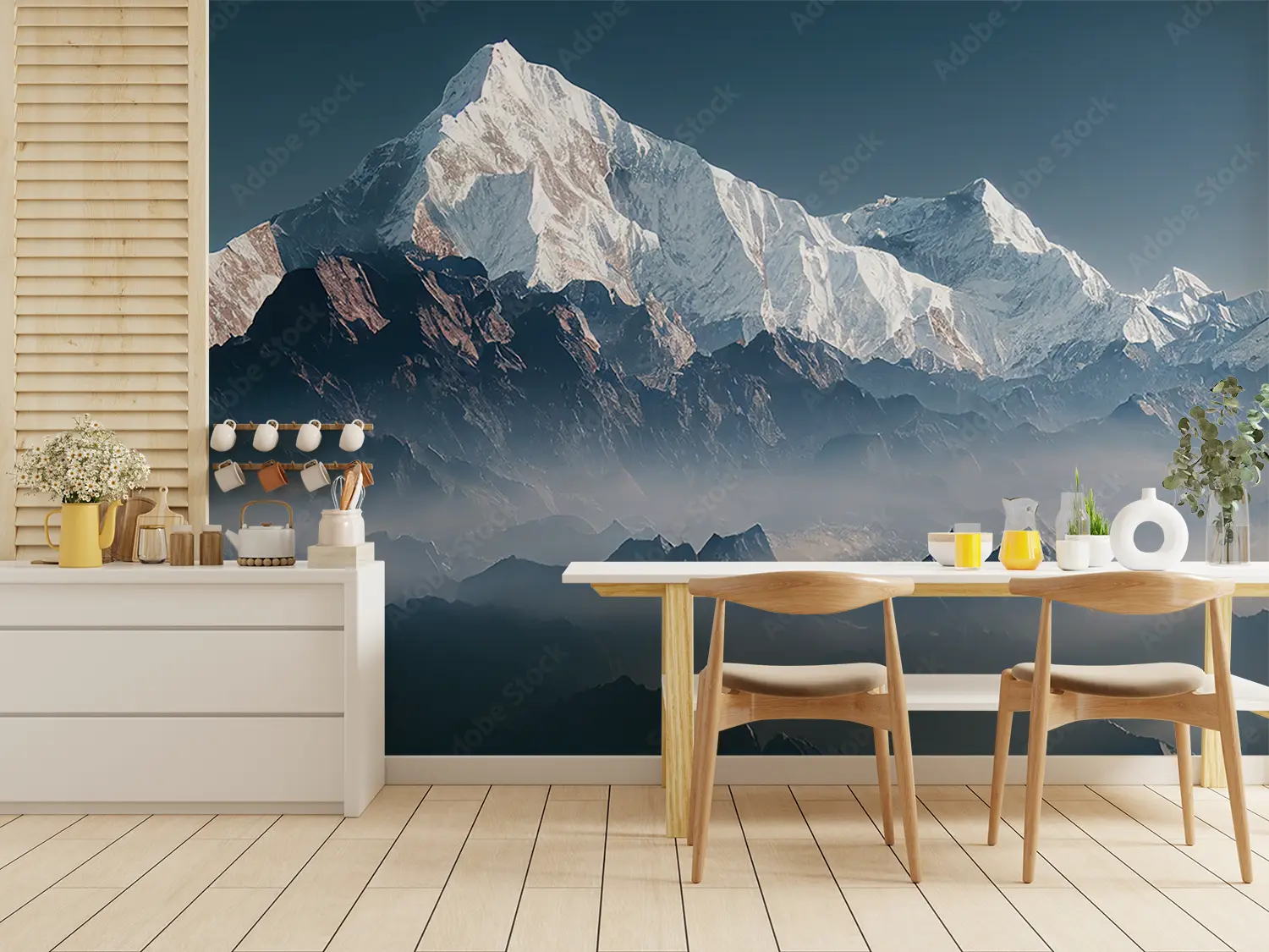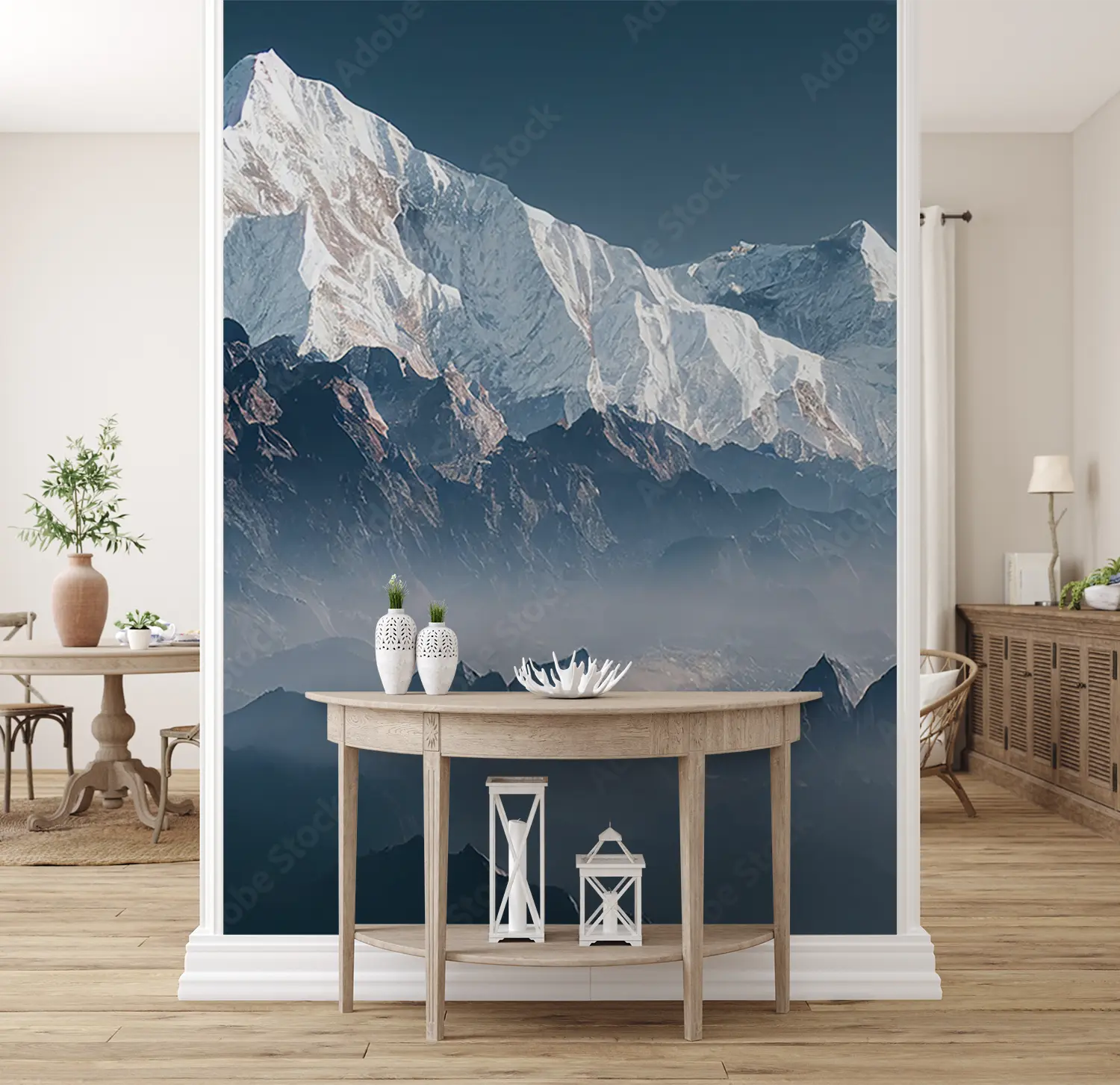 Elevate your home decor with this captivating image of a mountain range adorned with snow-capped peaks under a foggy sky. The serene and majestic aesthetic will bring a sense of tranquility to any room. Complementary colors to consider include shades of blue, grey, and white to enhance the peaceful ambiance of the scene.