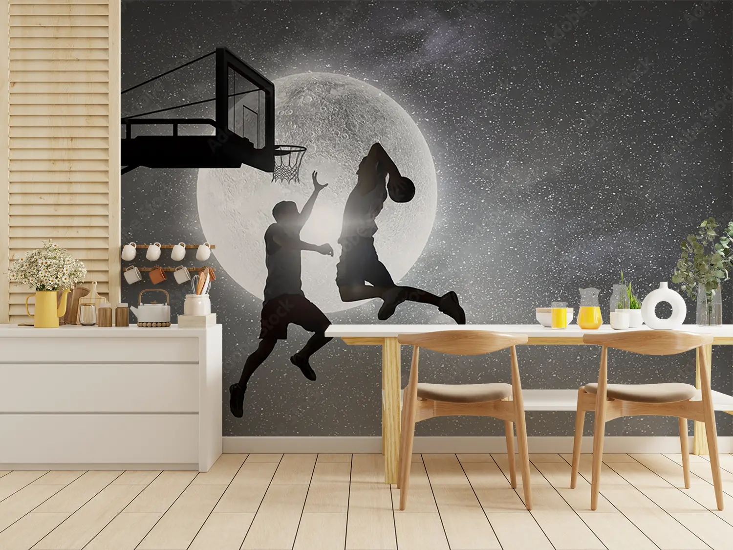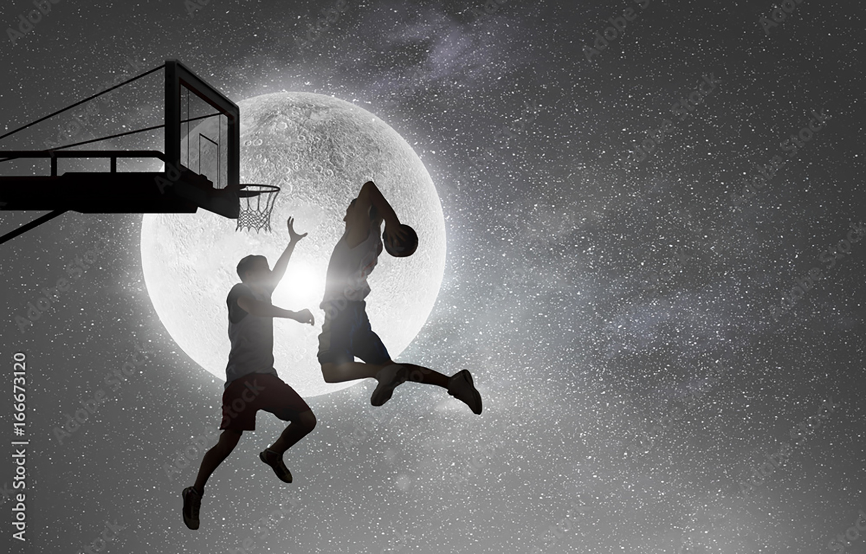 Transform your space with the captivating scene of two men playing basketball under the moonlight. This wall art captures the beauty of athleticism and the serenity of the night sky, adding a touch of elegance to your home decor. Complementary colors to enhance this piece include deep blues, soft whites, and subtle grays for a harmonious aesthetic.