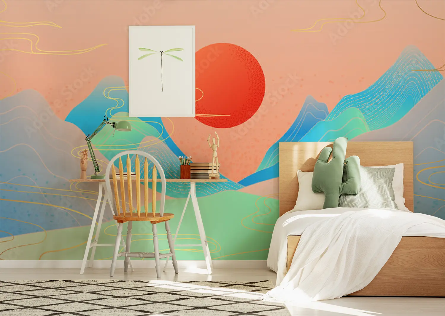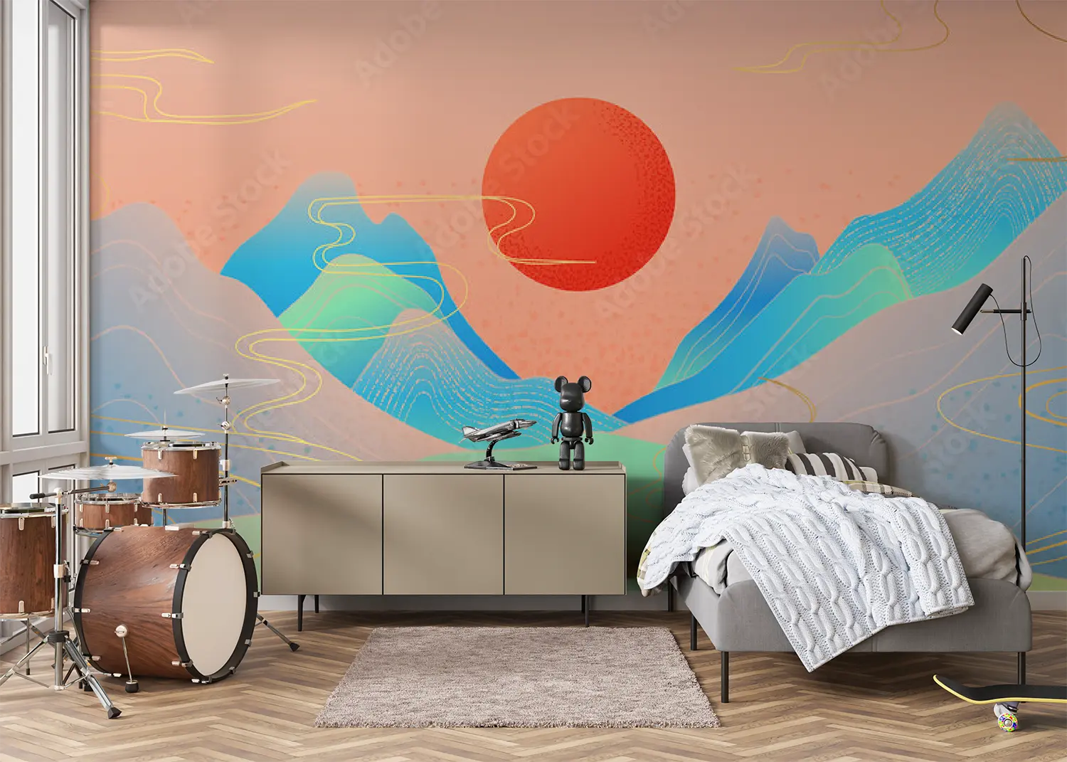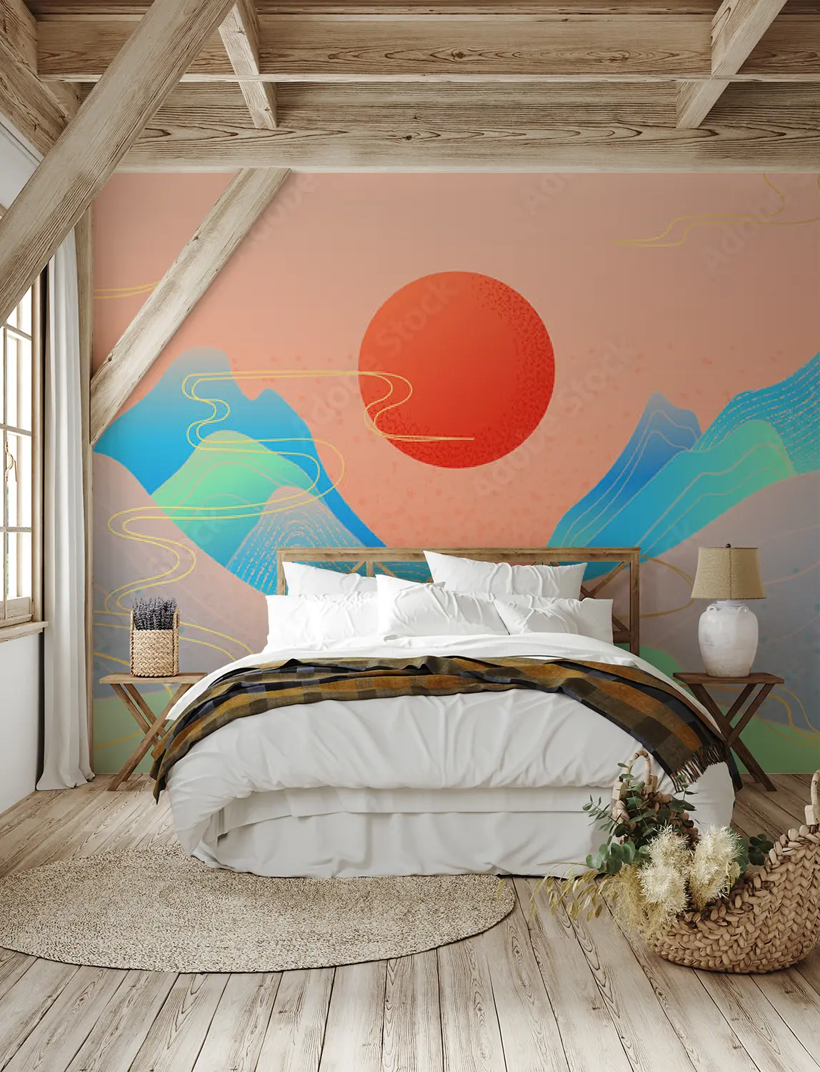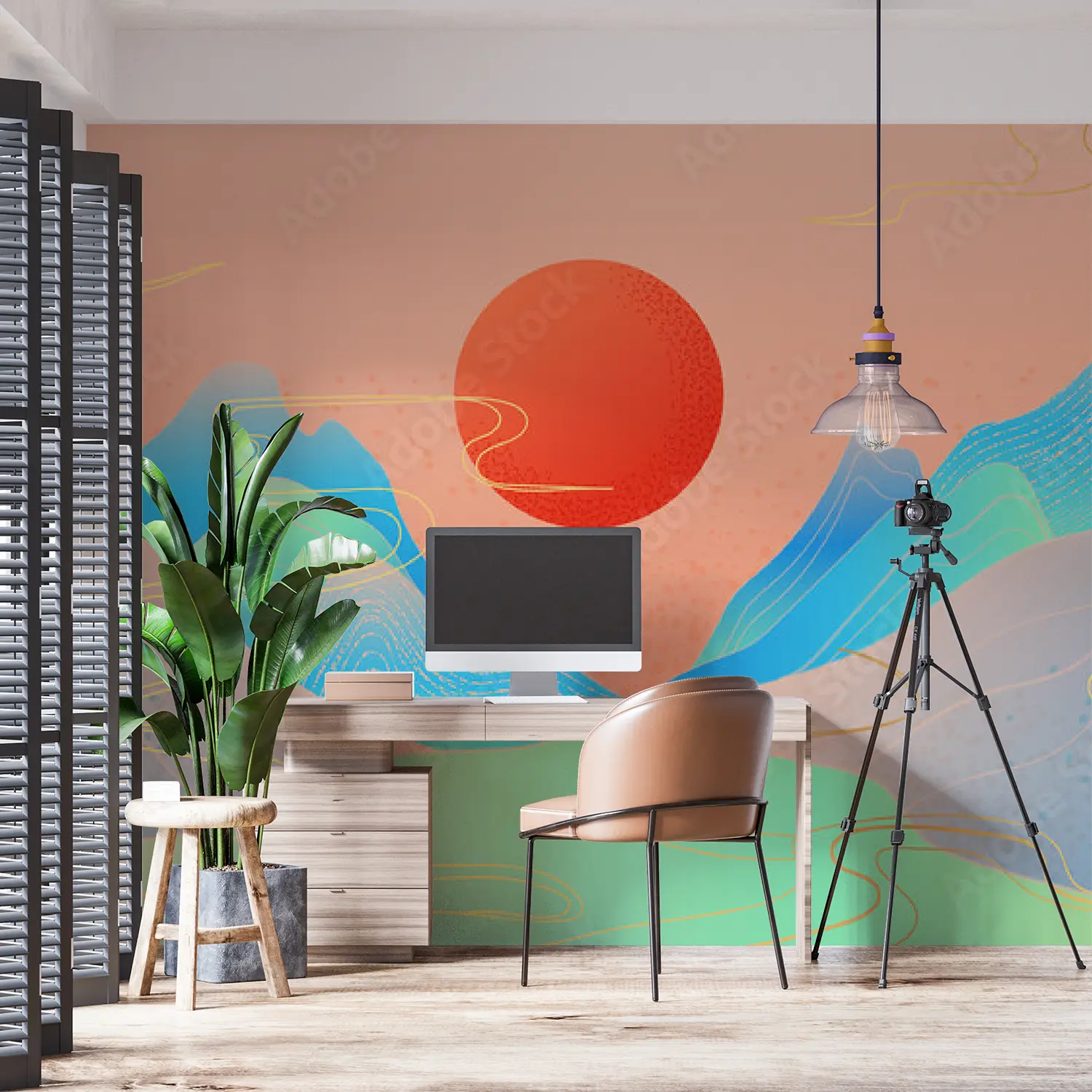 Transform your living space with this captivating painting of a mountain at sunset, featuring vibrant colors and a red sun in the background. Add a touch of artistic flair to your home with this beautiful landscape piece. Pair it with complementary colors like blue, orange, and earth tones to enhance its visual impact. A perfect choice for adding charm to any room.