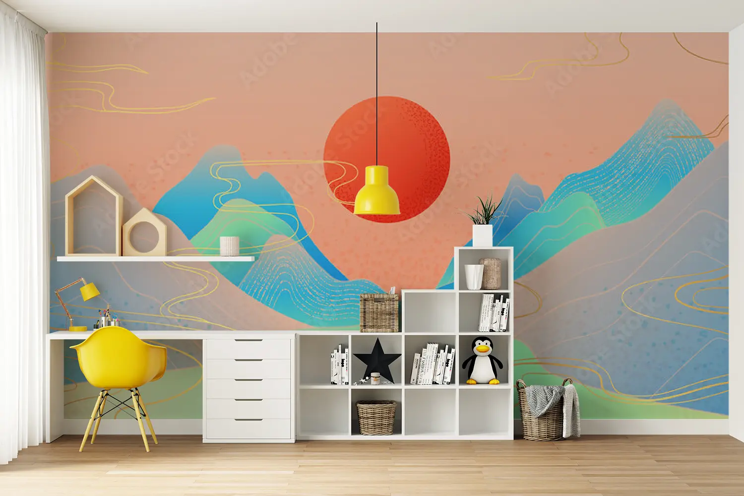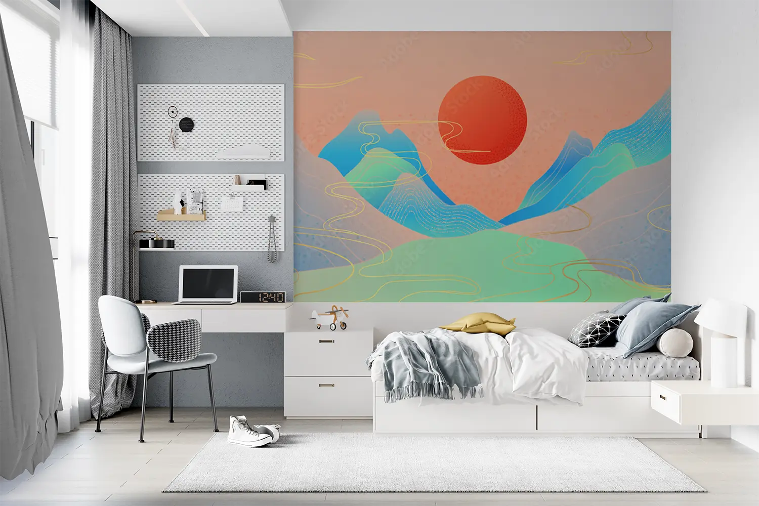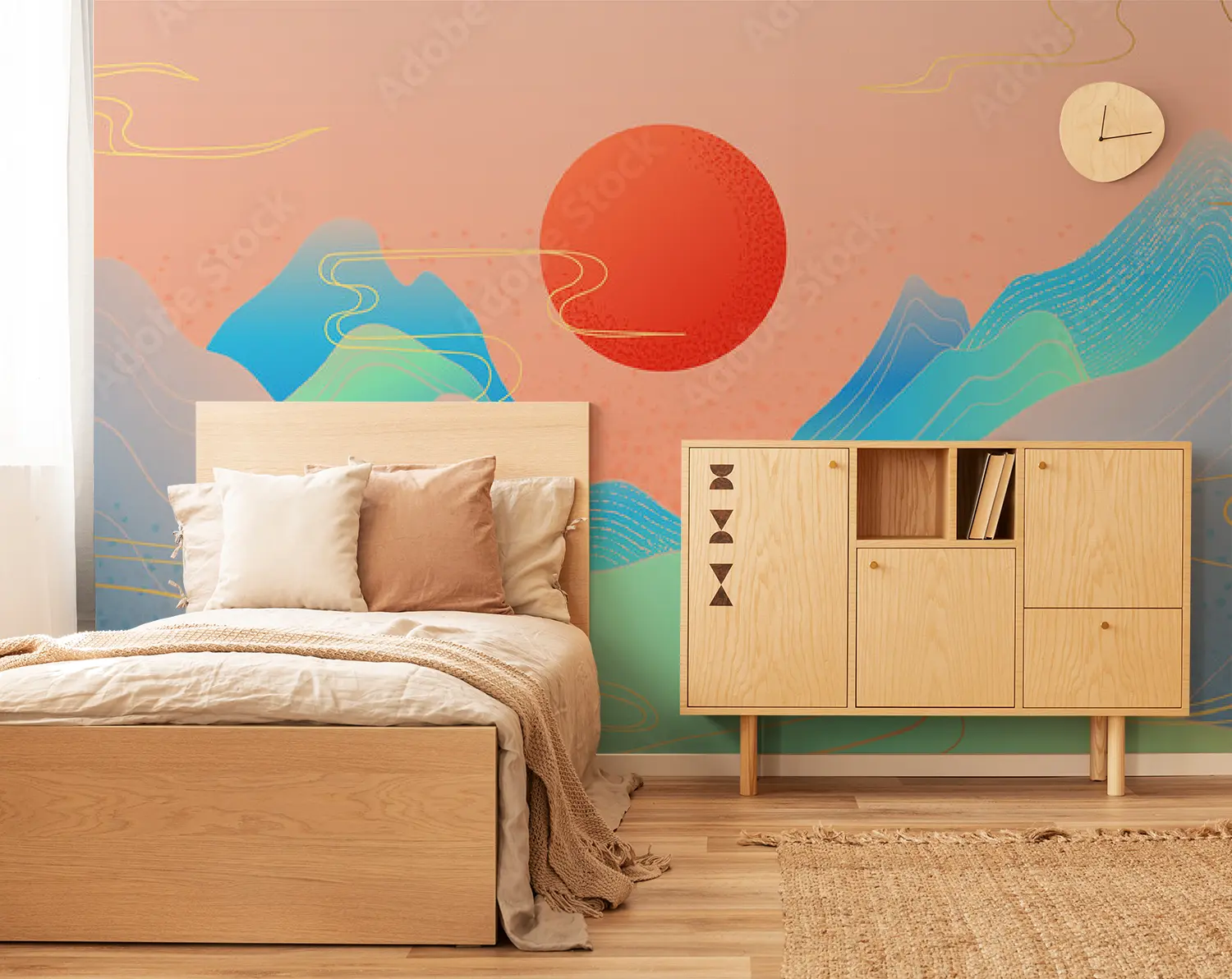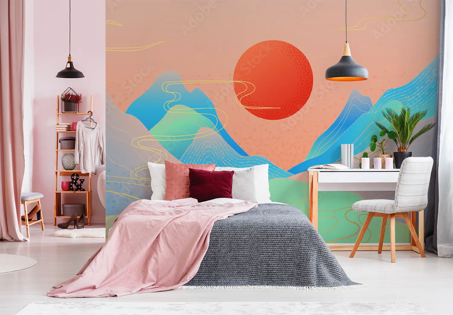 Transform your living space with this captivating painting of a mountain at sunset, featuring vibrant colors and a red sun in the background. Add a touch of artistic flair to your home with this beautiful landscape piece. Pair it with complementary colors like blue, orange, and earth tones to enhance its visual impact. A perfect choice for adding charm to any room.