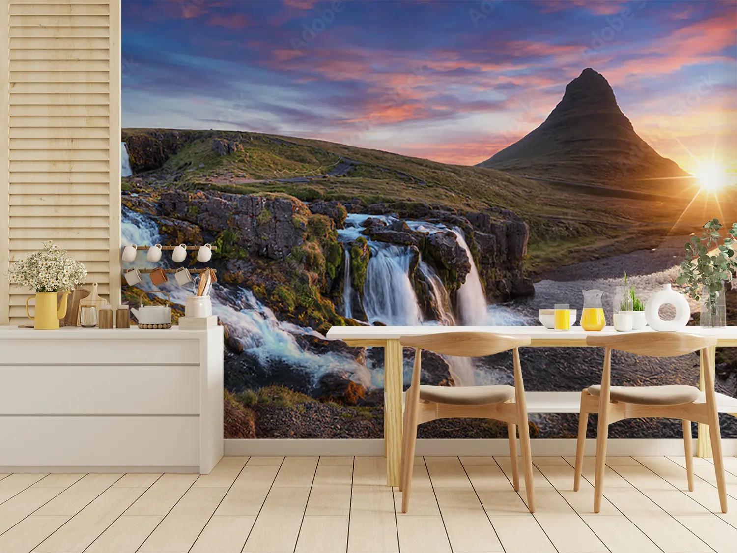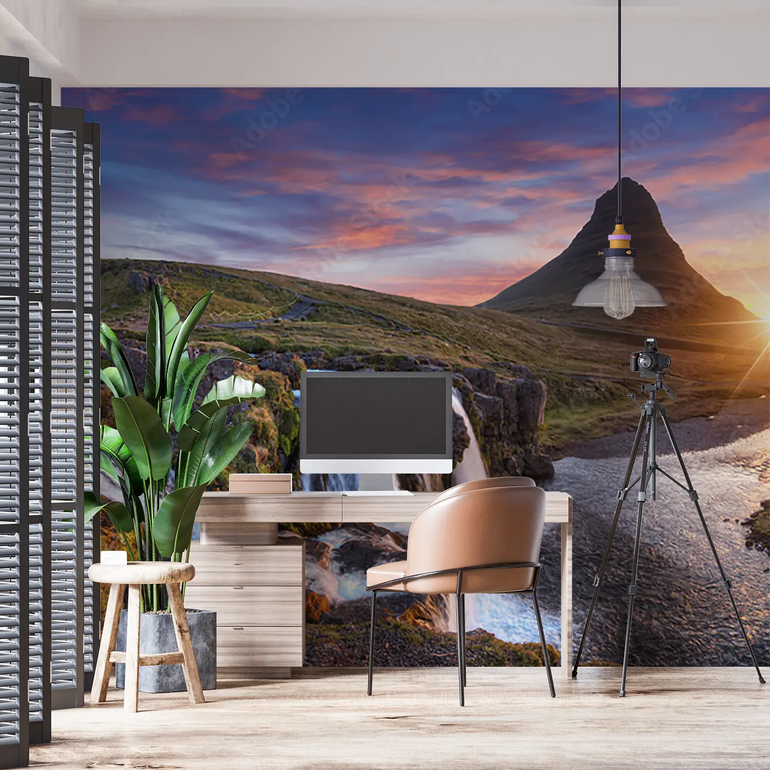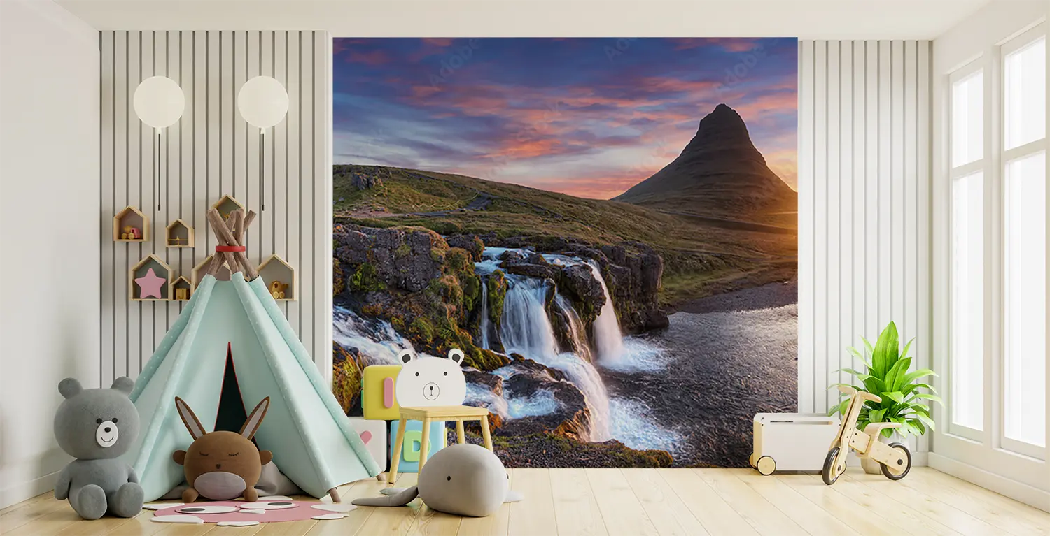 Transform your space with a stunning wall art featuring a picturesque mountain landscape at sunset with a cascading waterfall. This captivating piece adds a touch of natural beauty and tranquility to any room. Complementary colors like earthy browns, soft blues, and warm oranges will enhance the overall aesthetic appeal of your home decor.