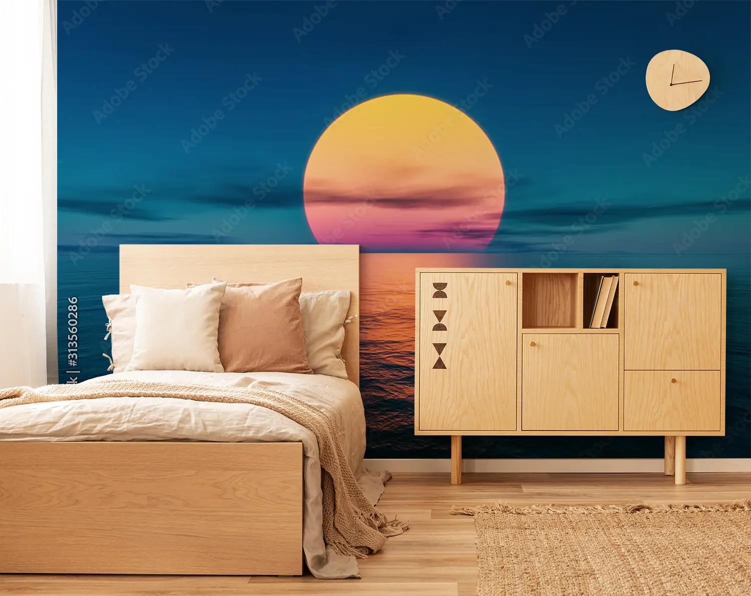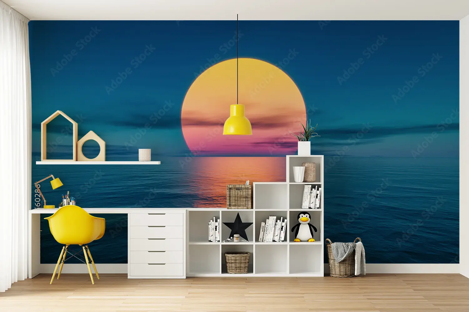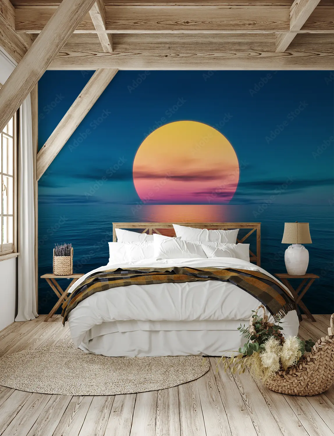 Immerse your space in the tranquil beauty of a large sun rising over the ocean with this captivating wall art. This stunning piece will bring a sense of calm and serenity to any room, adding a touch of coastal charm to your home decor. Complementary colors include shades of blue, pink, and yellow for a harmonious aesthetic.