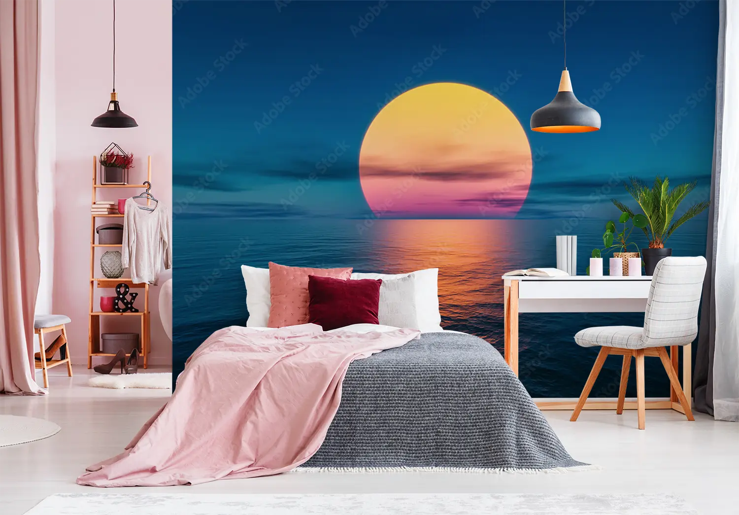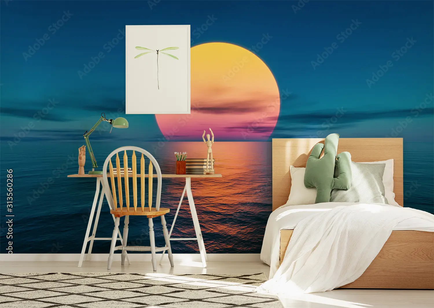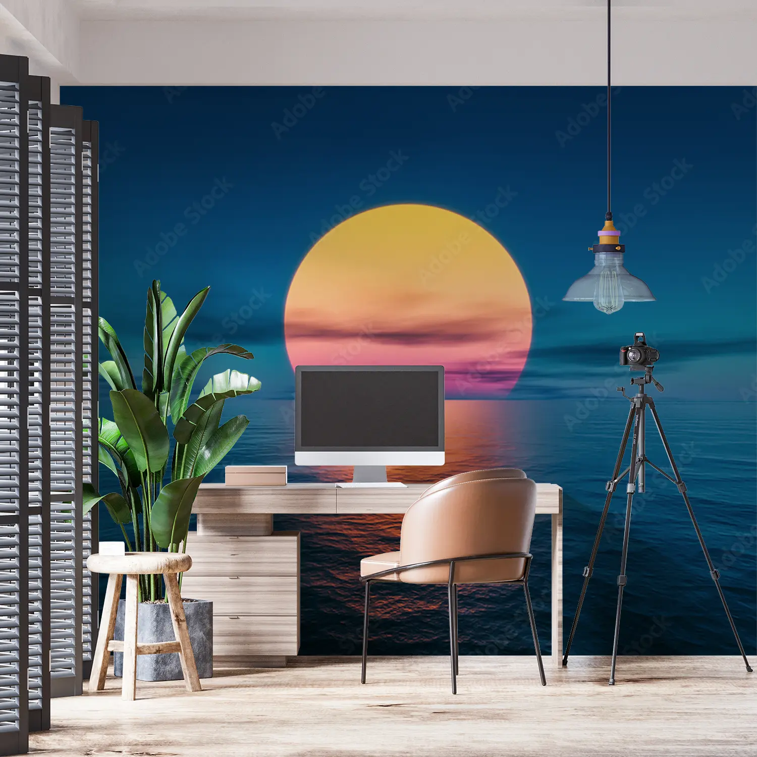Immerse your space in the tranquil beauty of a large sun rising over the ocean with this captivating wall art. This stunning piece will bring a sense of calm and serenity to any room, adding a touch of coastal charm to your home decor. Complementary colors include shades of blue, pink, and yellow for a harmonious aesthetic.