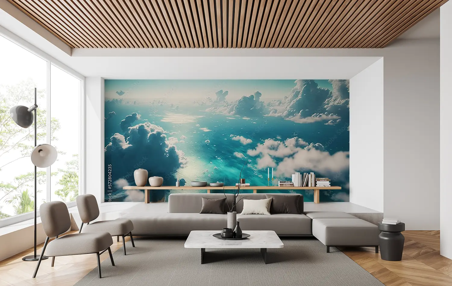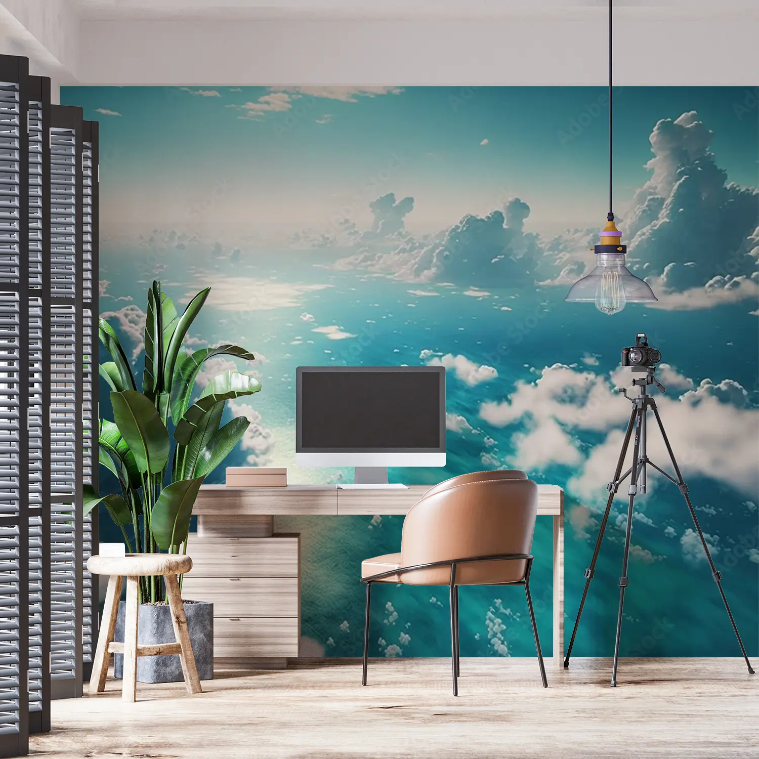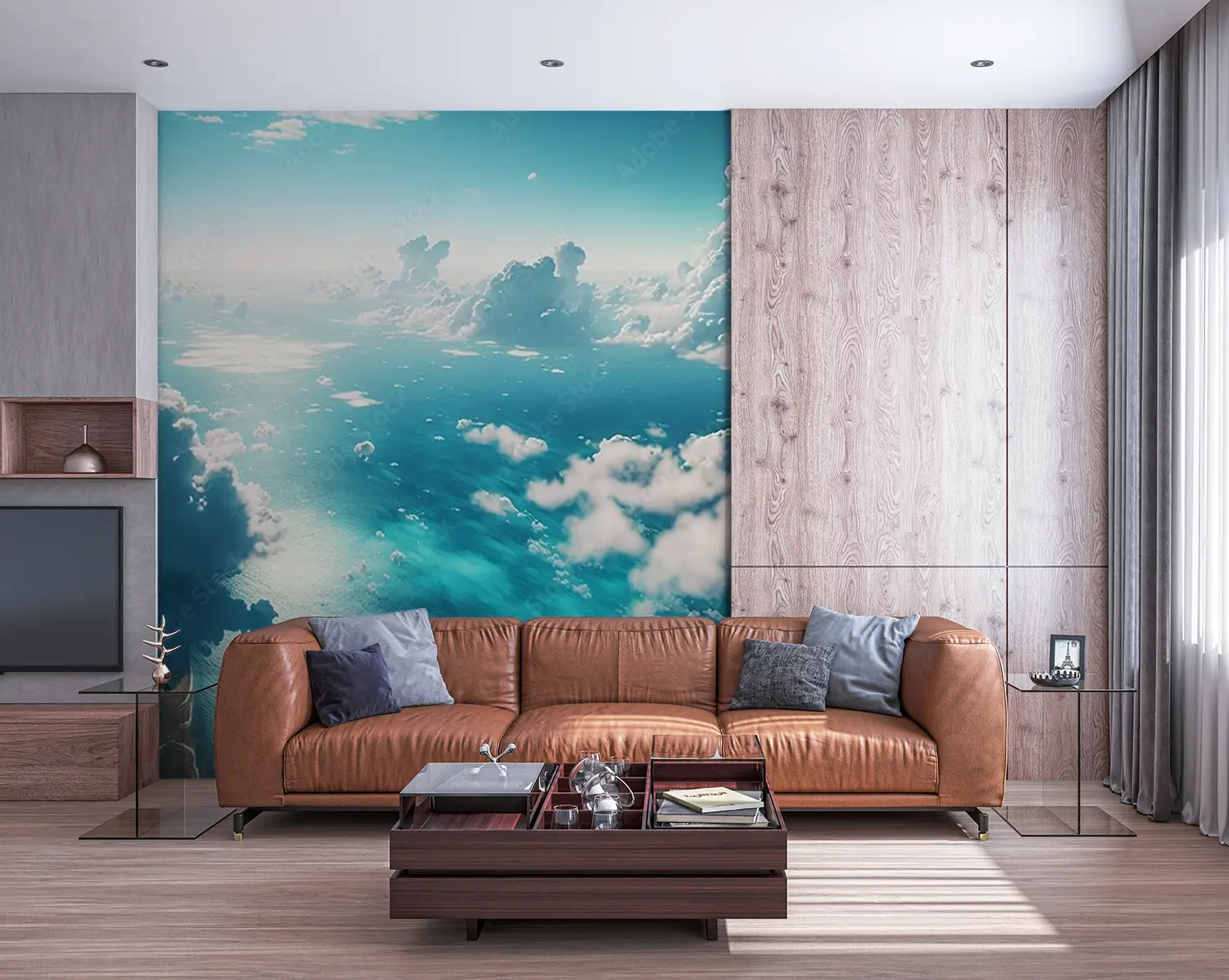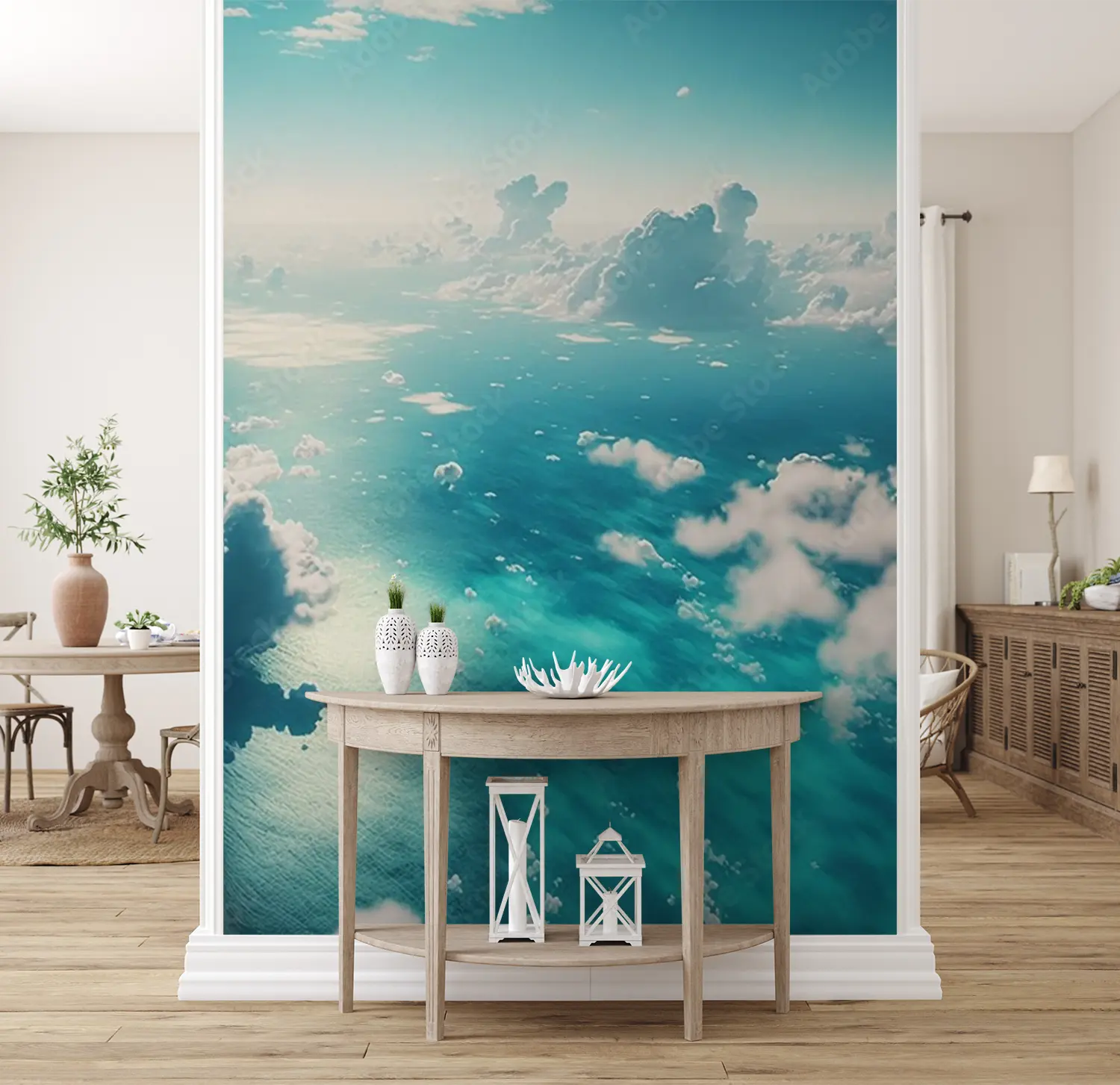 Immerse yourself in the tranquil beauty of the ocean with this stunning wall art. The calming shades of blue and white will bring a sense of peace and serenity to any room. Enhance your home decor with this captivating view of the ocean from an airplane, adding a touch of nature's beauty to your space. Complementary colors include shades of aqua, teal, and soft grey.
