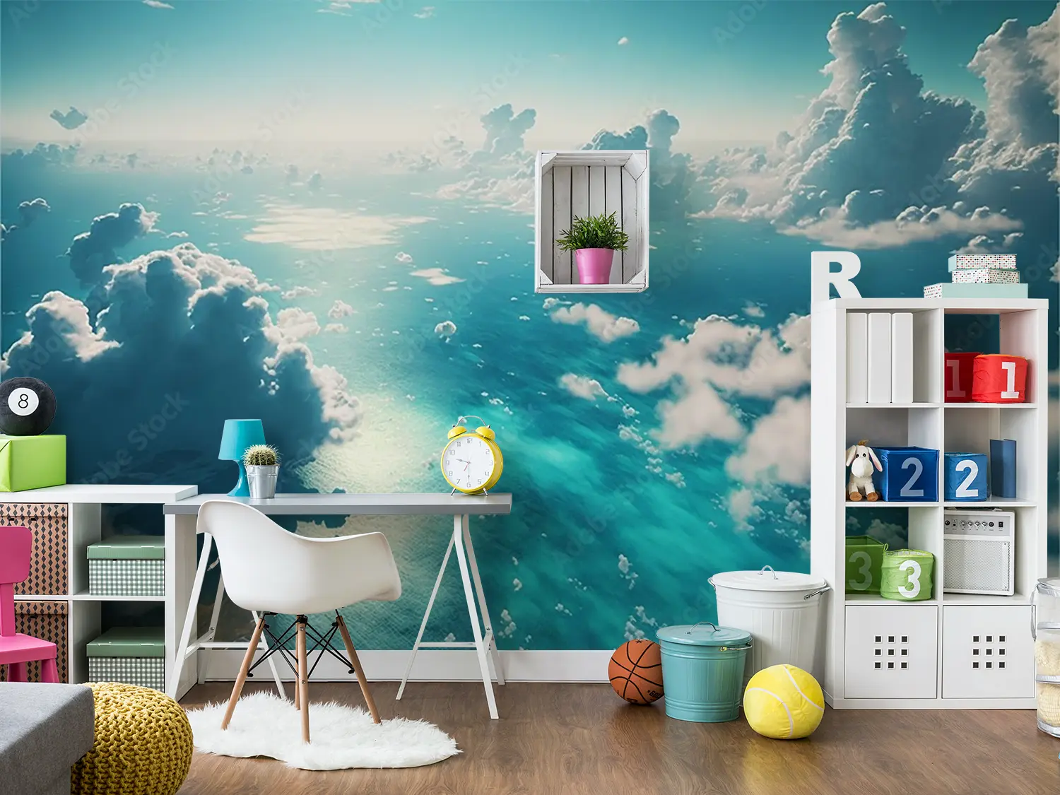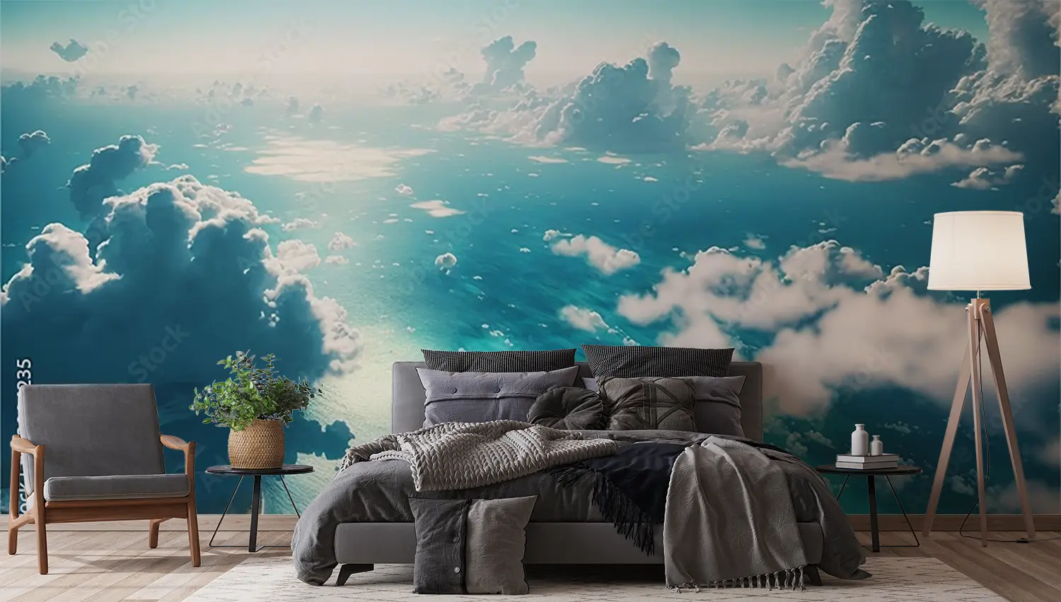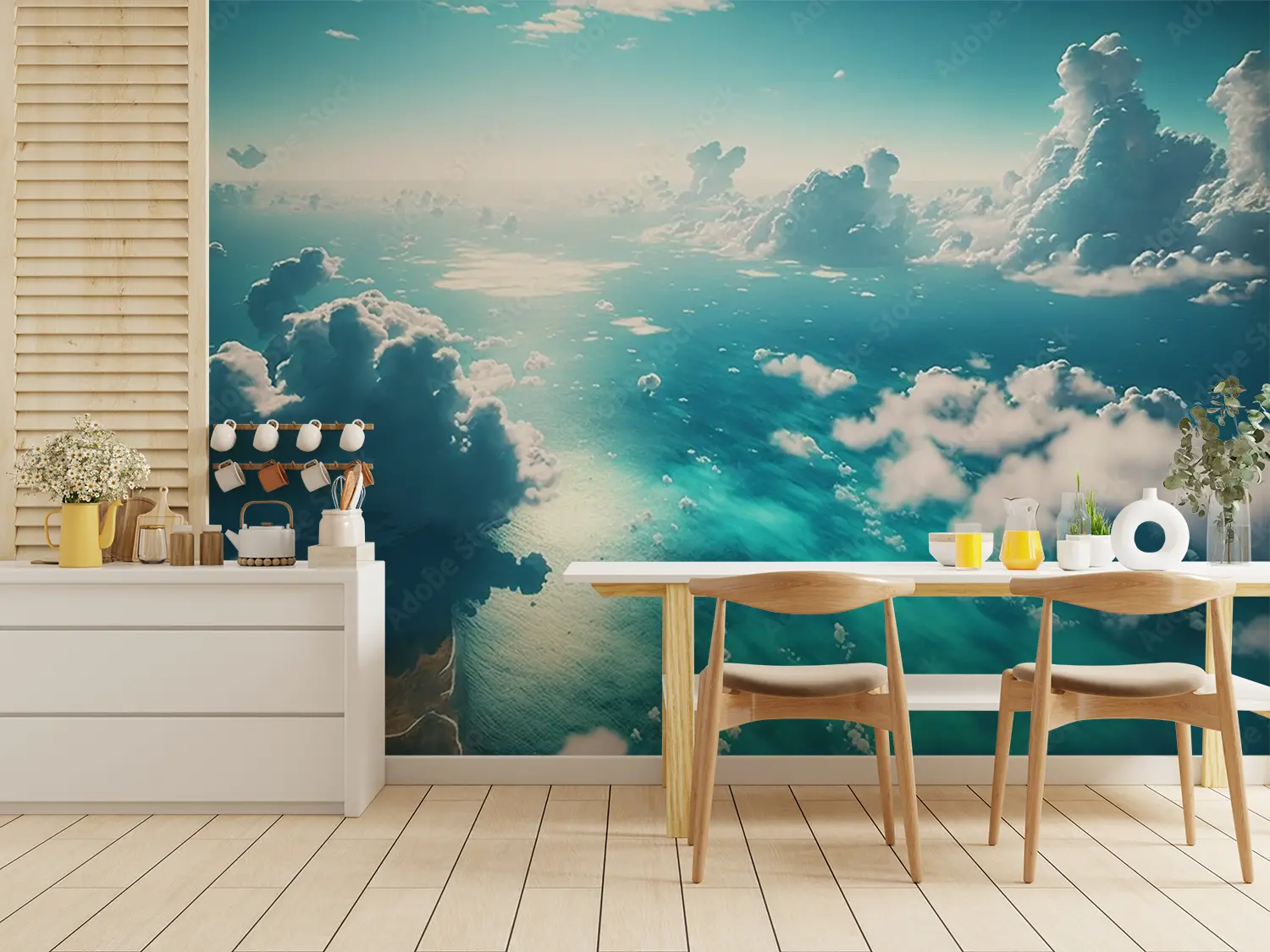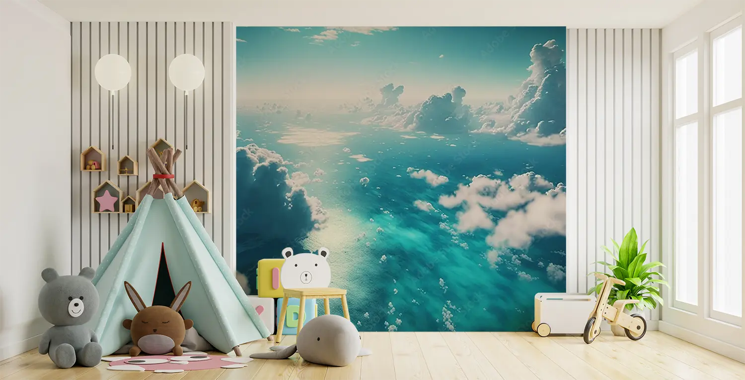 Immerse yourself in the tranquil beauty of the ocean with this stunning wall art. The calming shades of blue and white will bring a sense of peace and serenity to any room. Enhance your home decor with this captivating view of the ocean from an airplane, adding a touch of nature's beauty to your space. Complementary colors include shades of aqua, teal, and soft grey.
