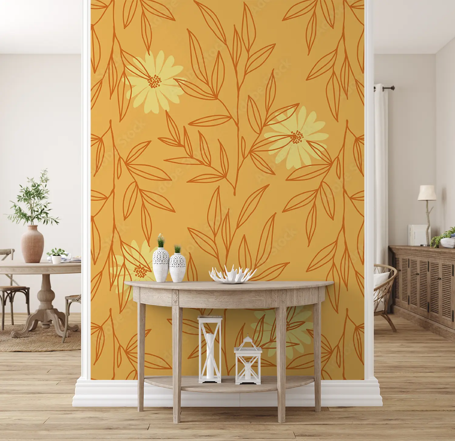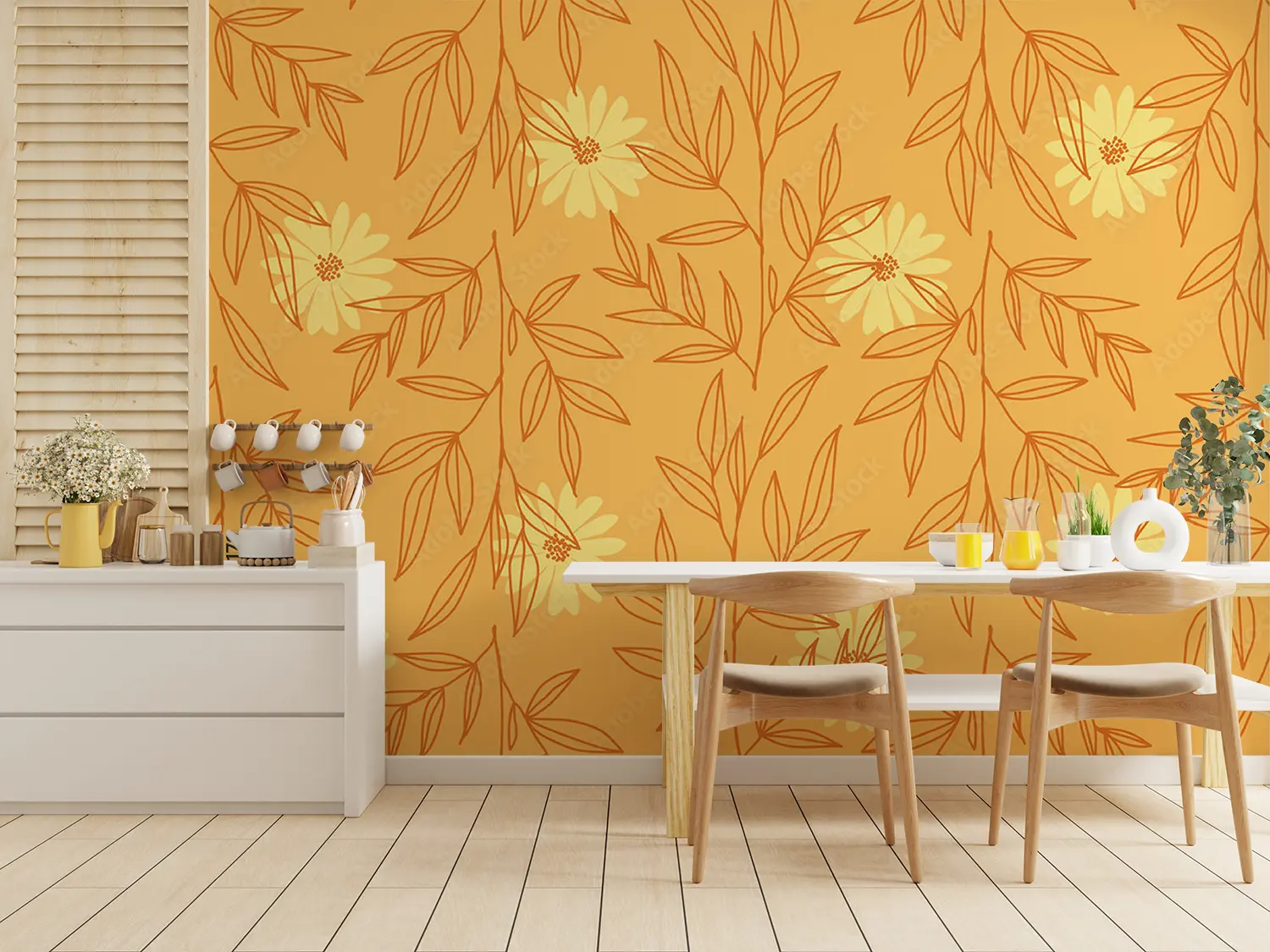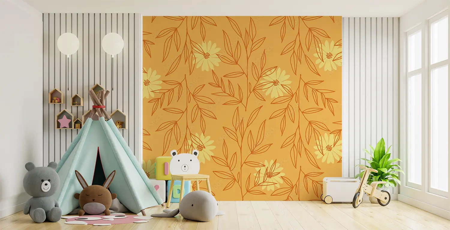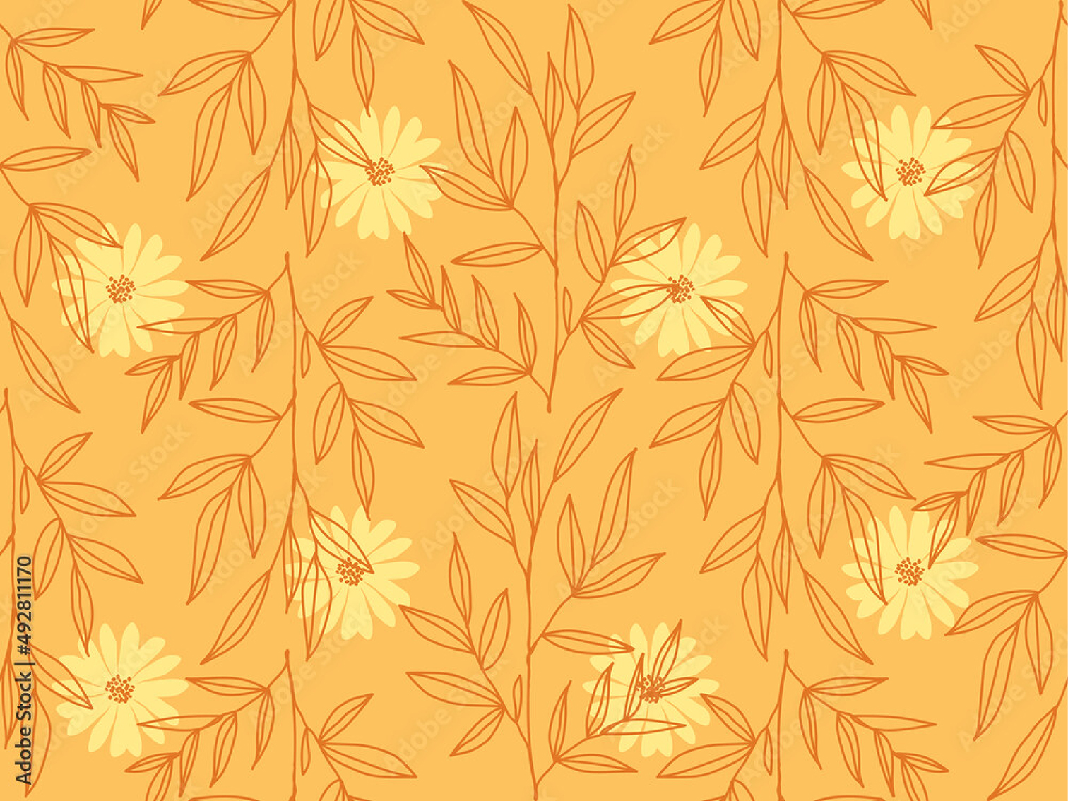 A vibrant and intricate pattern featuring yellow flowers and leaves. This hand-drawn design resembles wrapping paper or fabric and would make a beautiful illustration.
