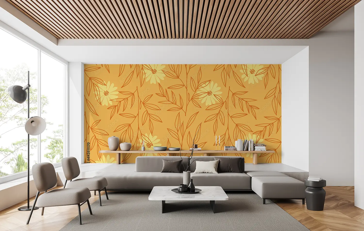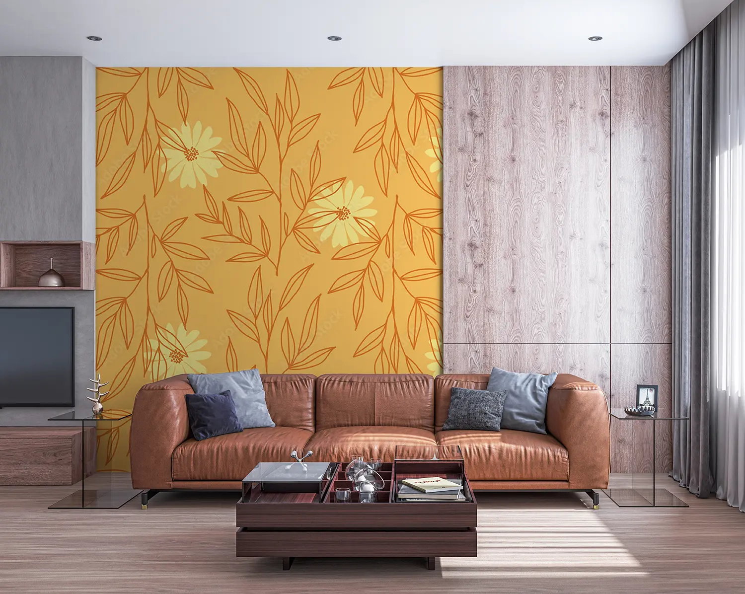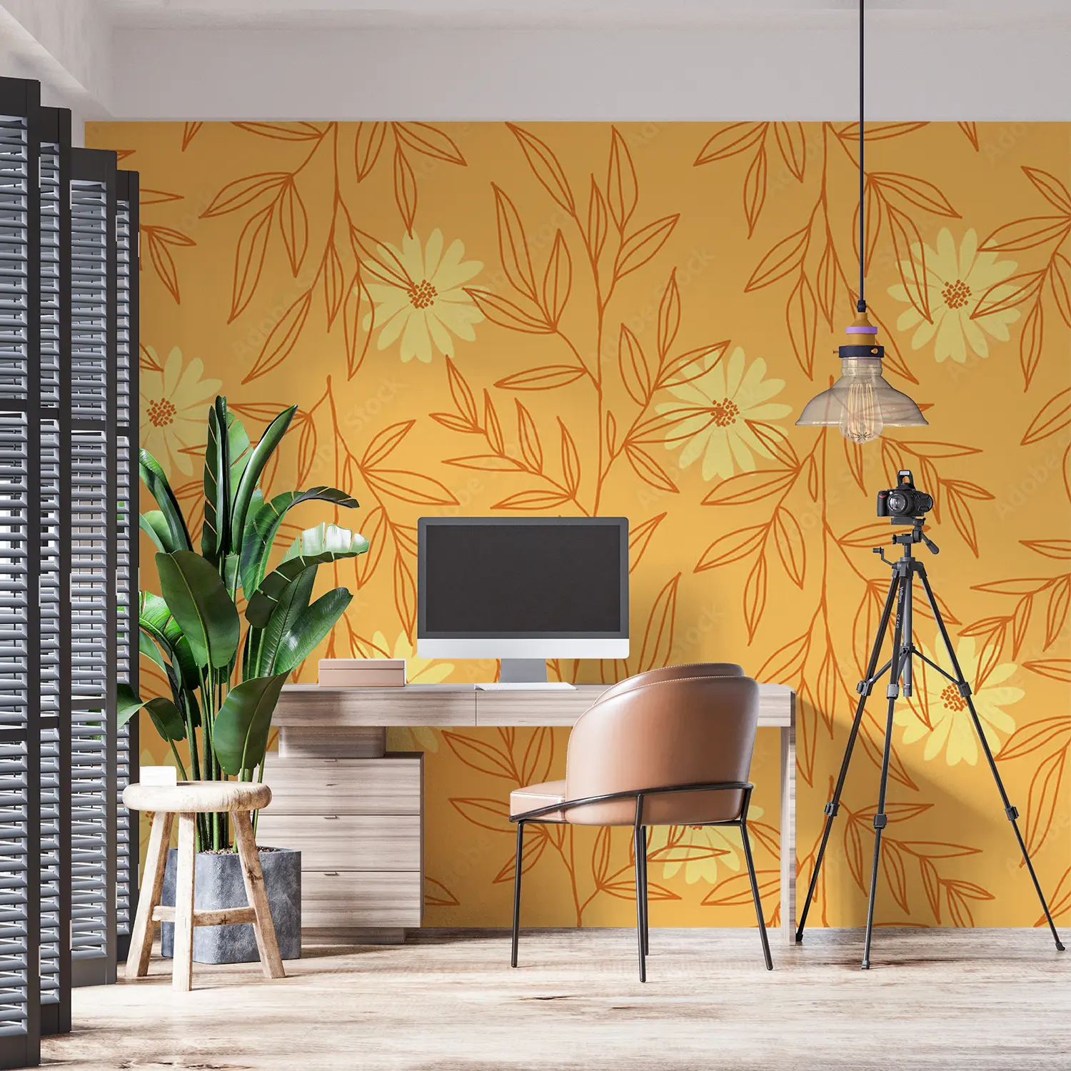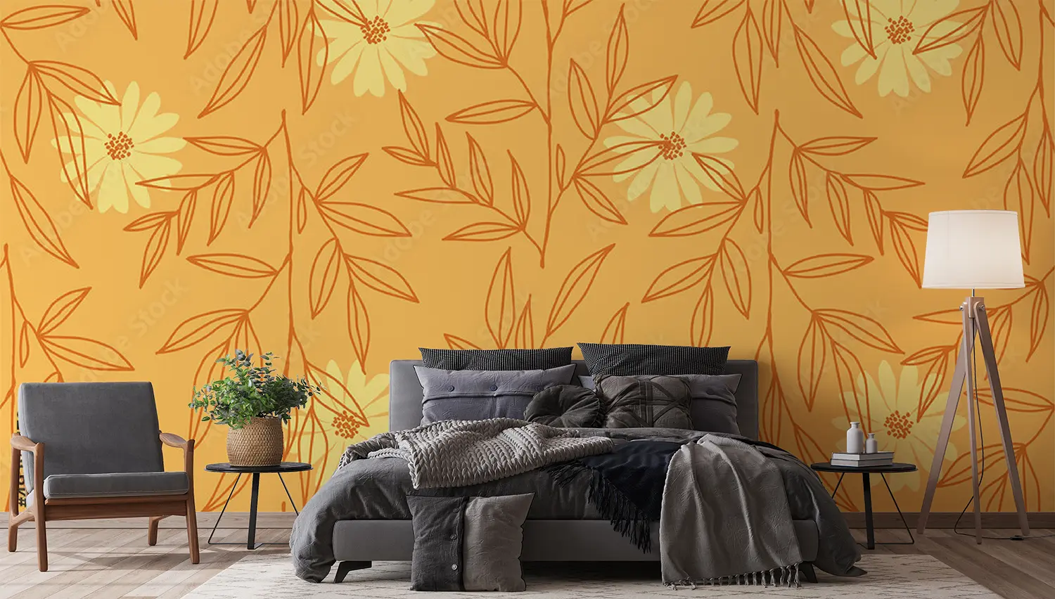 A vibrant and intricate pattern featuring yellow flowers and leaves. This hand-drawn design resembles wrapping paper or fabric and would make a beautiful illustration.