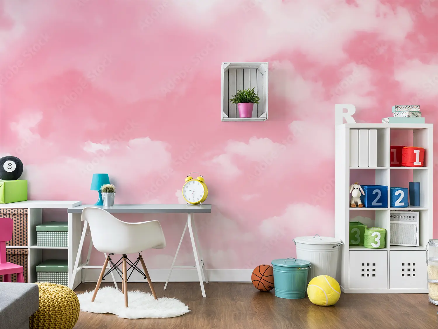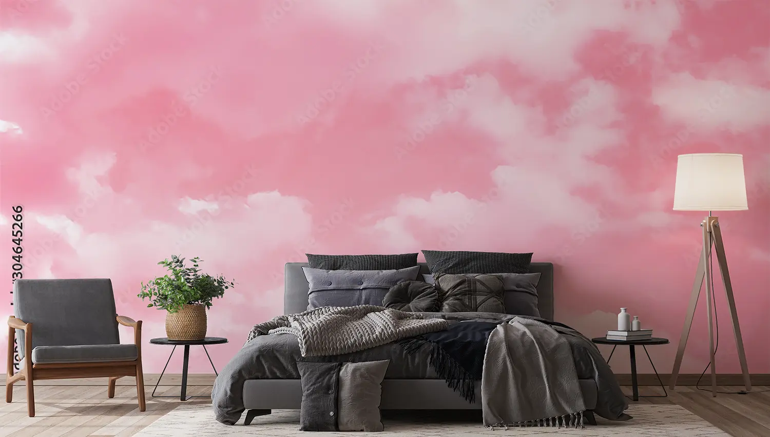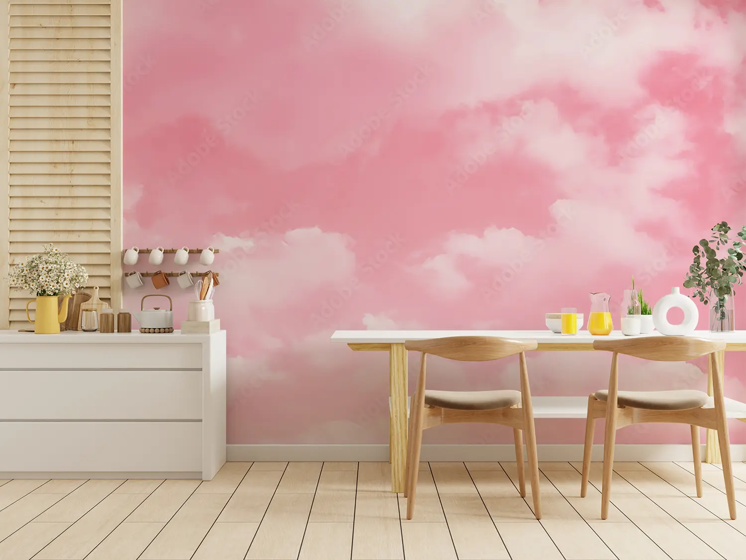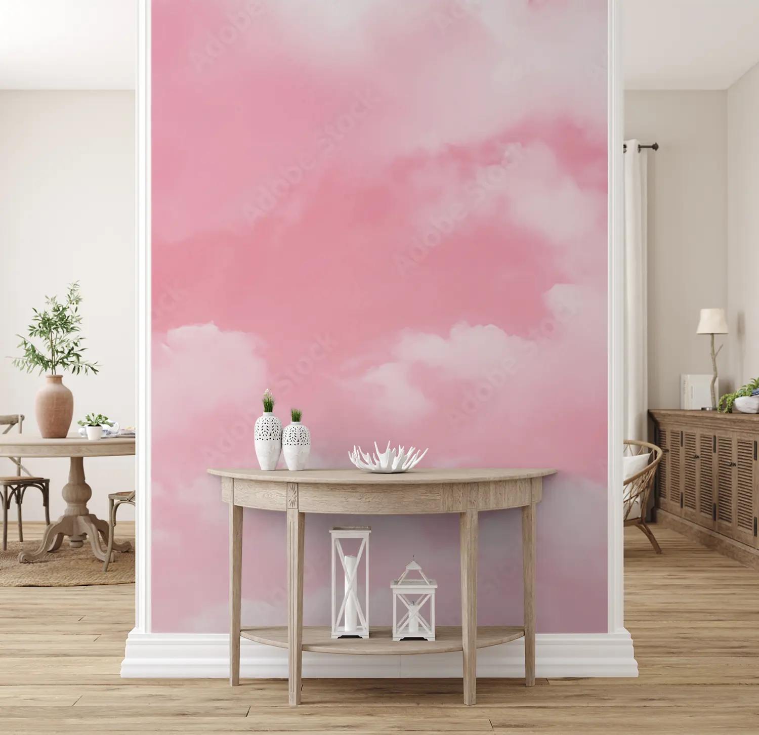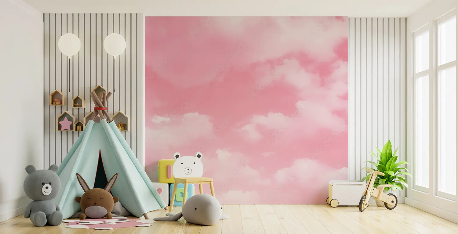 Transform your space with this stunning wall art featuring a dreamy pink sky with fluffy clouds and a plane. The serene and whimsical aesthetic will elevate your home decor, creating a tranquil atmosphere. Complementary colors to consider for accents include soft pastels like lavender, mint green, and baby blue, enhancing the overall calming ambiance of the room.