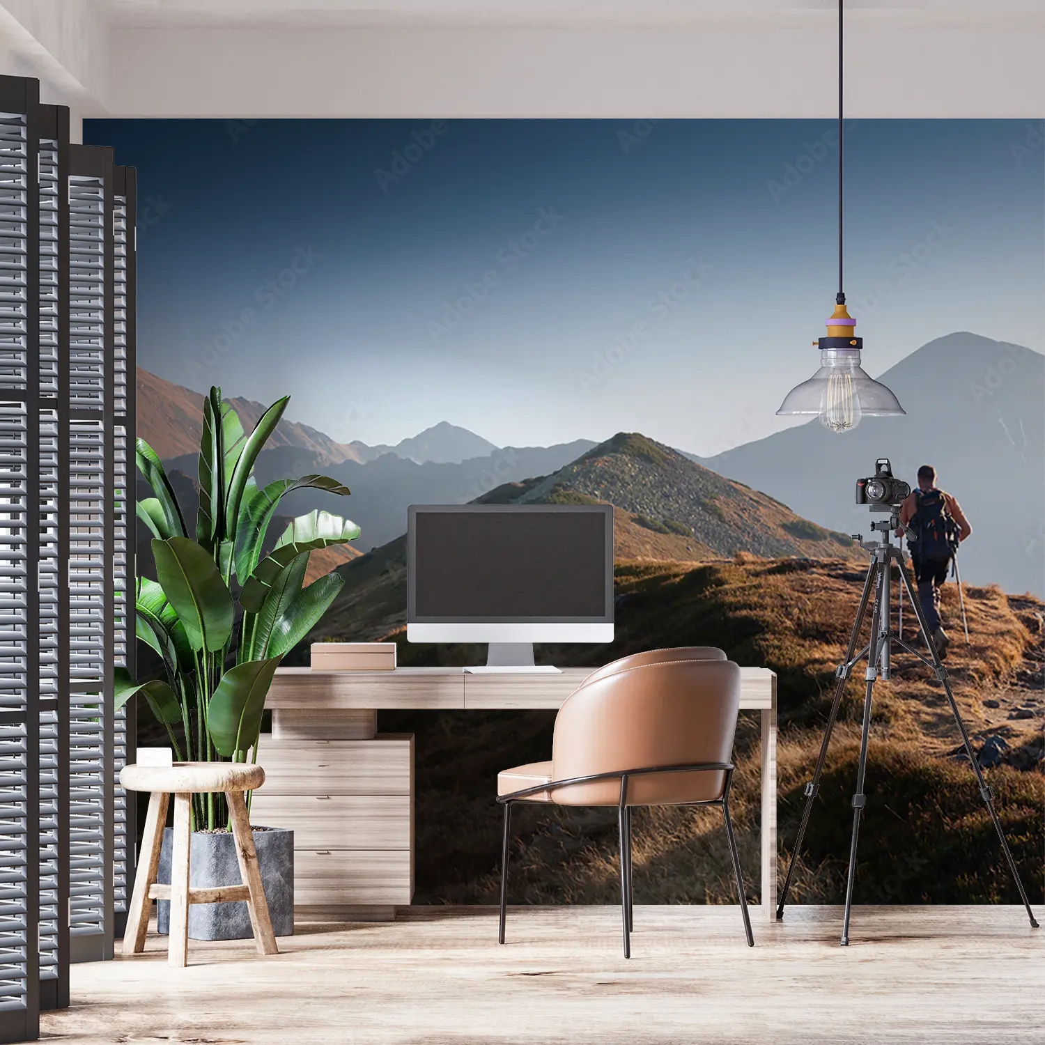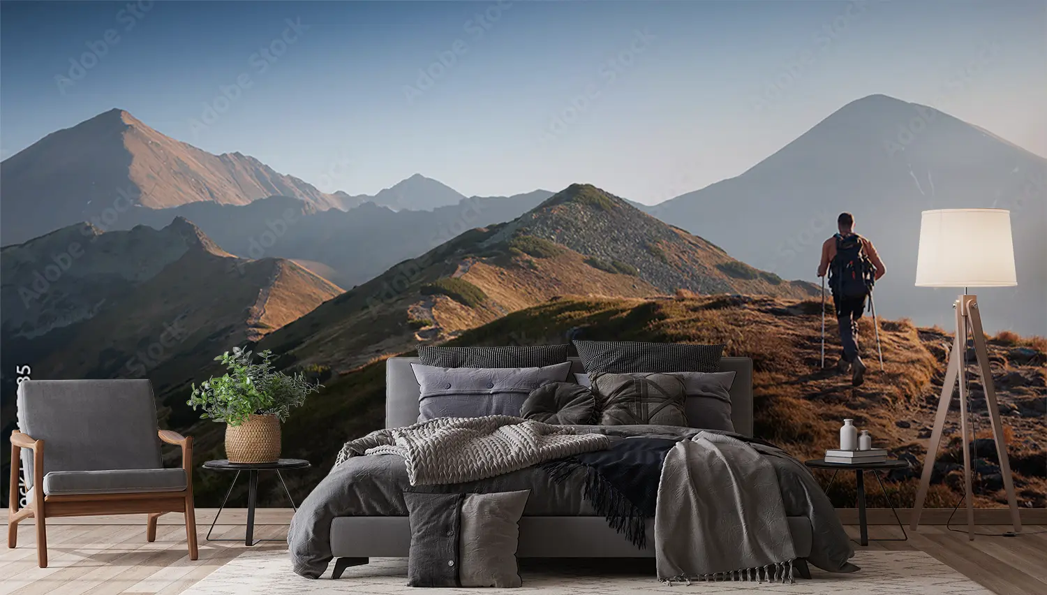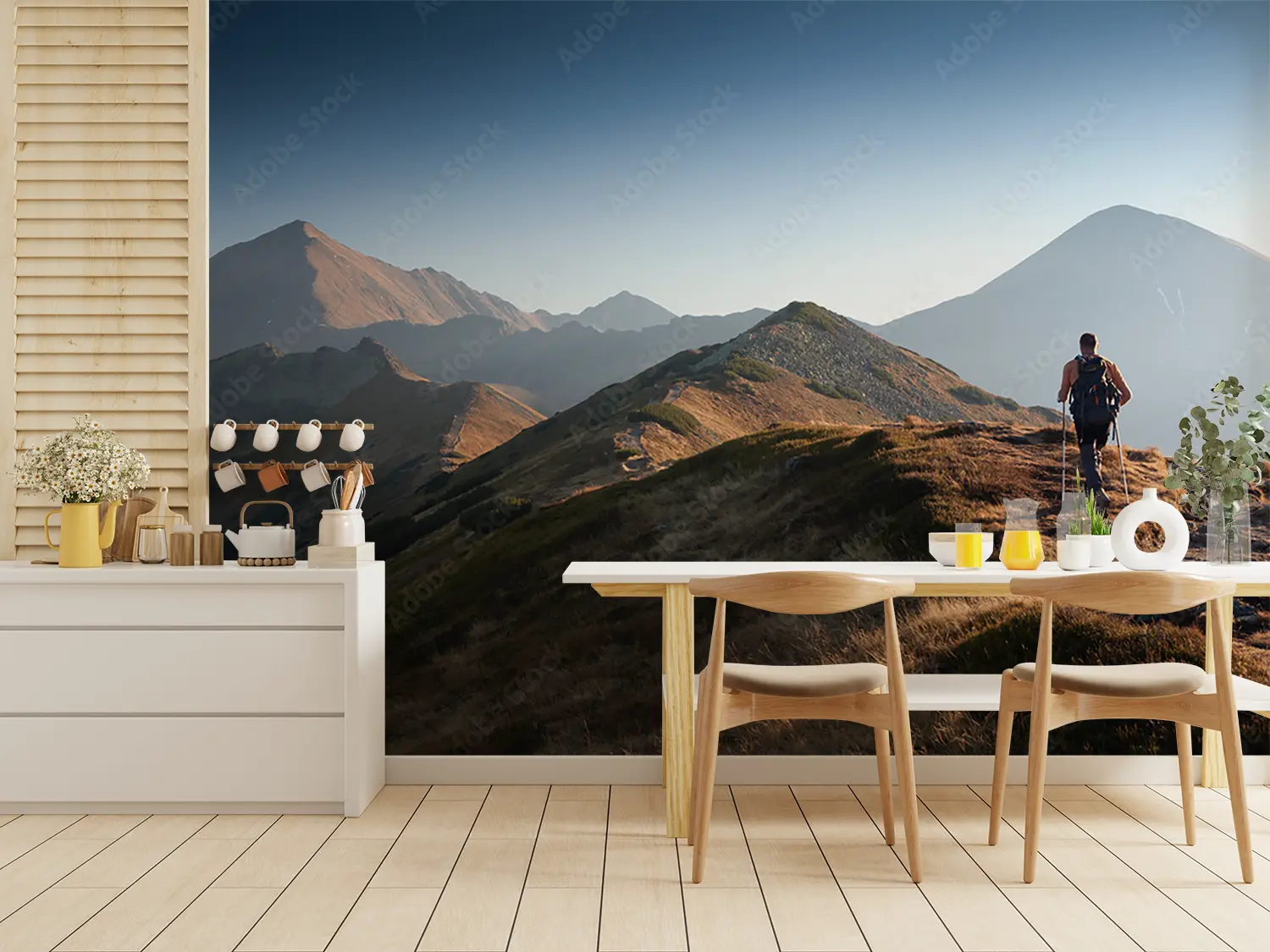 Transform your space with this captivating wall art featuring a man trekking up a picturesque mountain accompanied by his loyal dog. The serene color palette of soft blues, earthy browns, and crisp whites will bring a touch of nature's beauty into your home decor. Perfect for adding a sense of adventure and tranquility to any room.