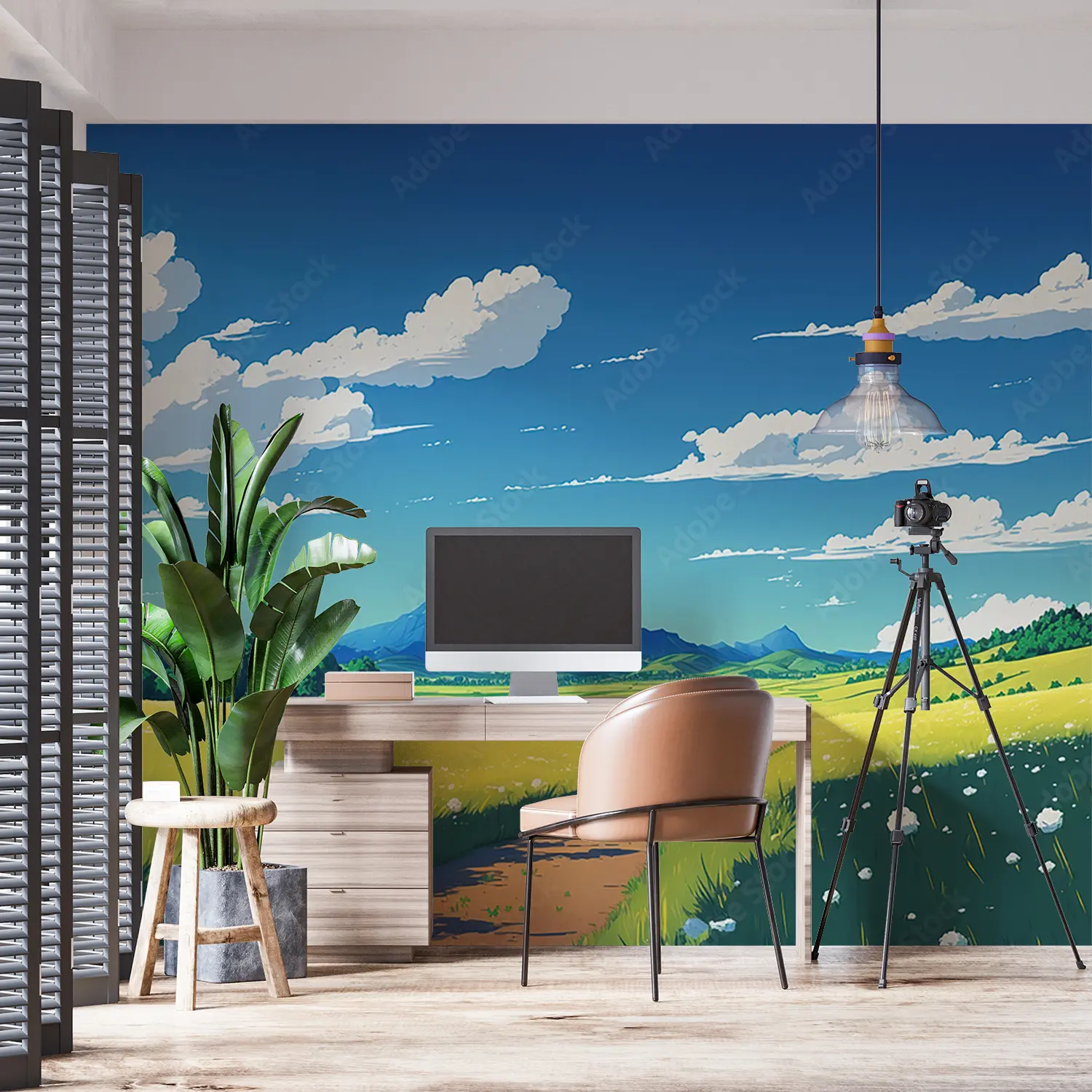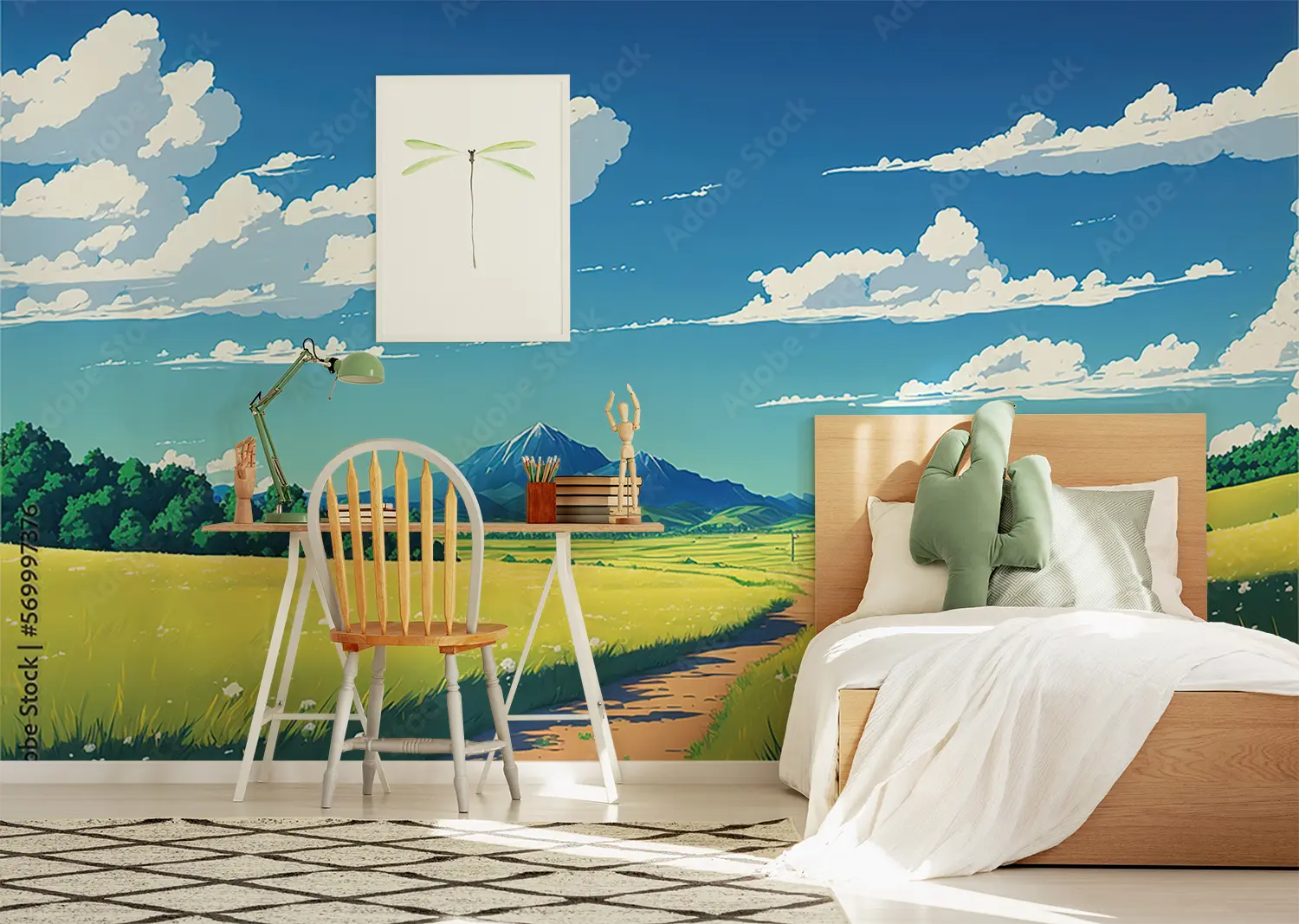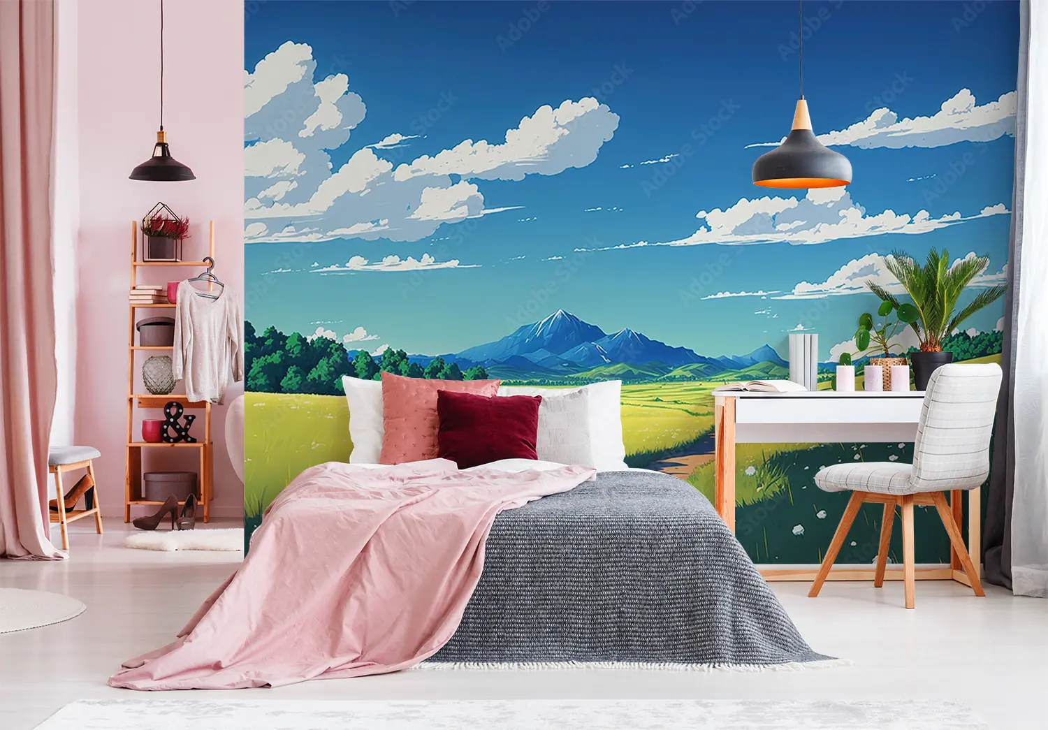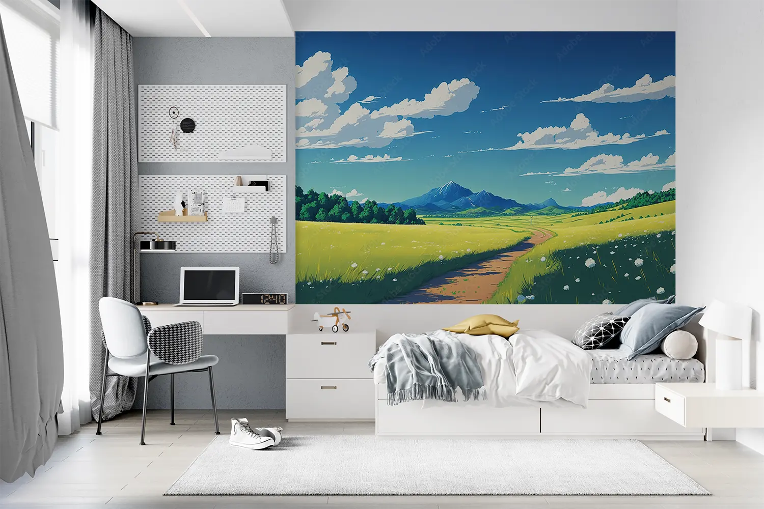 Transform your space with this captivating wall art featuring a picturesque scene of a road winding through a lush green field with a majestic mountain backdrop. Enhance your home decor with this serene and visually stunning piece. Complementary colors to consider are shades of blue, green, and earth tones to bring out the beauty of the landscape.