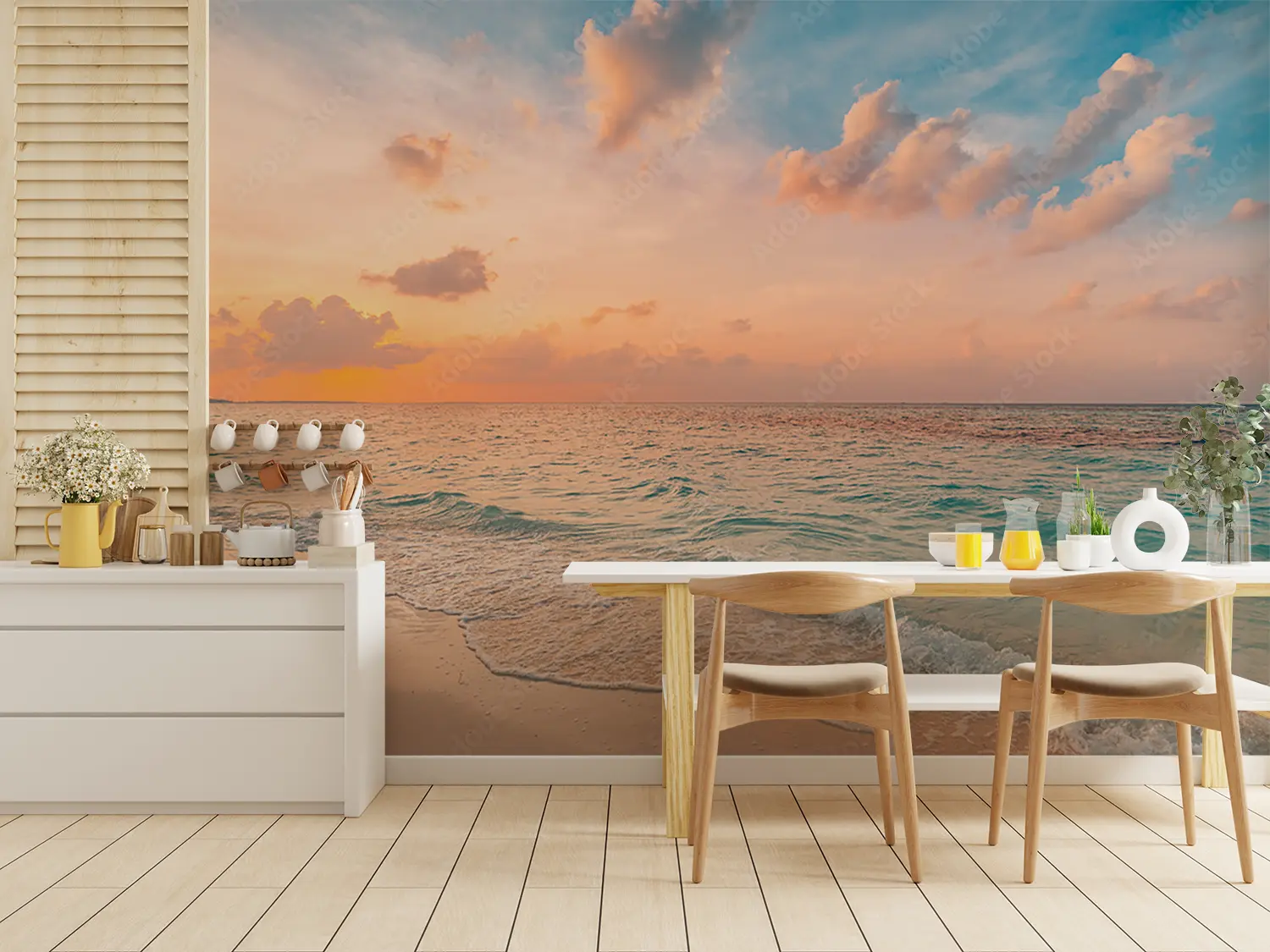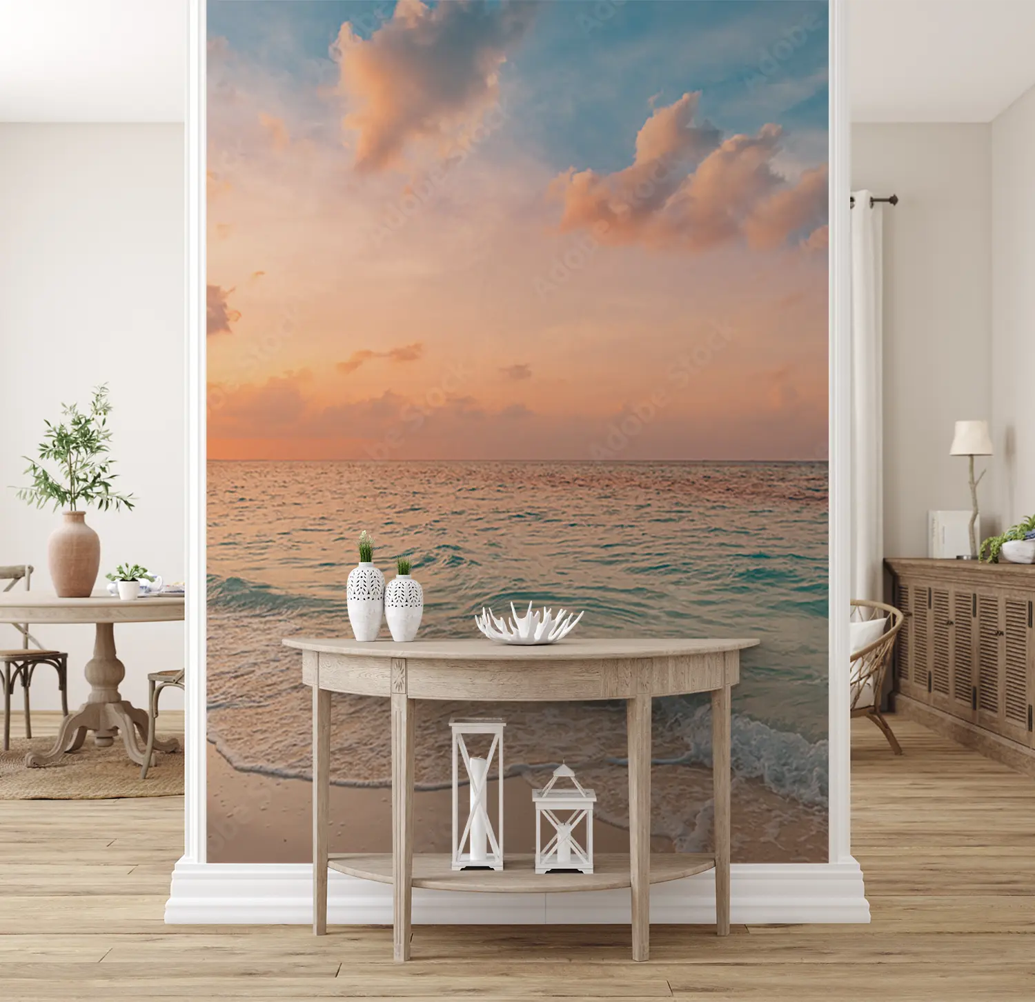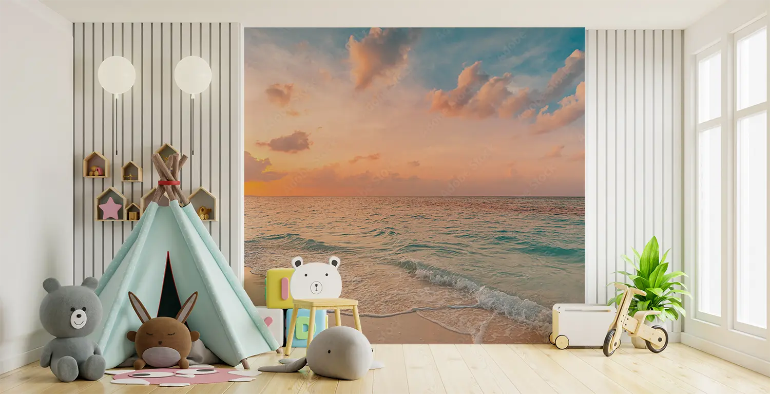 Transform your space with this captivating wall art featuring a serene beach scene at sunset. The warm hues of the sky and calming waves crashing onto the shore evoke a sense of tranquility and relaxation, ideal for enhancing your home decor. Complementary colors to consider include sandy beige, ocean blue, and sunset orange for a cohesive look.