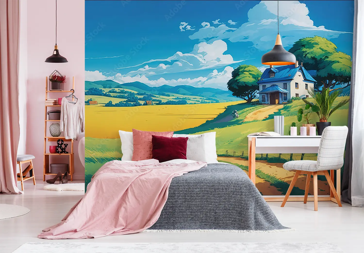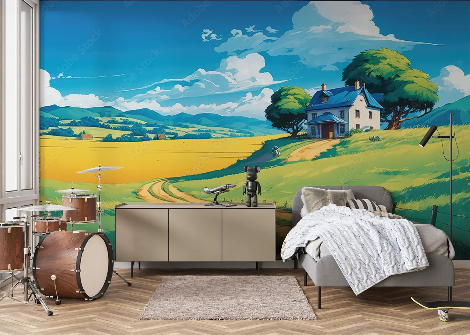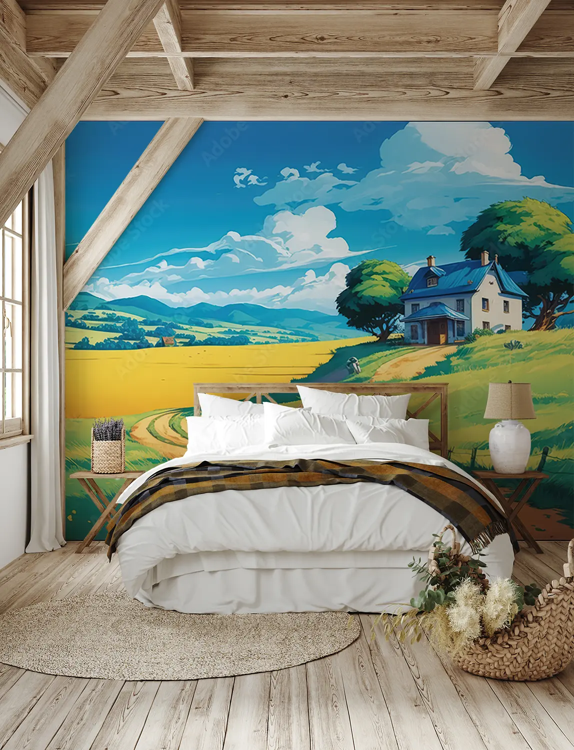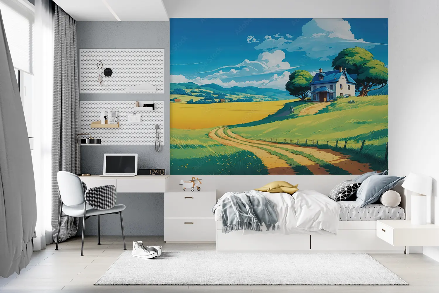 Transform your space with the tranquil beauty of a country road leading to a charming house. This wall art captures the essence of rural landscapes, making it a perfect addition to any home decor. The warm colors of yellow, blue, and green will complement your existing design scheme, creating a cozy and inviting atmosphere in your living space.
