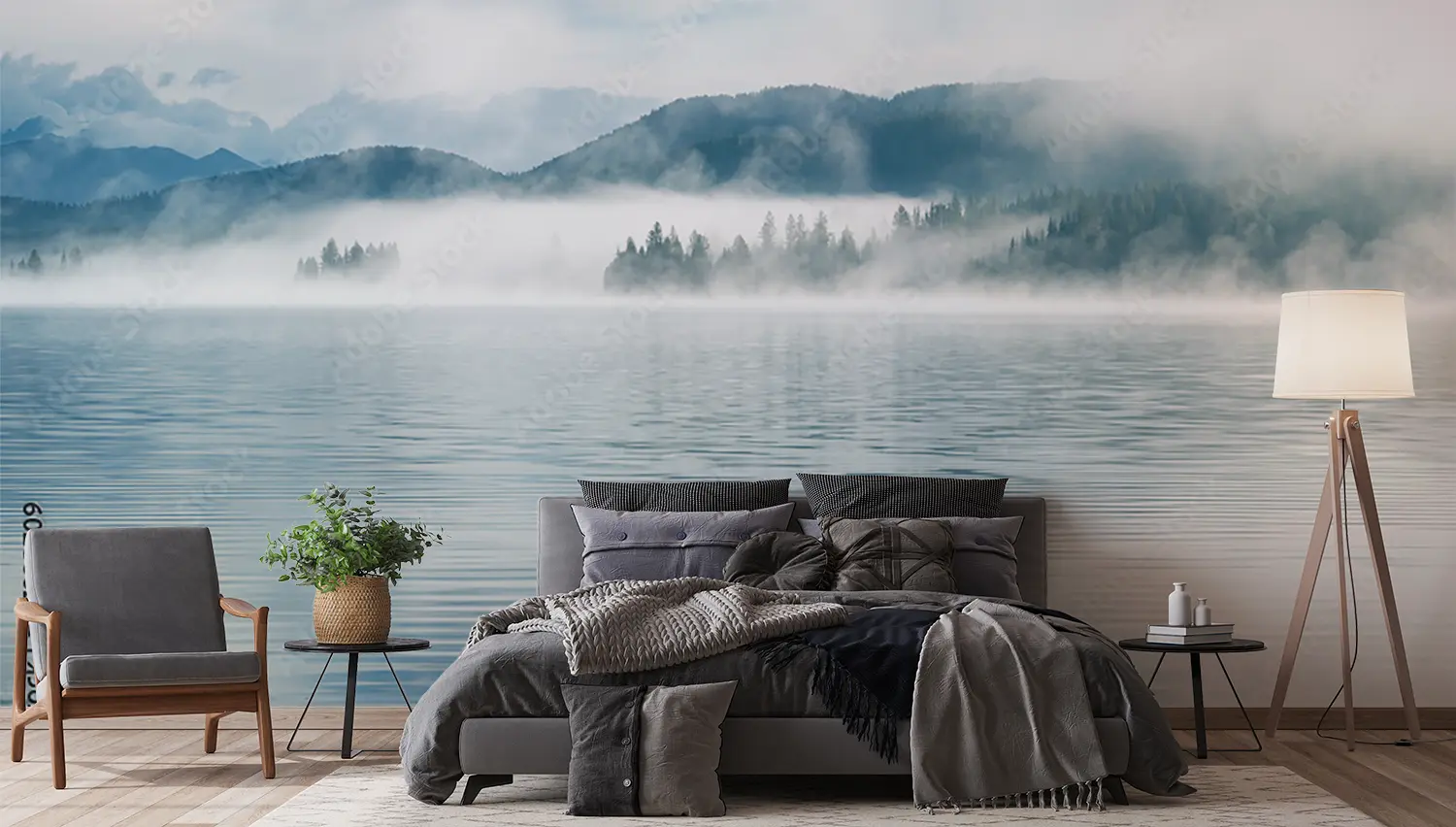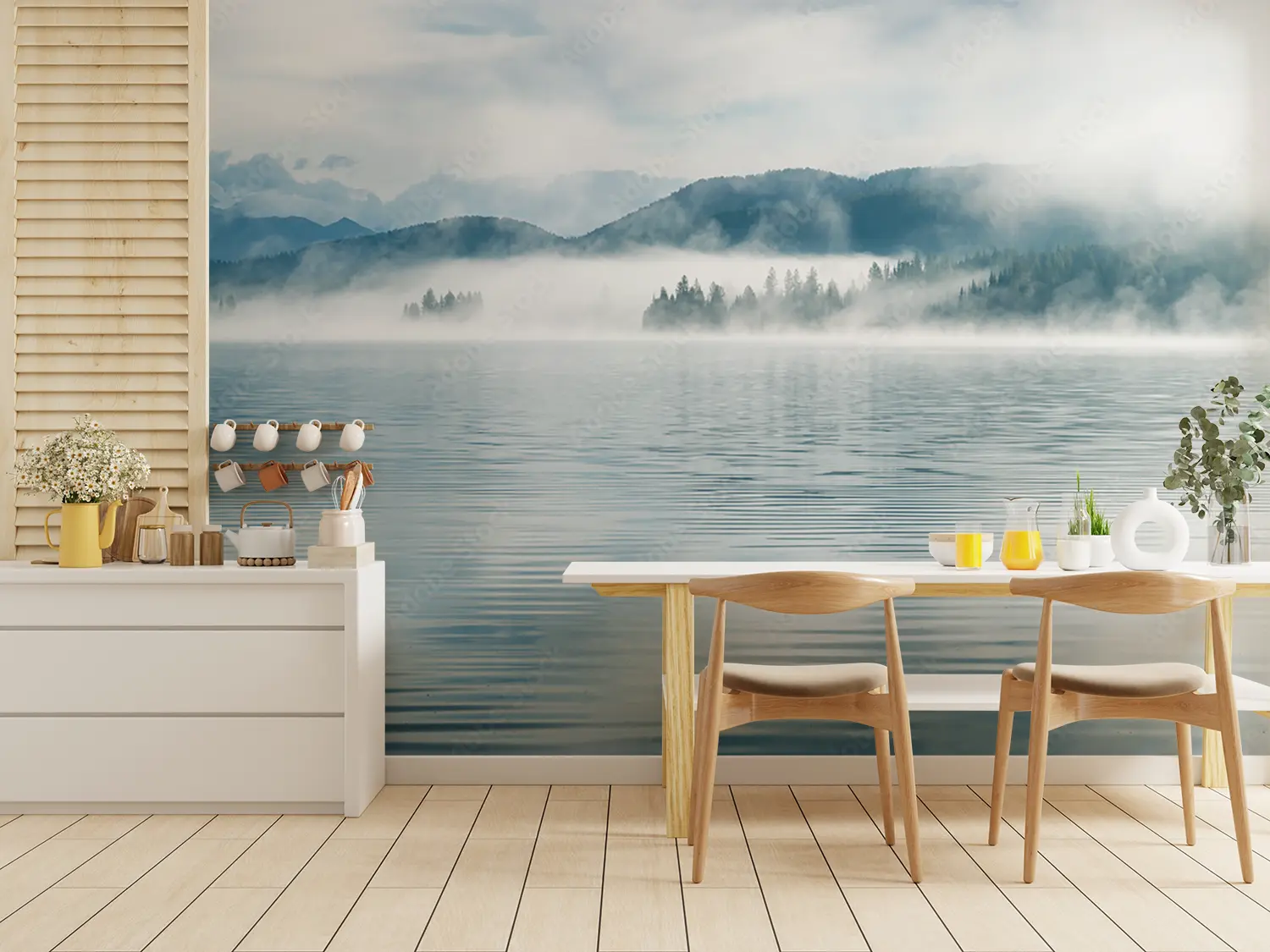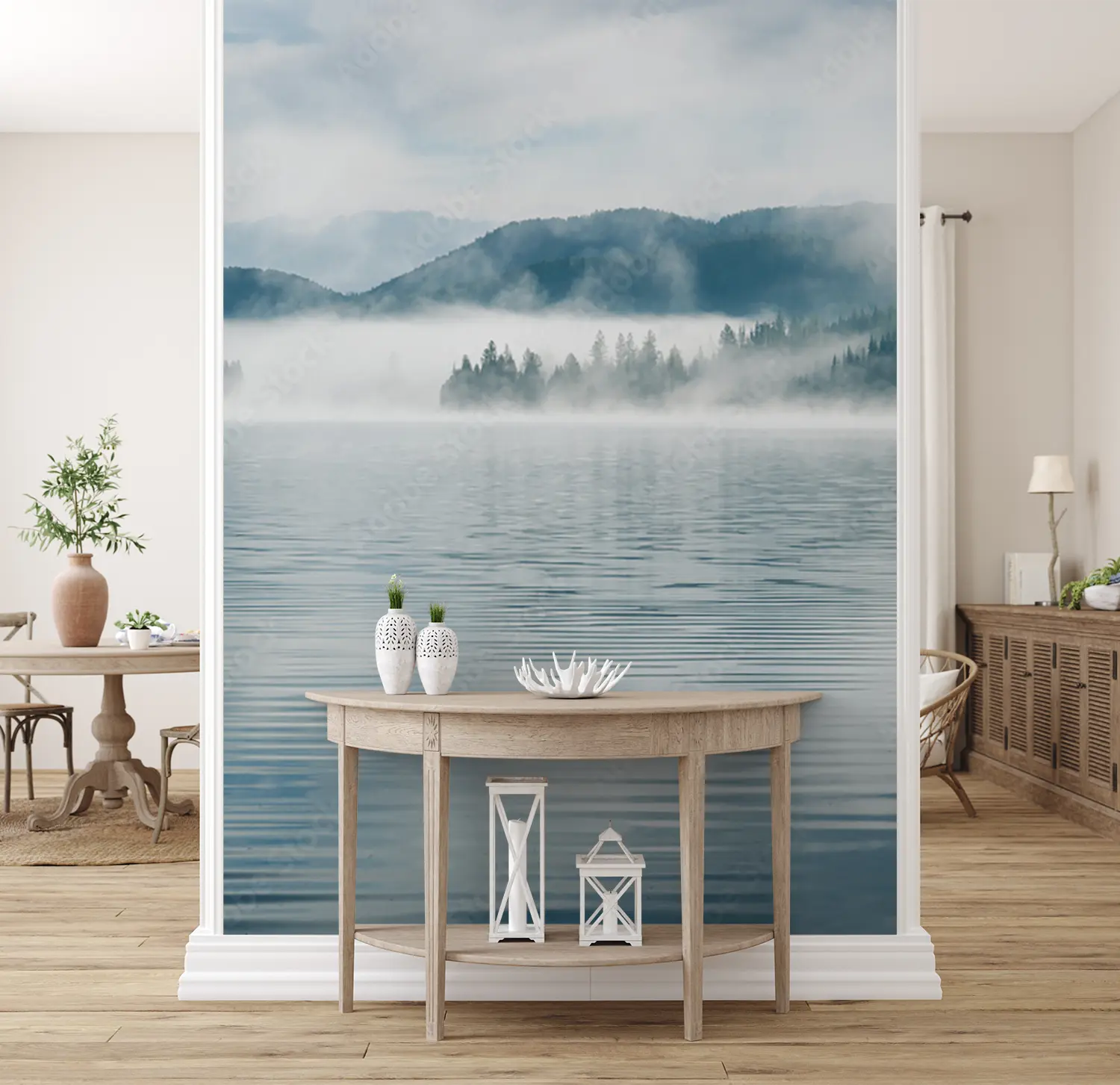 Transform your space with this captivating wall art featuring a peaceful lake enveloped in fog. The misty atmosphere and distant mountain create a tranquil ambiance perfect for any home decor. Complementary colors include shades of blue, grey, and white to enhance the soothing aesthetic of this stunning piece. (65 words)