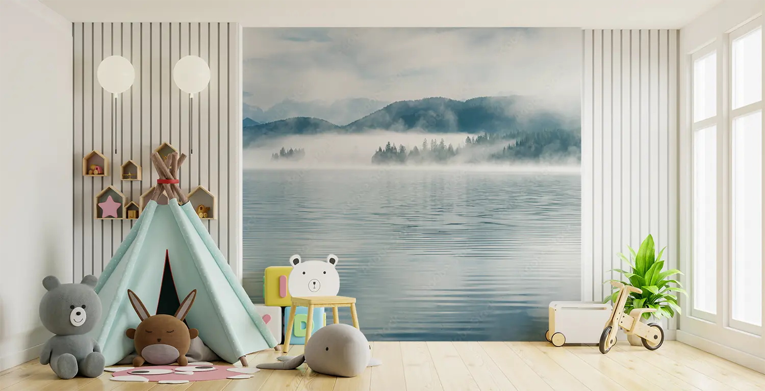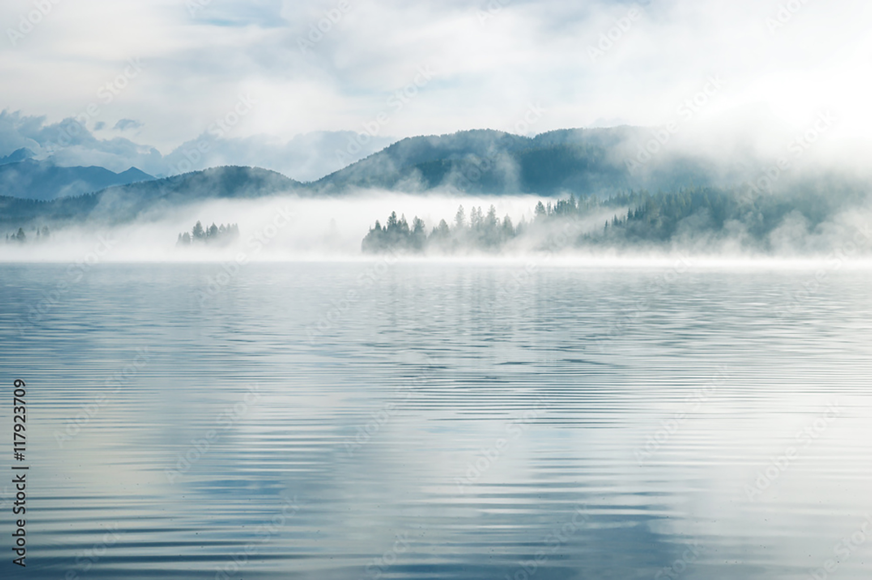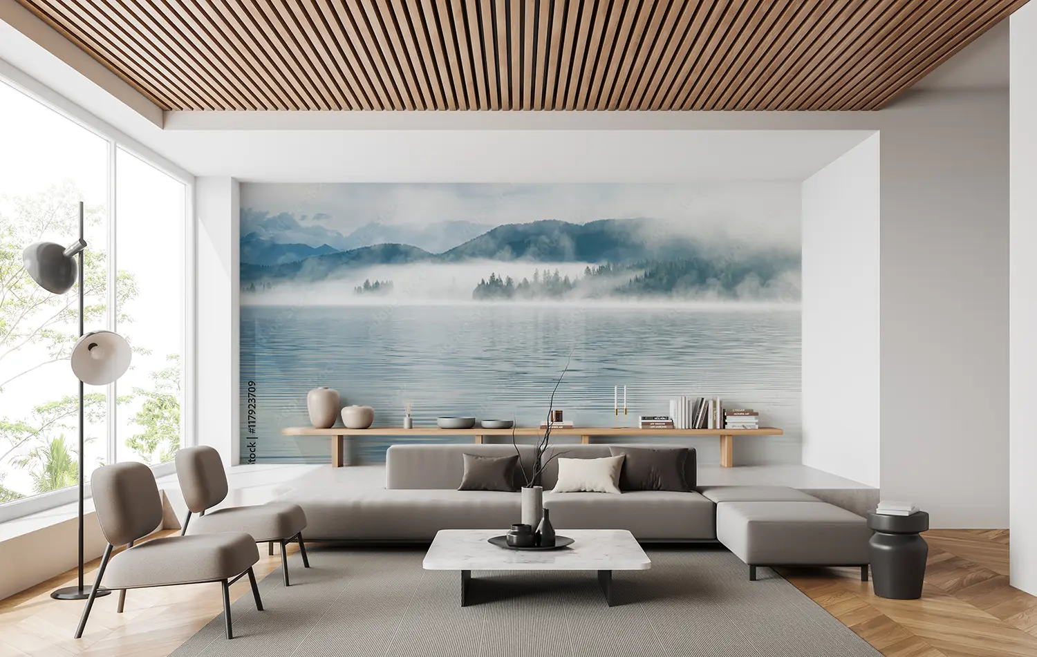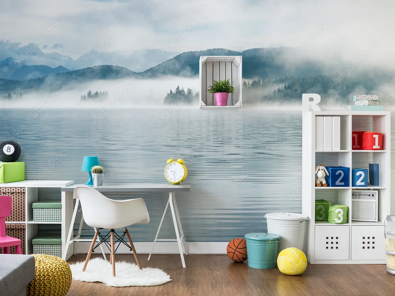 Transform your space with this captivating wall art featuring a peaceful lake enveloped in fog. The misty atmosphere and distant mountain create a tranquil ambiance perfect for any home decor. Complementary colors include shades of blue, grey, and white to enhance the soothing aesthetic of this stunning piece. (65 words)