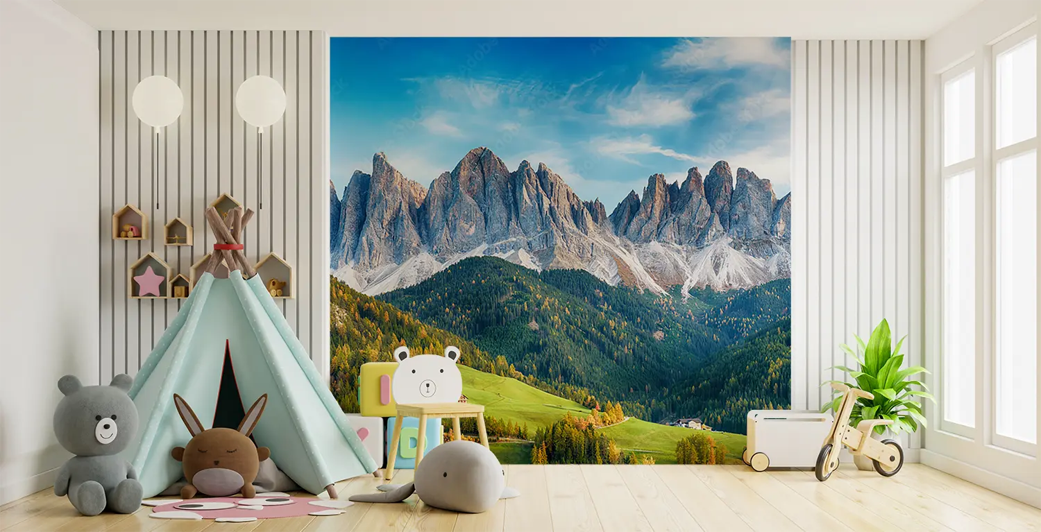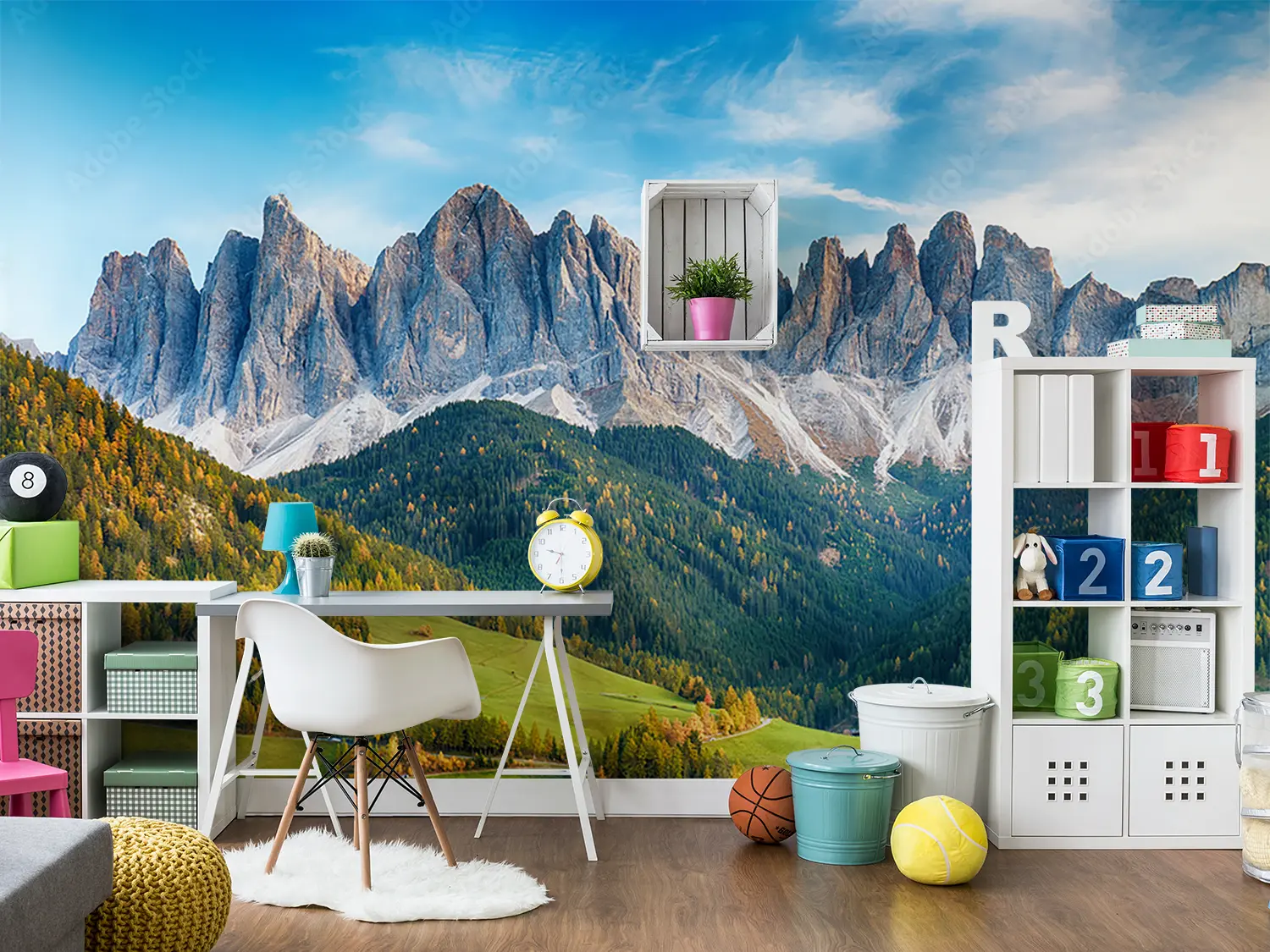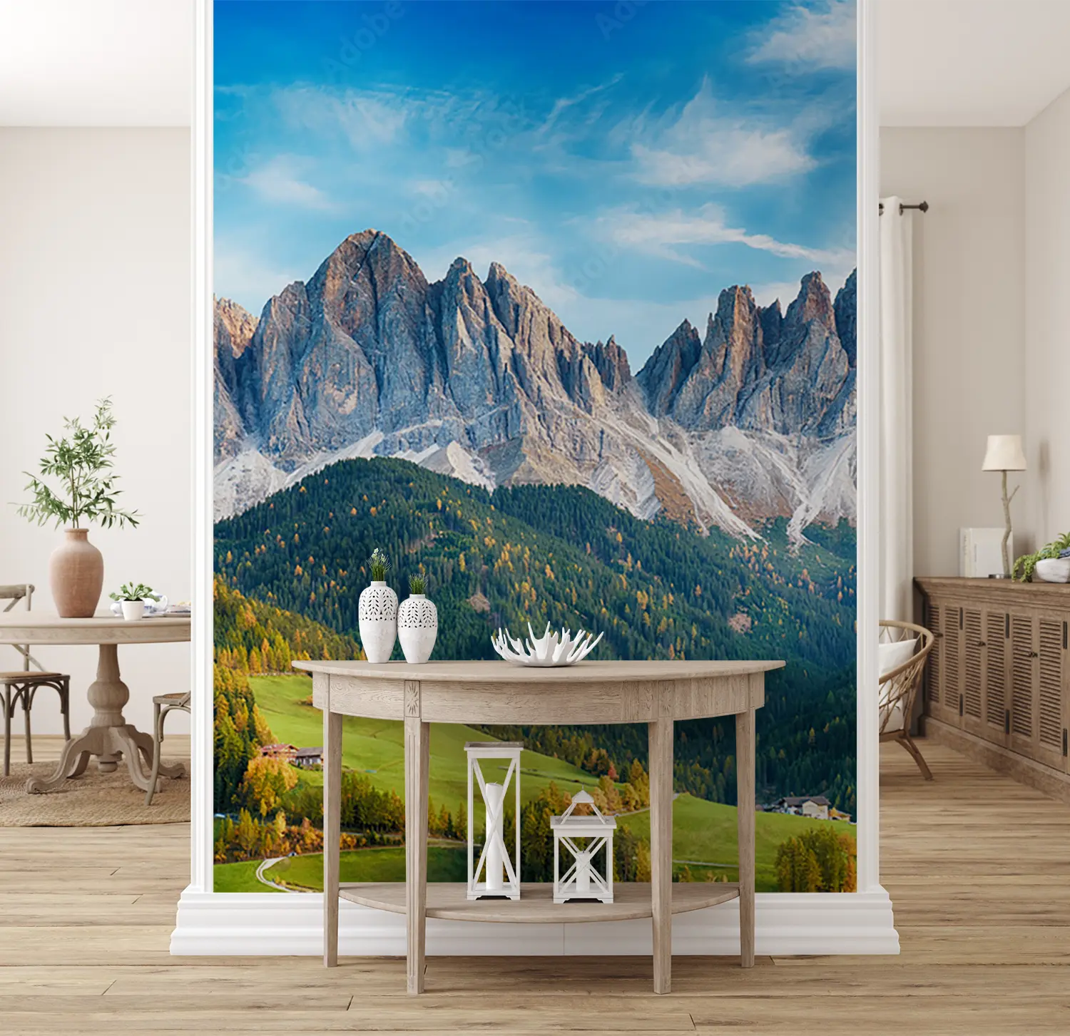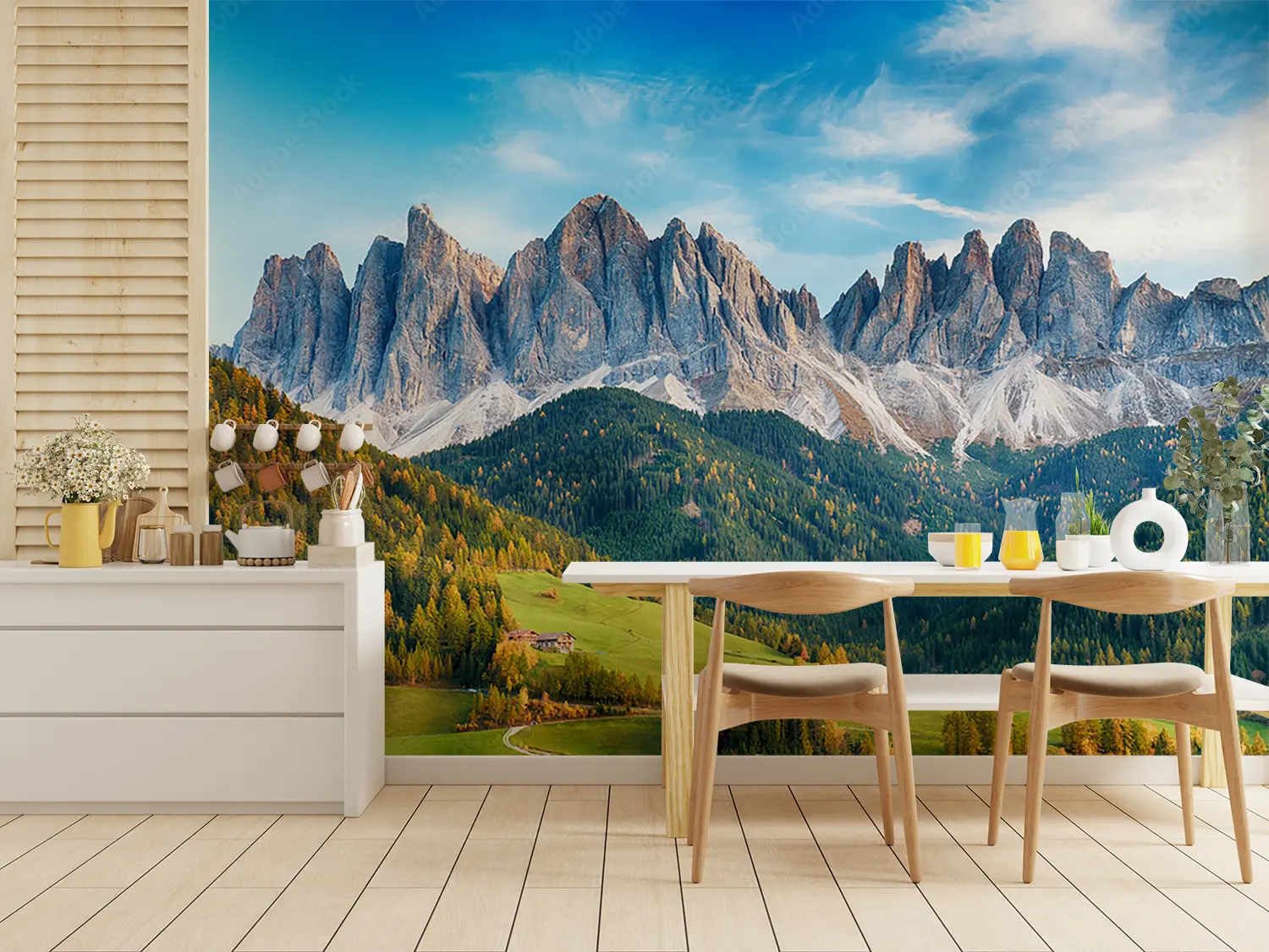 Transform your home with this captivating mountain range scene featuring charming houses nestled amidst lush trees. This breathtaking mural exudes tranquility and adds a touch of nature to your decor. The soothing color palette of blue, green, and gold will create a peaceful ambiance in any room, making it a perfect addition to your home.