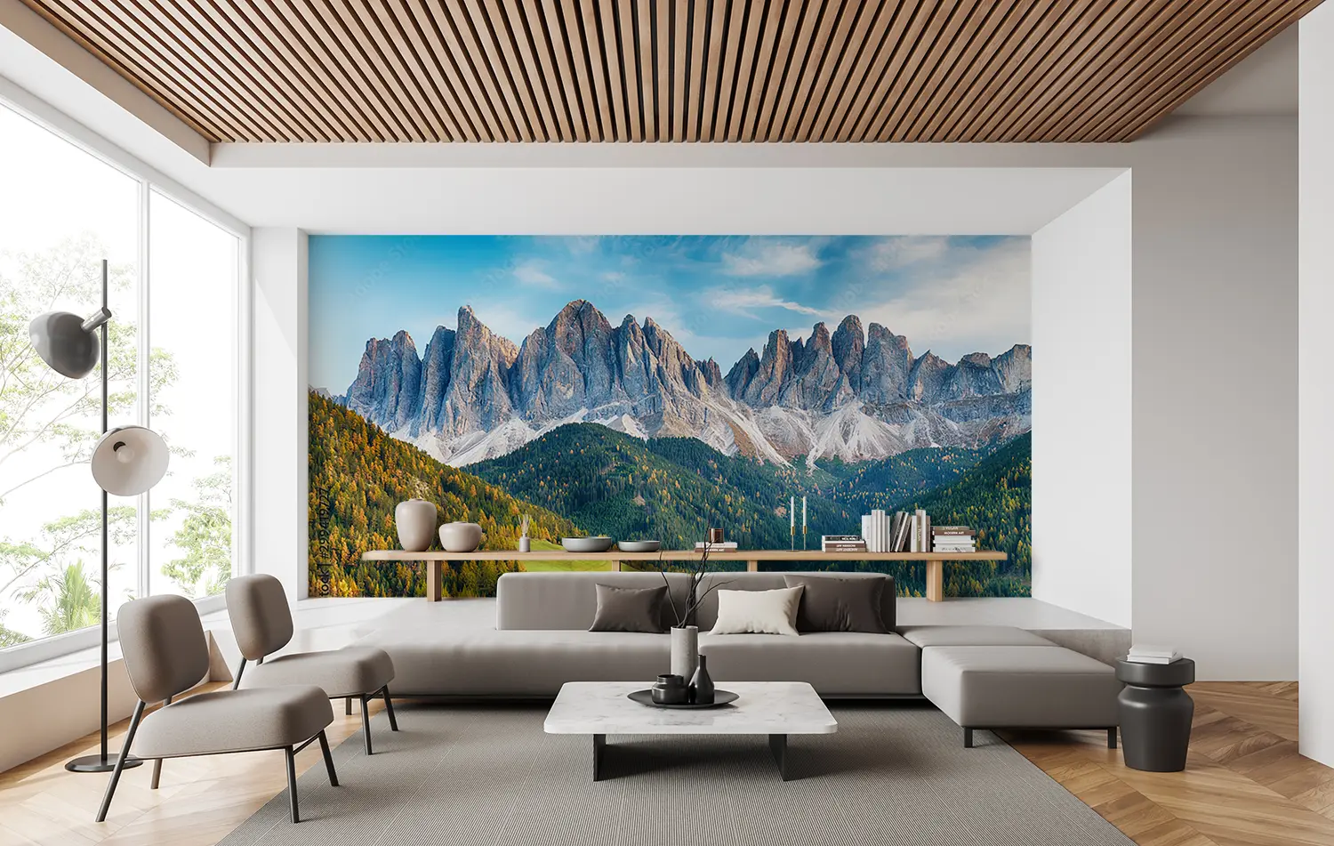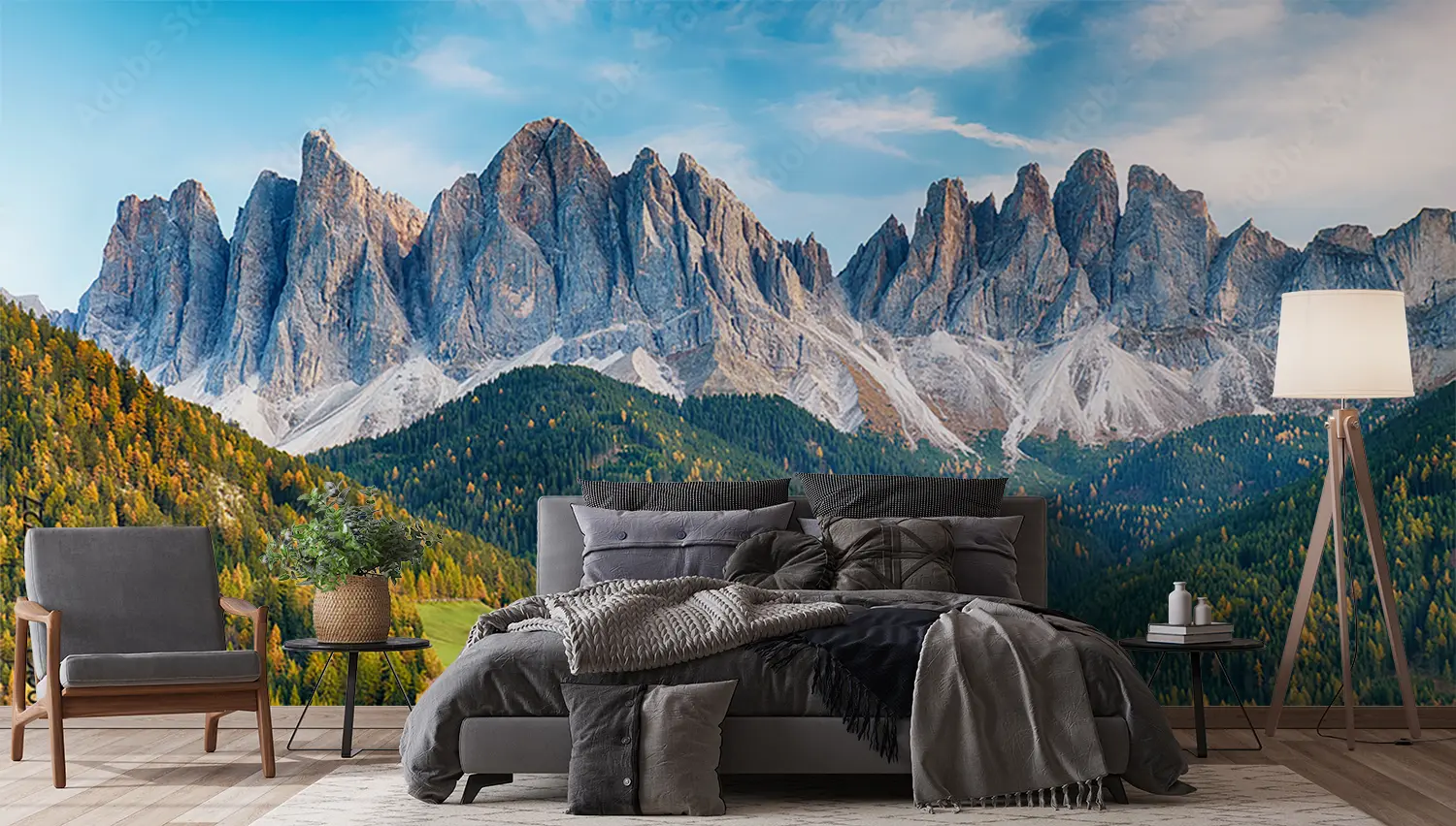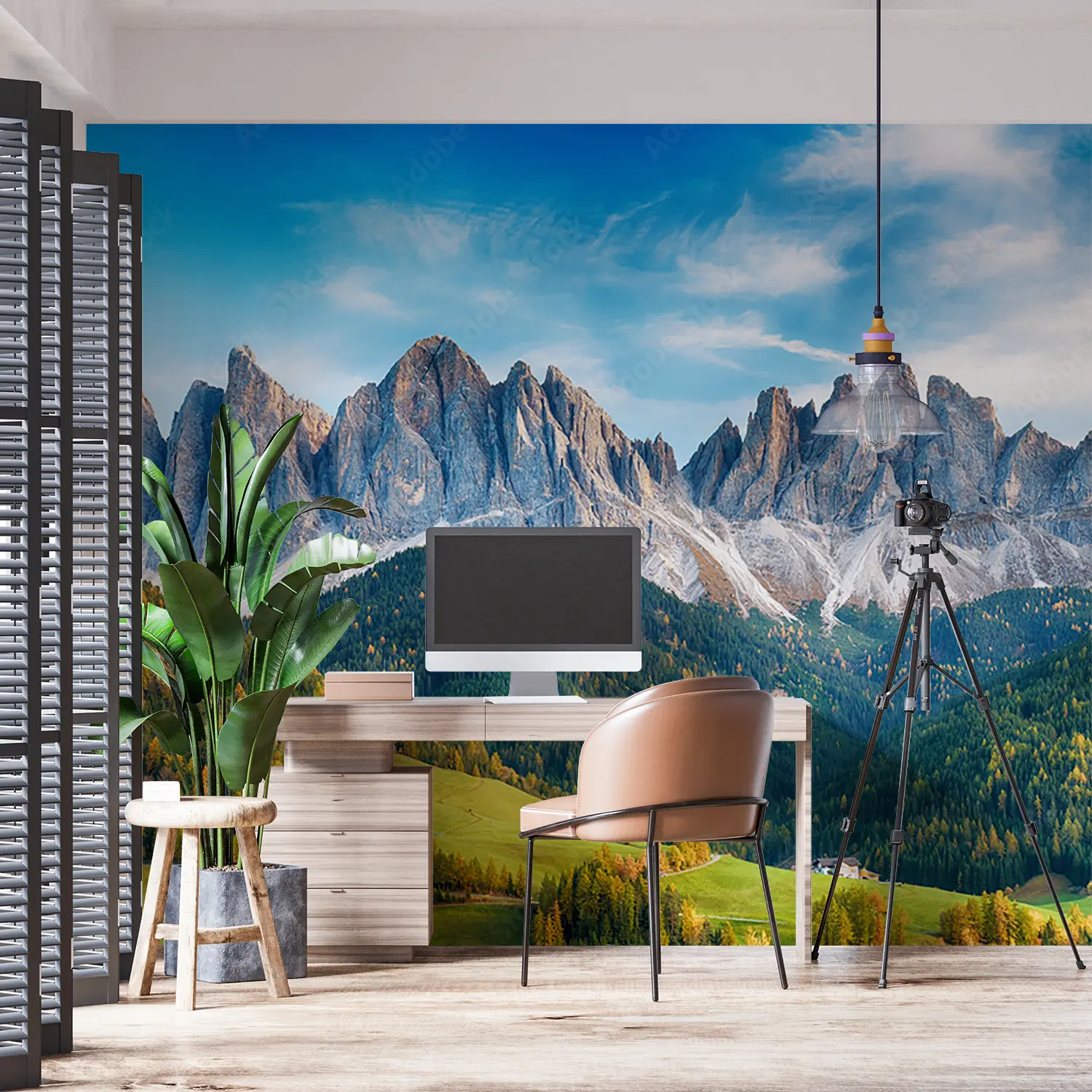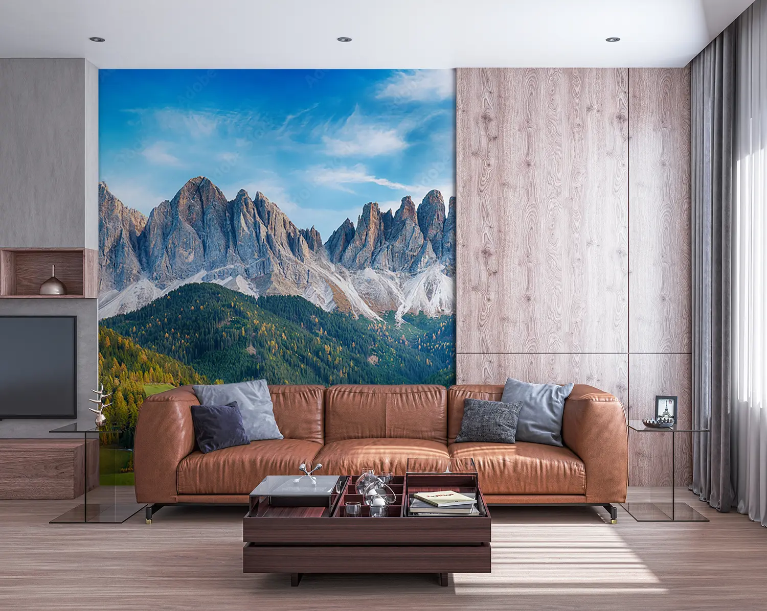 Transform your home with this captivating mountain range scene featuring charming houses nestled amidst lush trees. This breathtaking mural exudes tranquility and adds a touch of nature to your decor. The soothing color palette of blue, green, and gold will create a peaceful ambiance in any room, making it a perfect addition to your home.