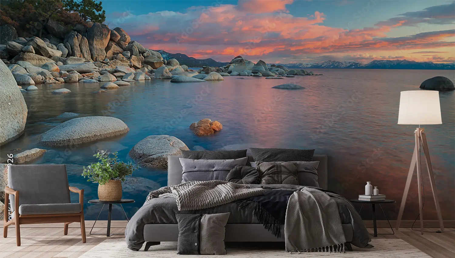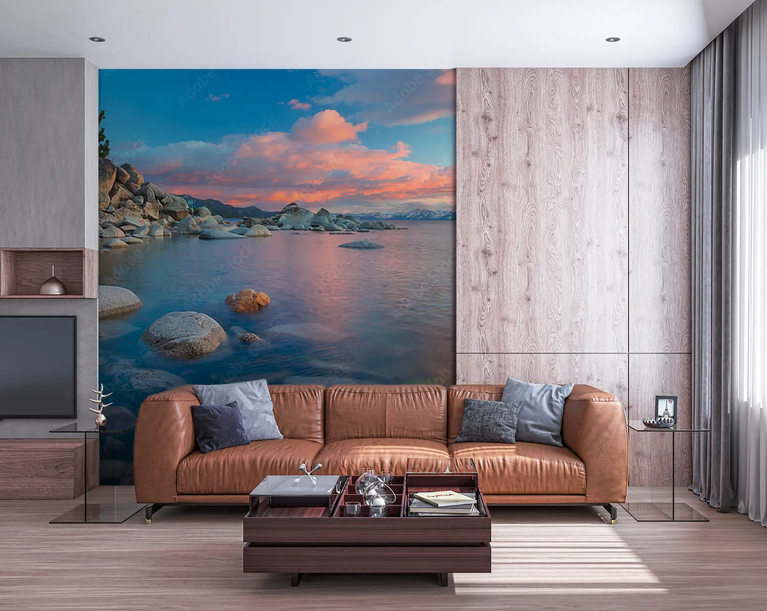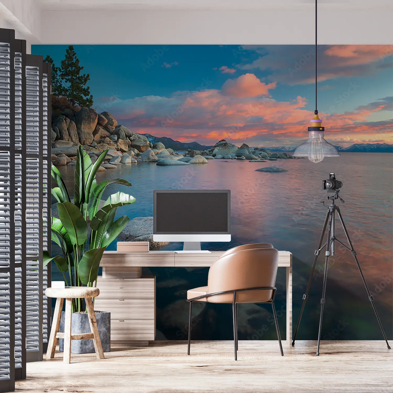 Transform your space with this captivating wall art featuring a tranquil lake scene at sunset, complete with rocks and water. The warm hues of blue, grey, and earth tones create a calming and inviting atmosphere, perfect for adding a touch of natural beauty to your home decor. Enhance your space with this stunning piece of art.
