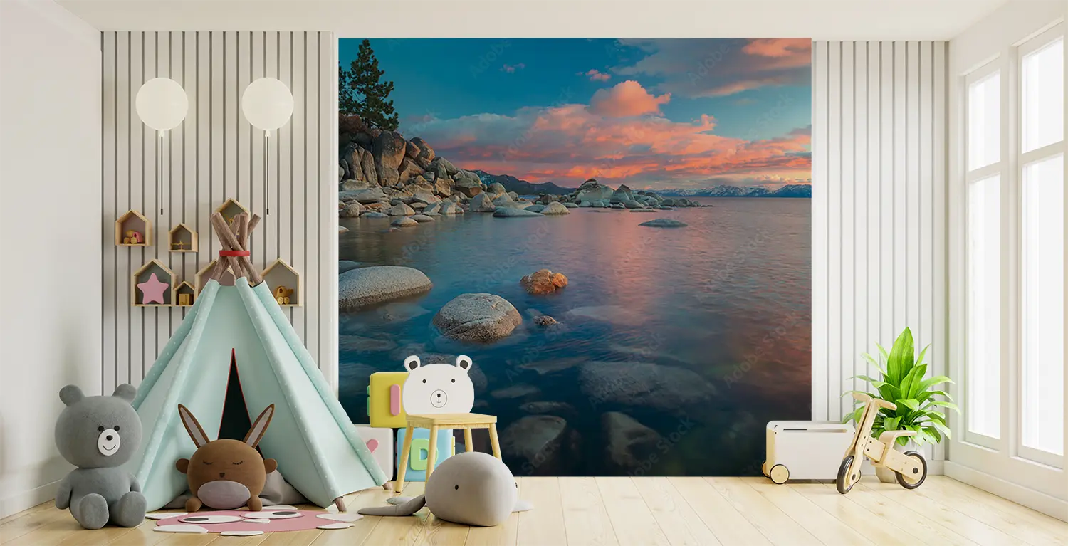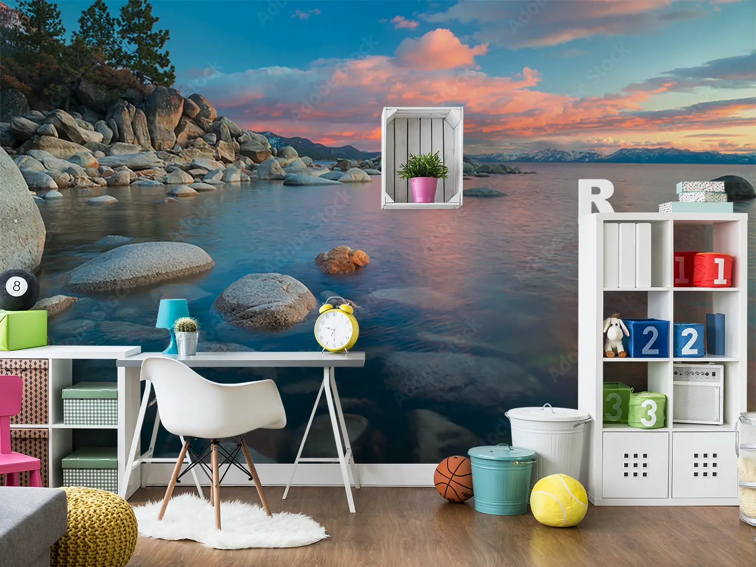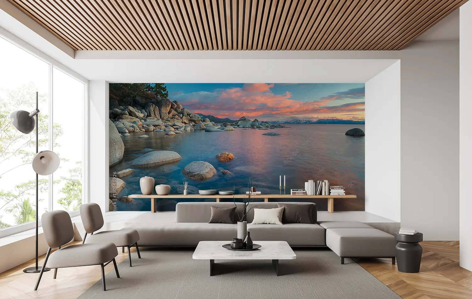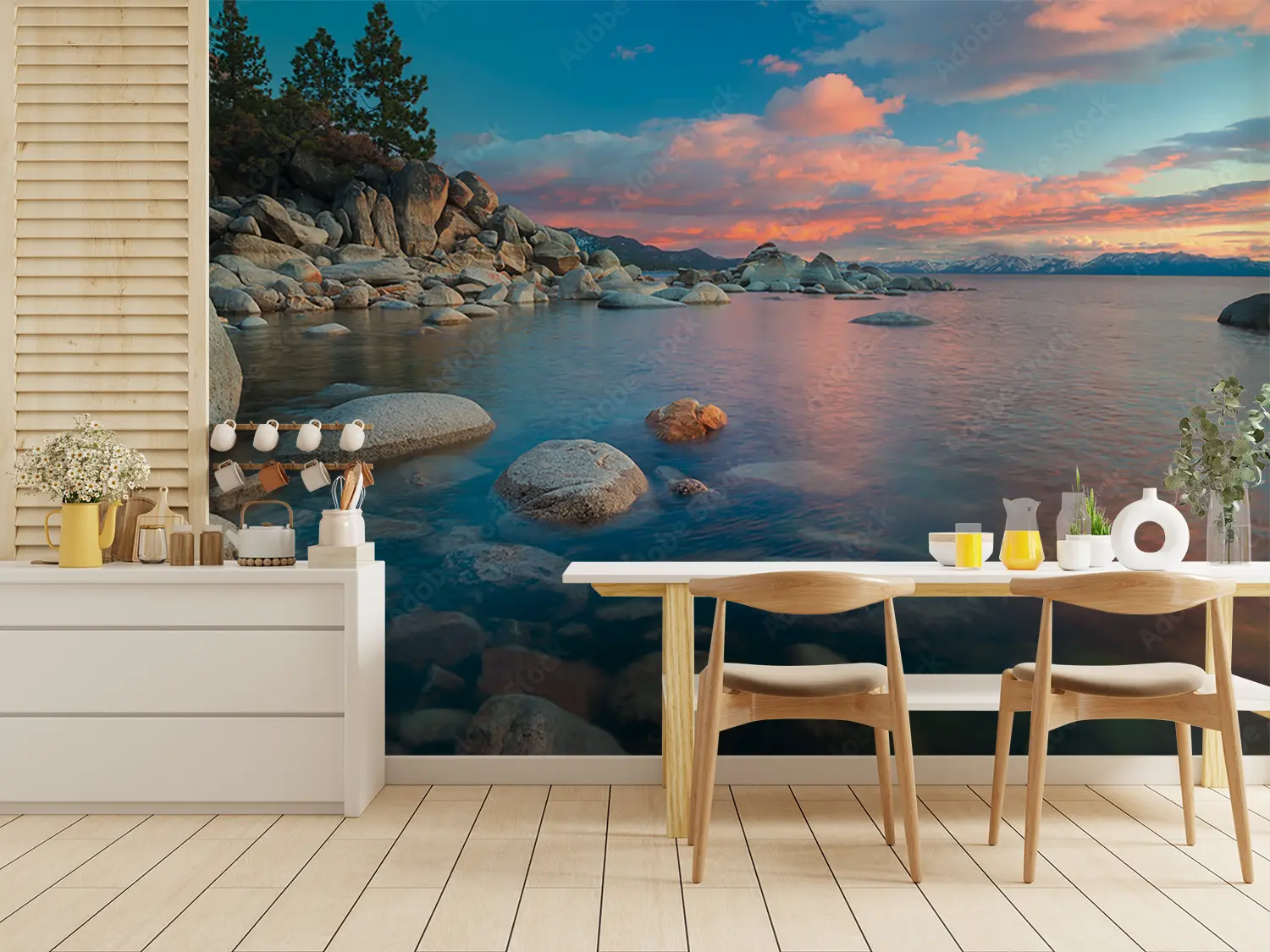 Transform your space with this captivating wall art featuring a tranquil lake scene at sunset, complete with rocks and water. The warm hues of blue, grey, and earth tones create a calming and inviting atmosphere, perfect for adding a touch of natural beauty to your home decor. Enhance your space with this stunning piece of art.