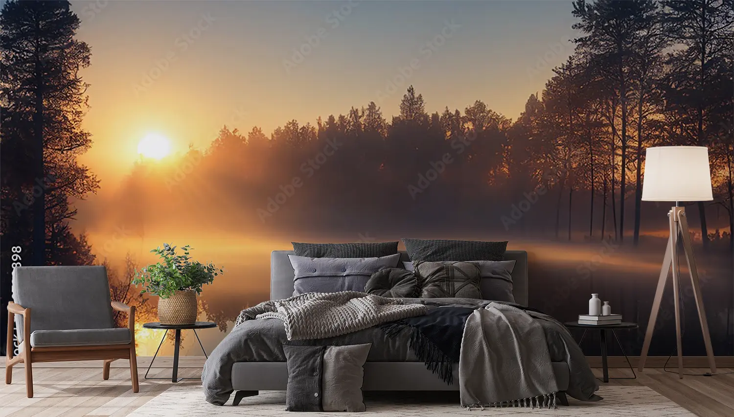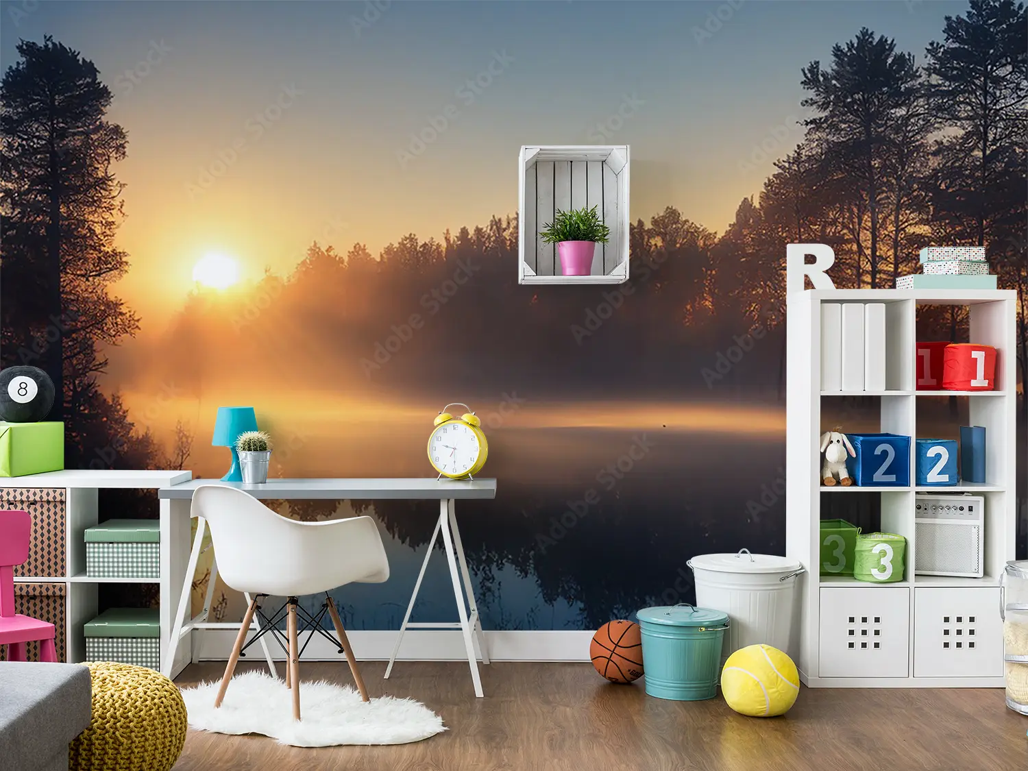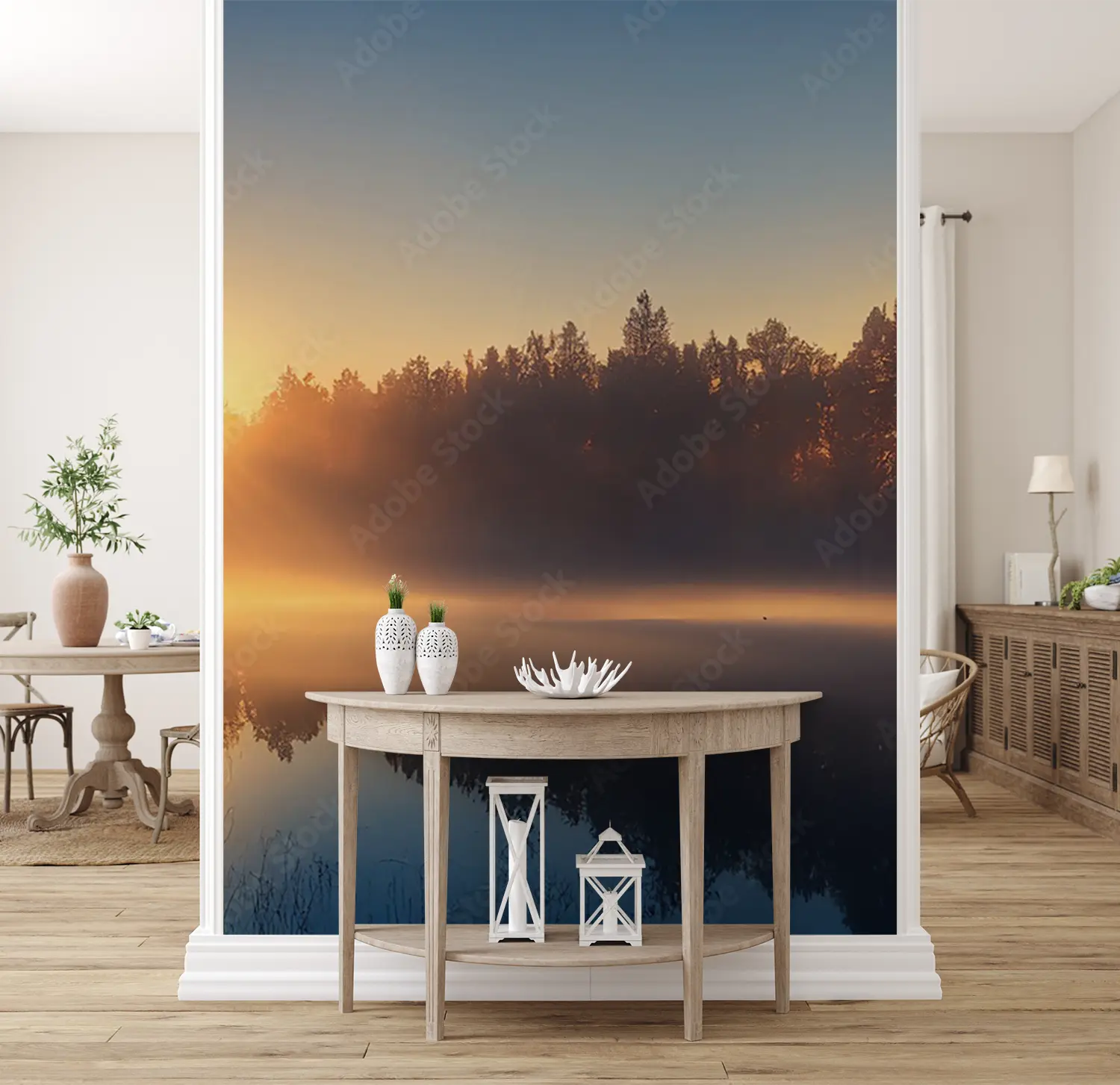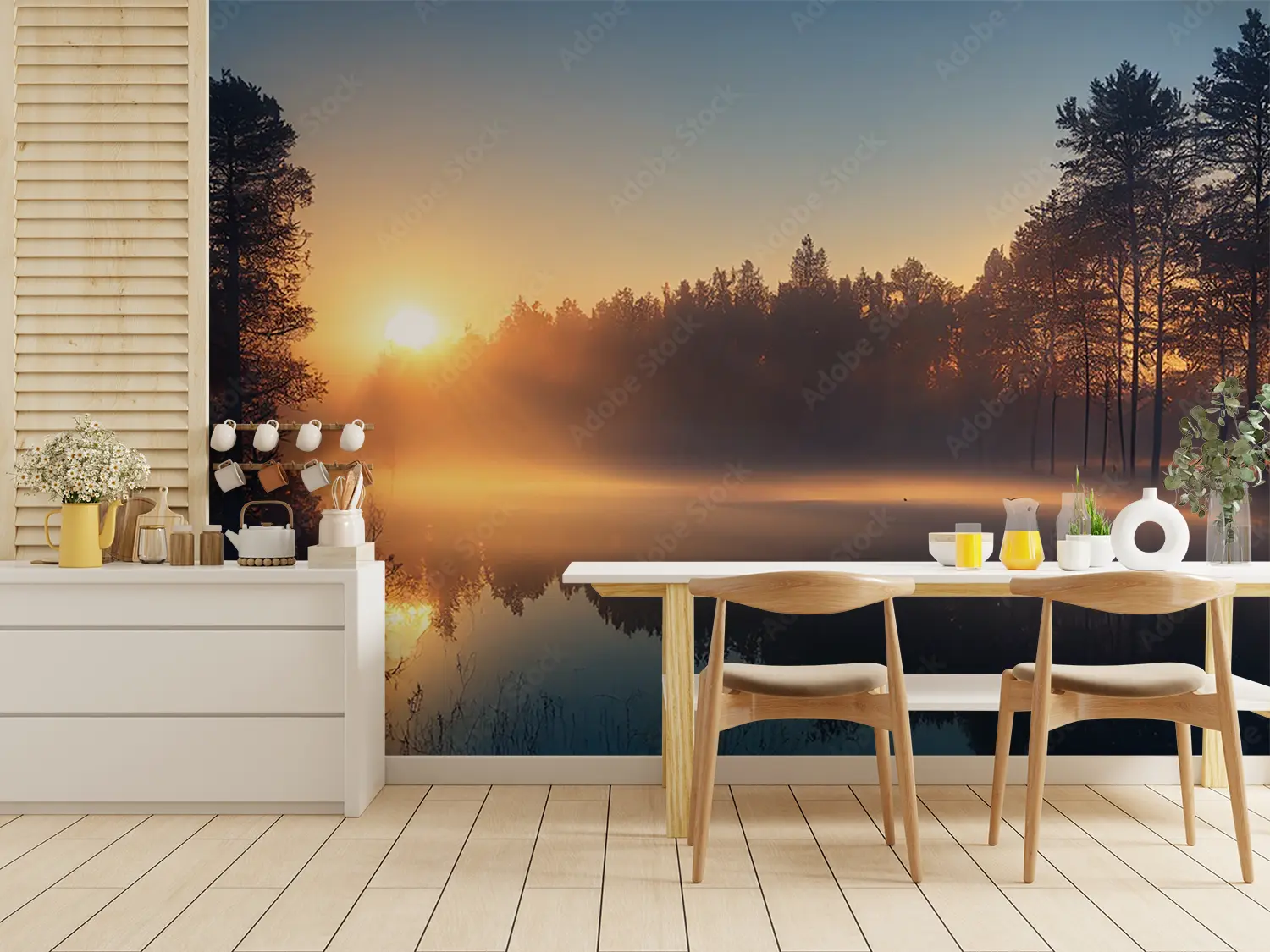 Transform your space with the enchanting beauty of a misty lake at sunset. This captivating wall art features a tranquil scene of a sun setting behind trees, creating a serene ambiance in any room. Complementary colors like warm browns, soft blues, and earthy greens will enhance the peaceful vibe of this stunning piece. Perfect for adding a touch of nature to your home decor.