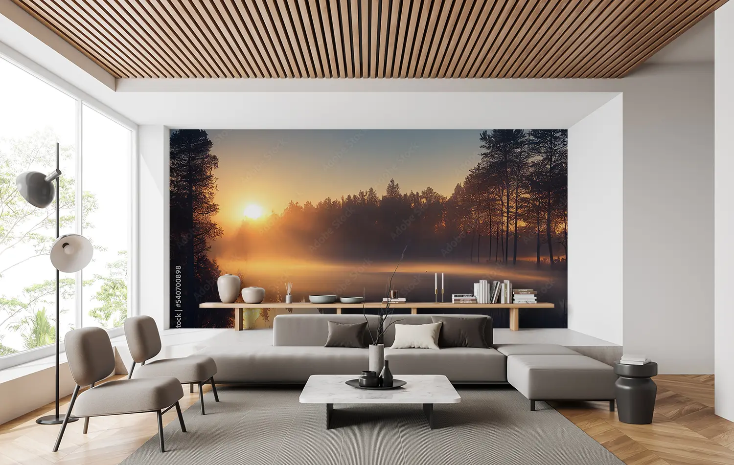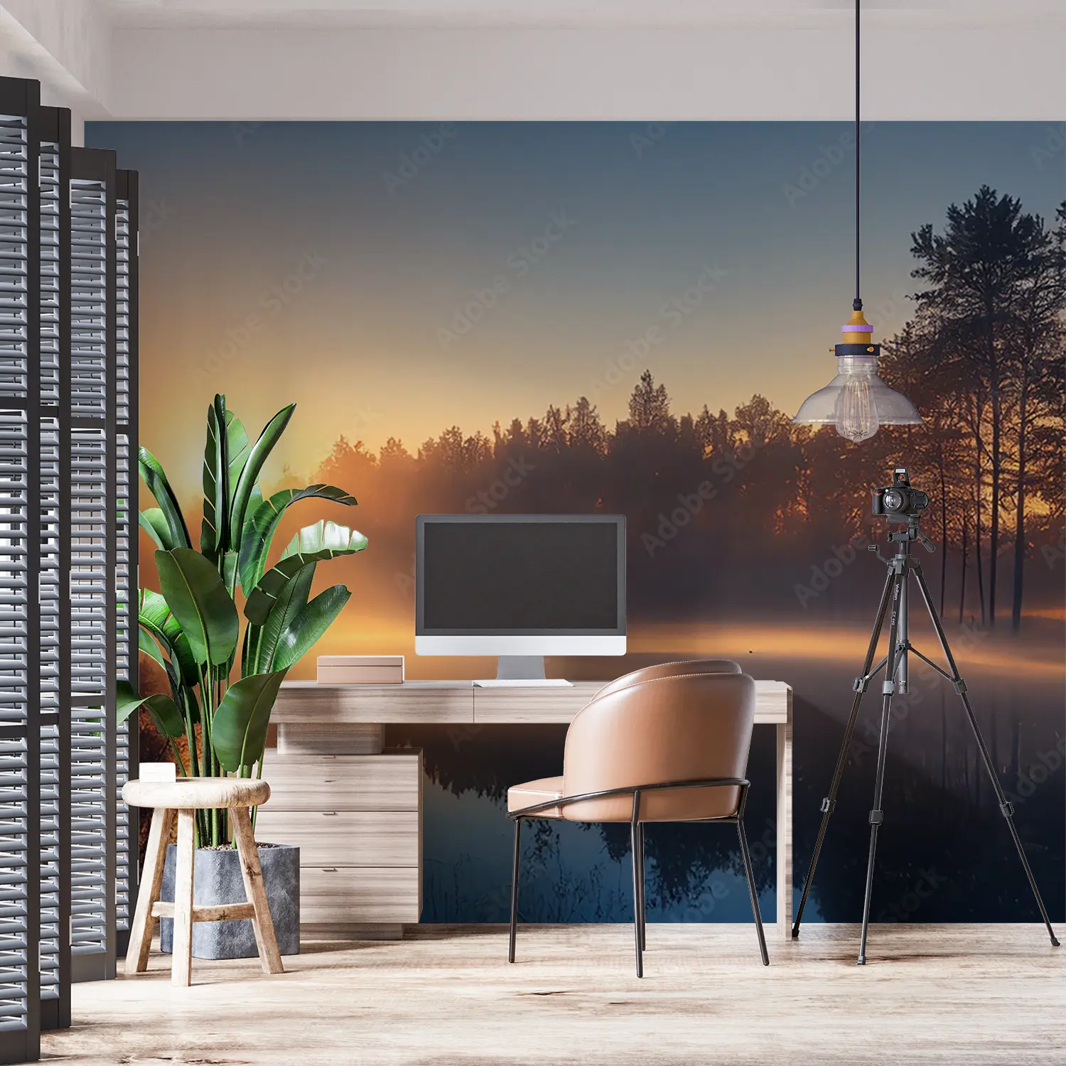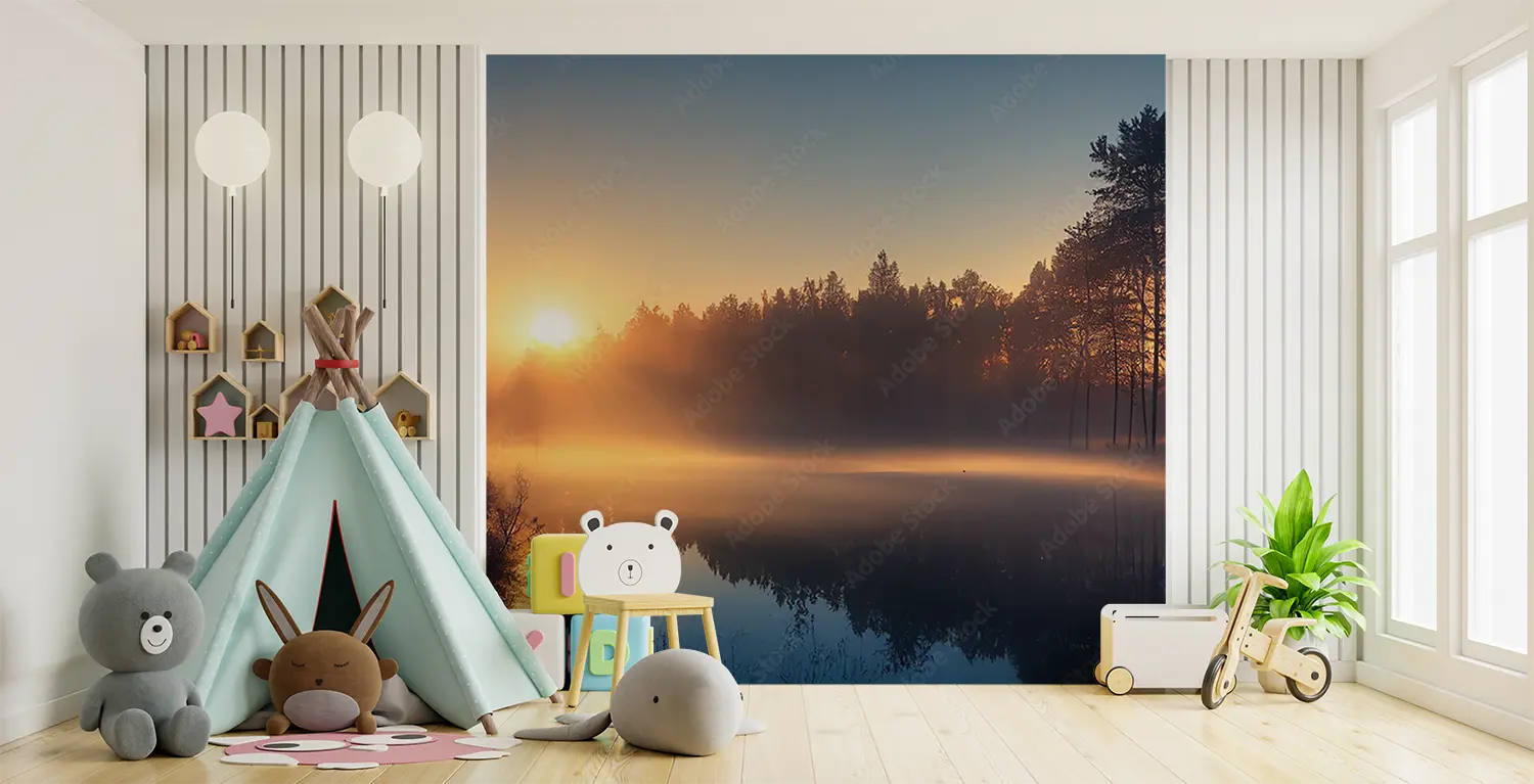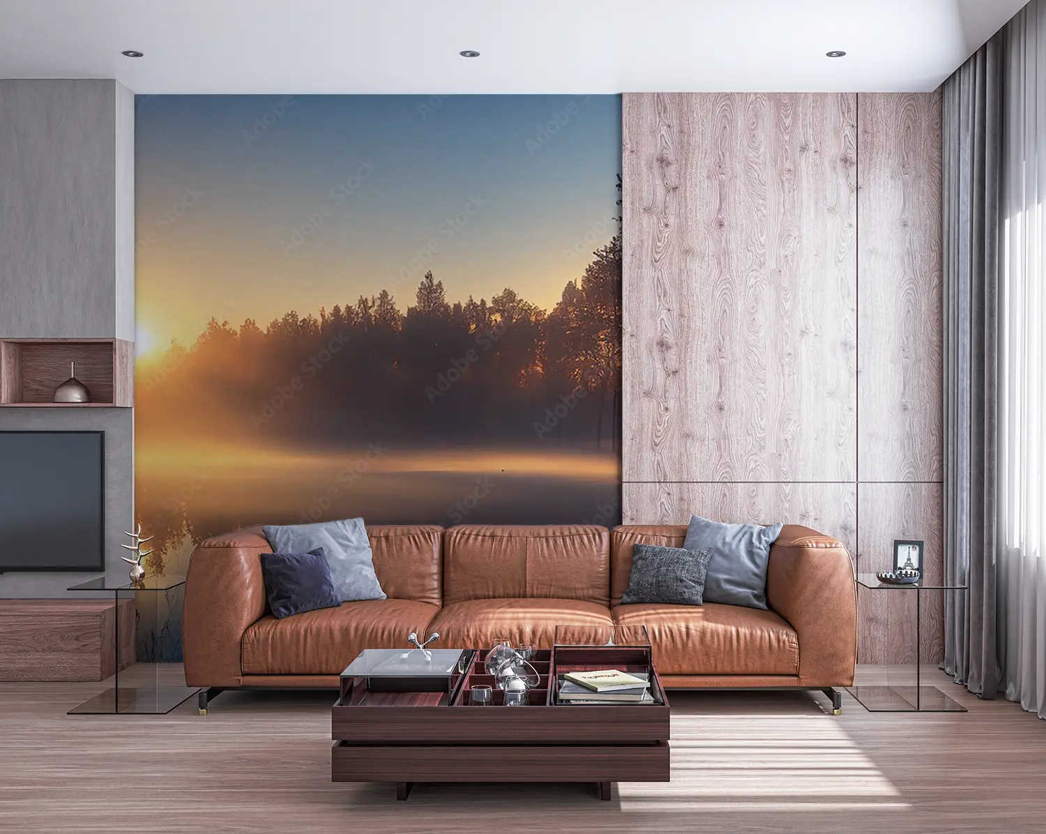Transform your space with the enchanting beauty of a misty lake at sunset. This captivating wall art features a tranquil scene of a sun setting behind trees, creating a serene ambiance in any room. Complementary colors like warm browns, soft blues, and earthy greens will enhance the peaceful vibe of this stunning piece. Perfect for adding a touch of nature to your home decor.