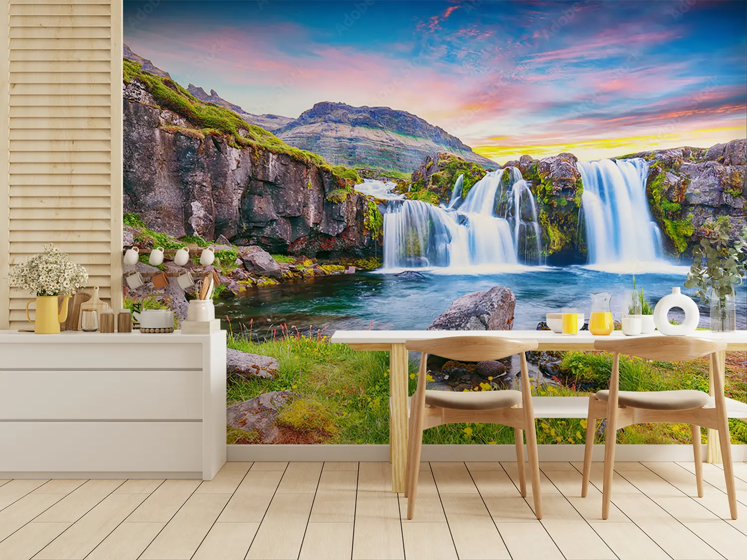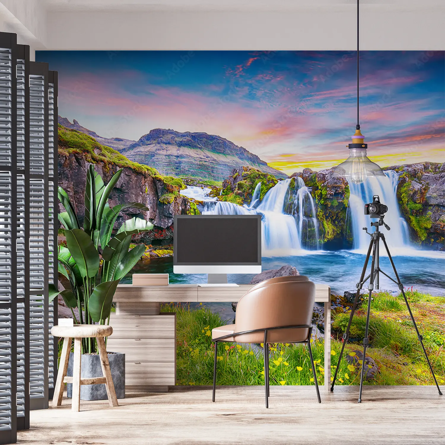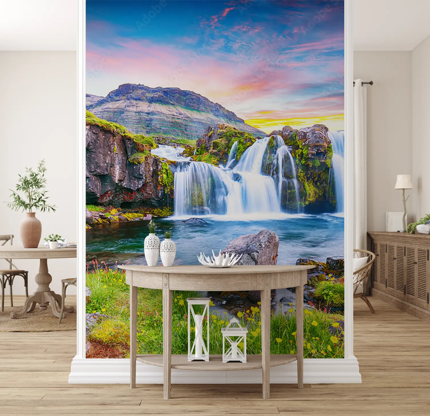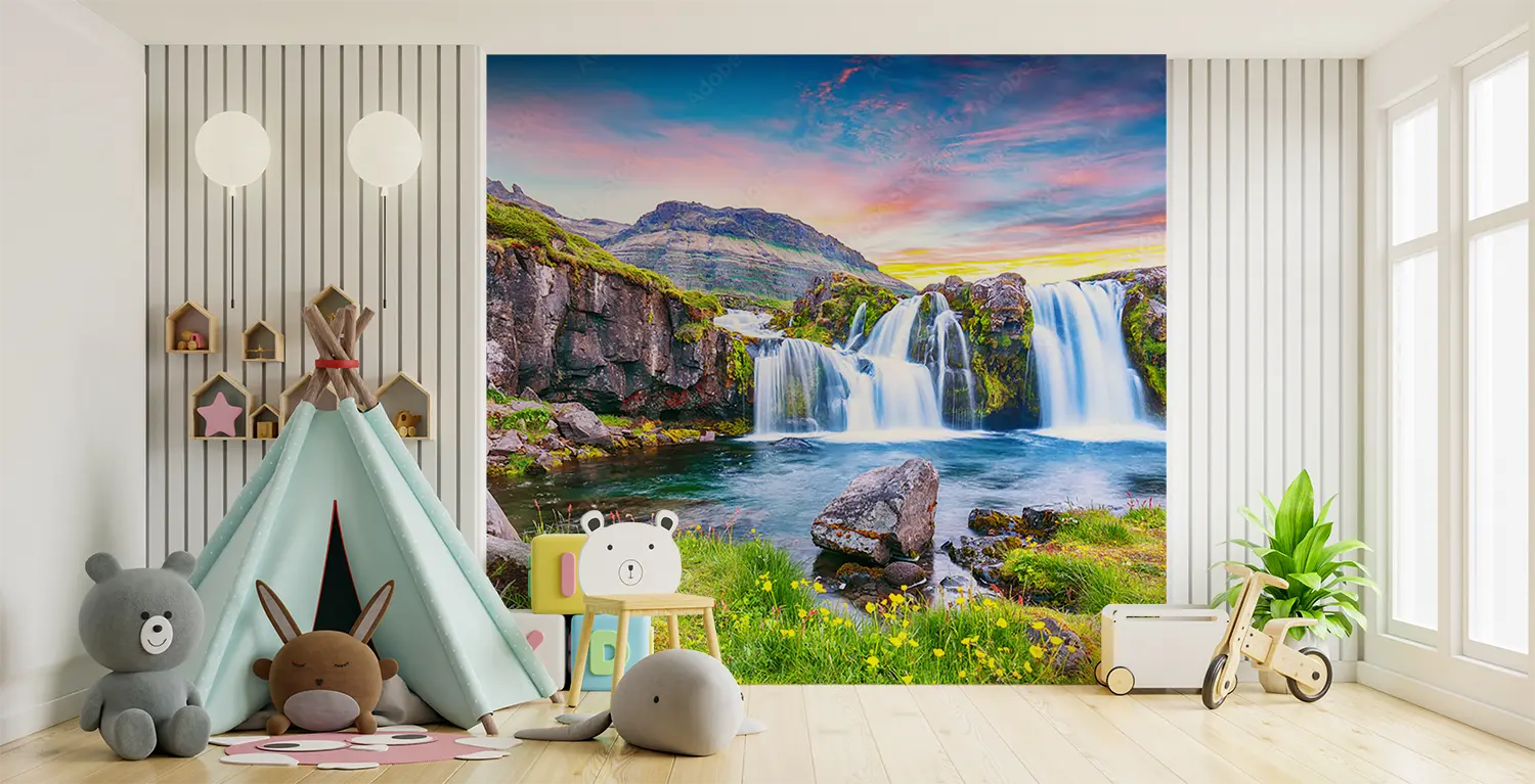 Transform your living space with this captivating wall art featuring a stunning waterfall in a lush green valley. Enhance your home decor with the soothing aesthetic of nature's beauty. Complementary colors to consider are shades of green, blue, and earth tones to create a tranquil atmosphere in any room. Perfect for nature lovers and those seeking a peaceful retreat at home.