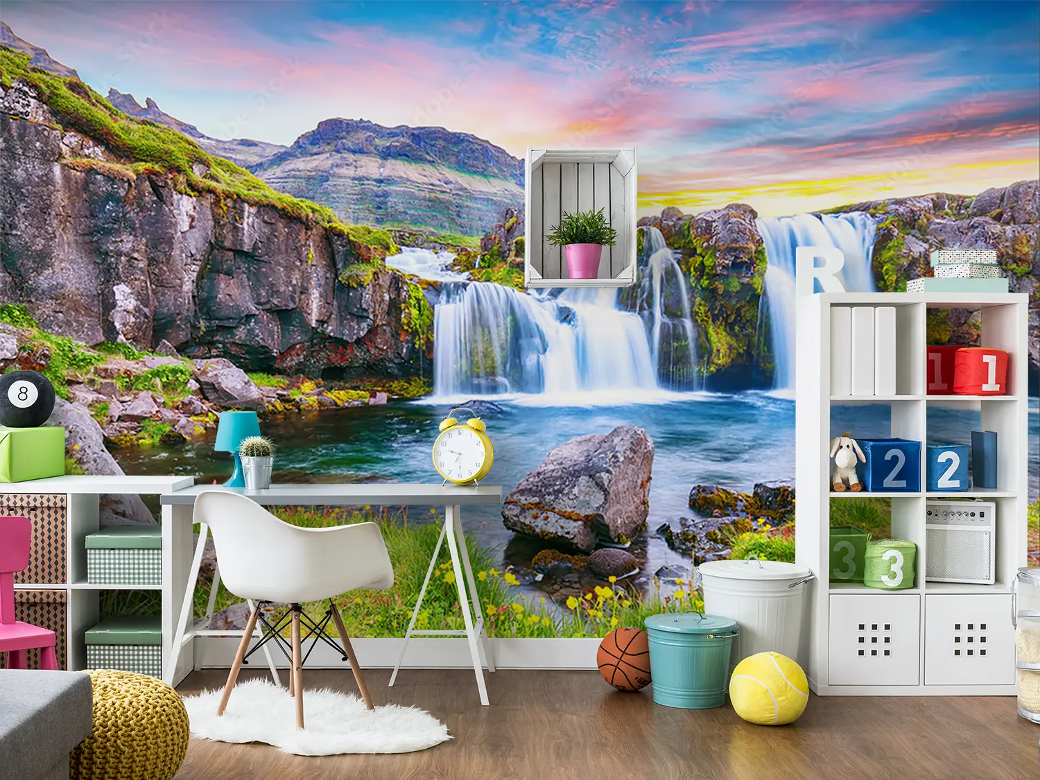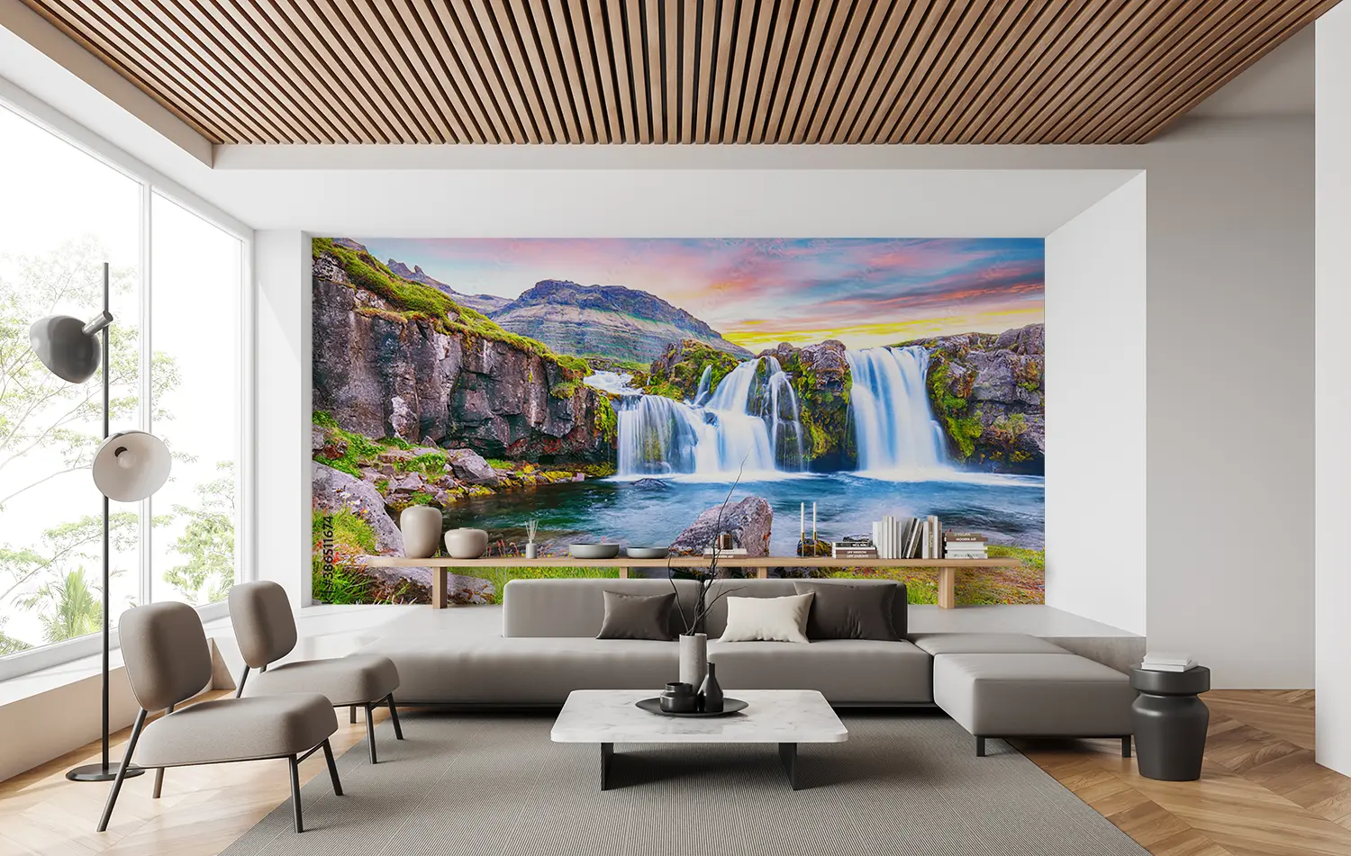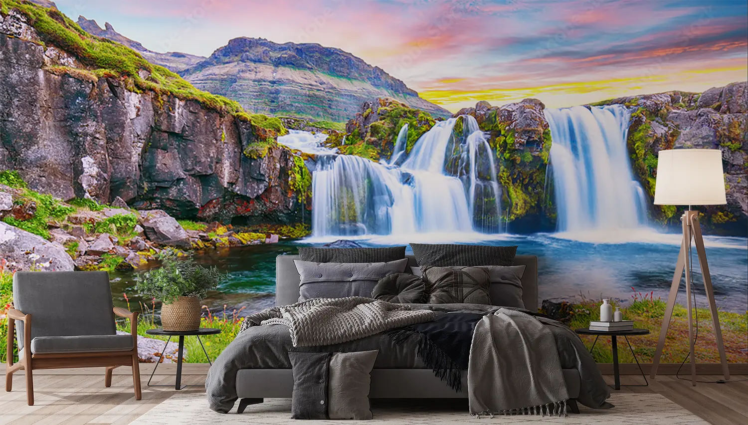 Transform your living space with this captivating wall art featuring a stunning waterfall in a lush green valley. Enhance your home decor with the soothing aesthetic of nature's beauty. Complementary colors to consider are shades of green, blue, and earth tones to create a tranquil atmosphere in any room. Perfect for nature lovers and those seeking a peaceful retreat at home.
