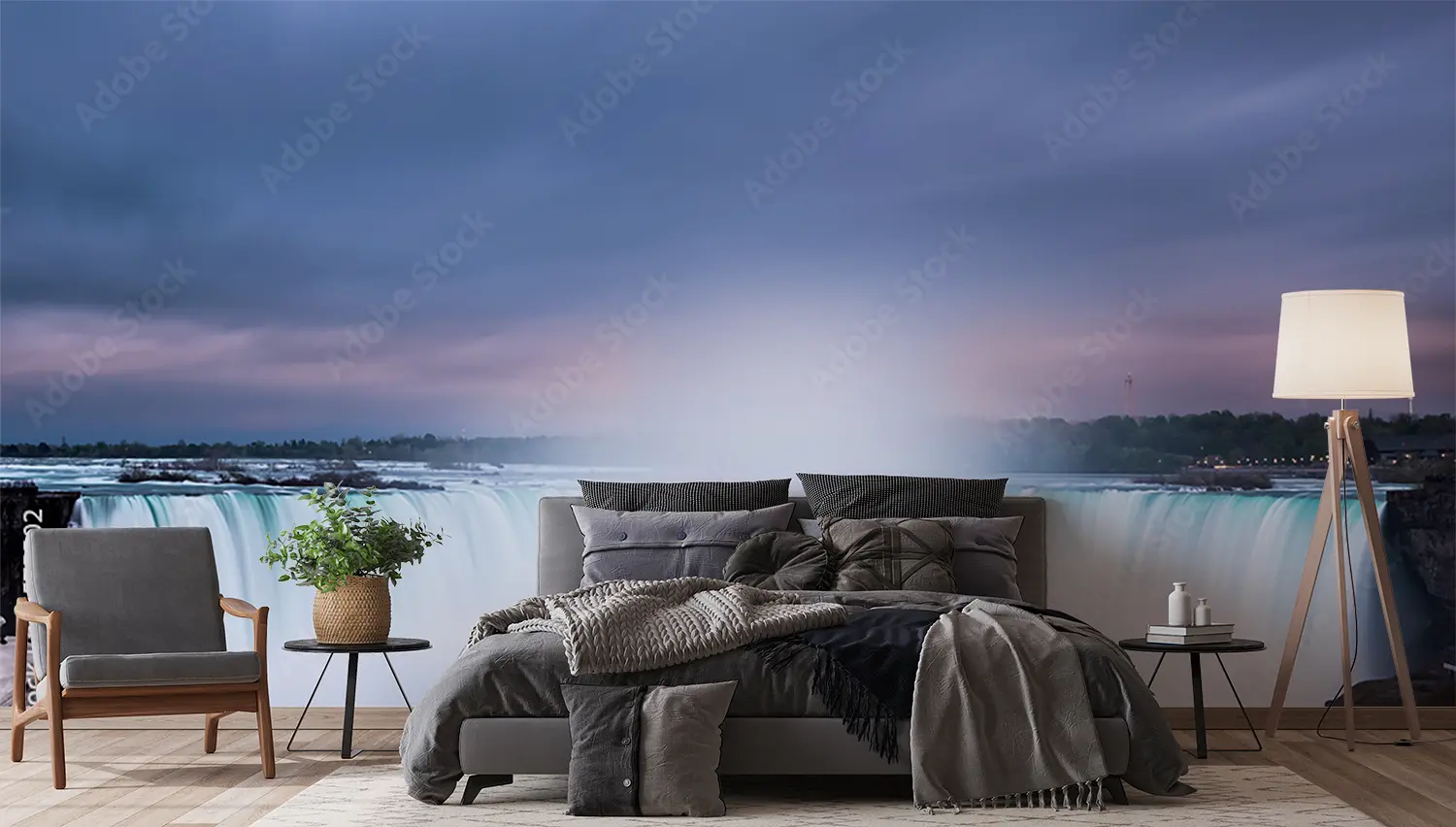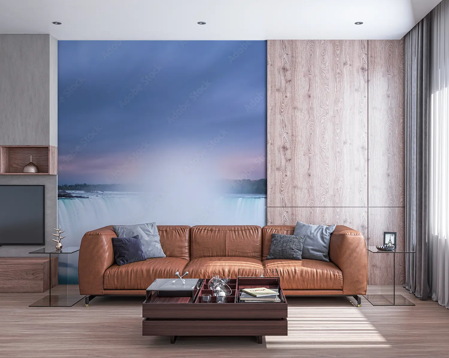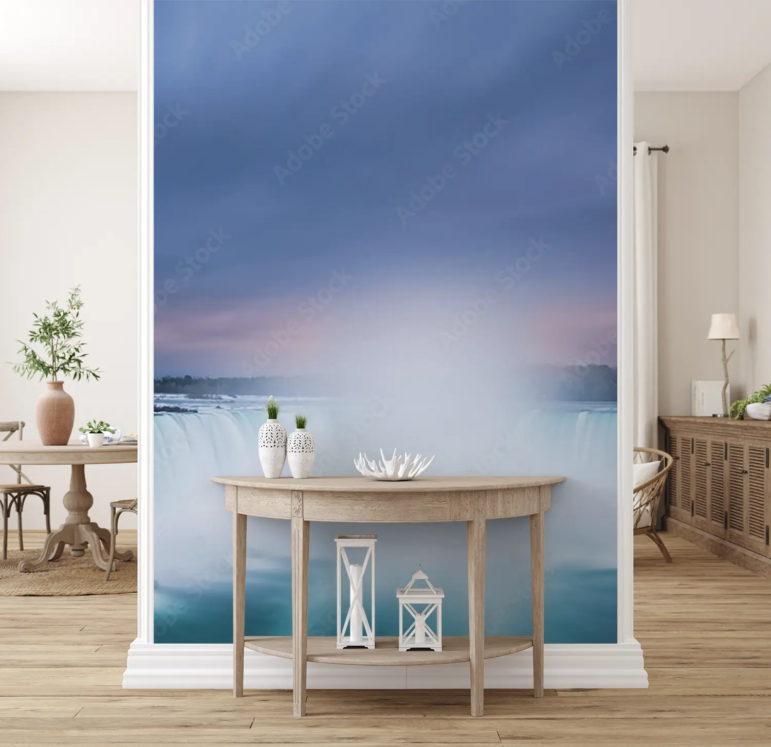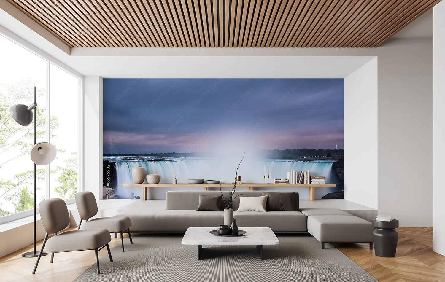 Immerse yourself in the tranquil beauty of a waterfall cascading beneath a vibrant rainbow in the sky. This captivating image brings a sense of peace and wonder to any living space, enhancing its aesthetic appeal. Complementary colors to consider for your decor include shades of blue, white, and earth tones to complement this stunning natural scene.