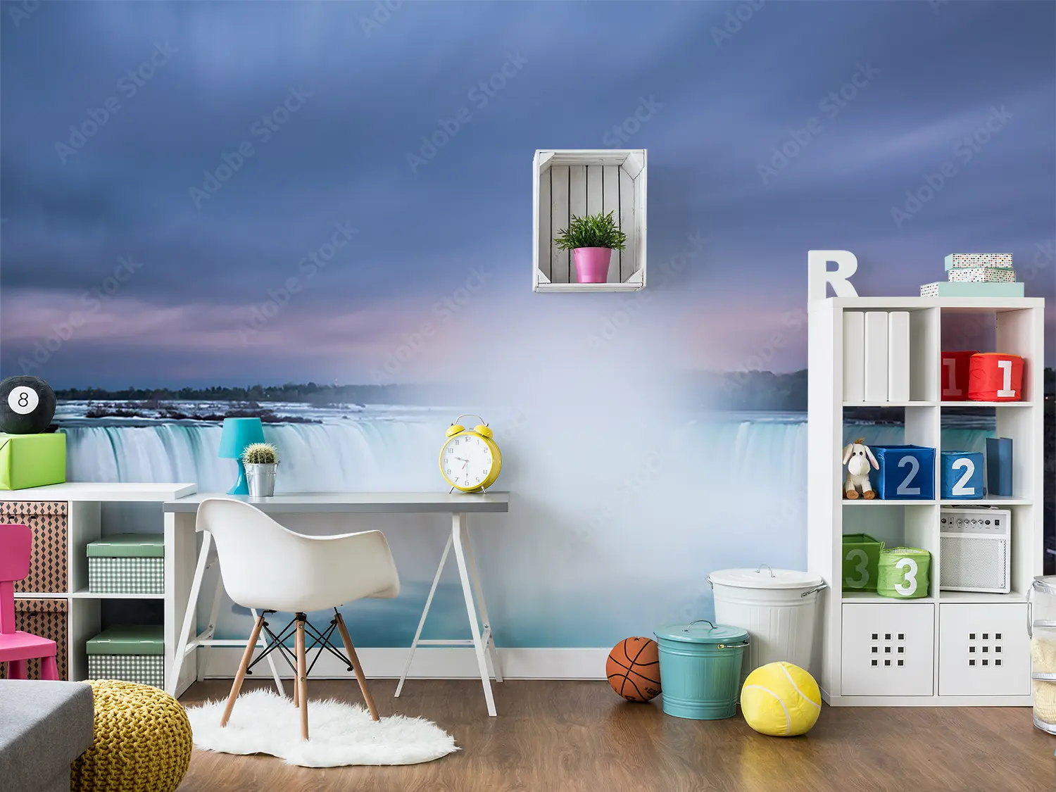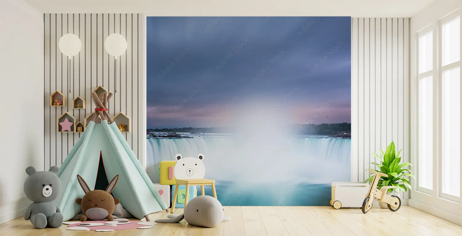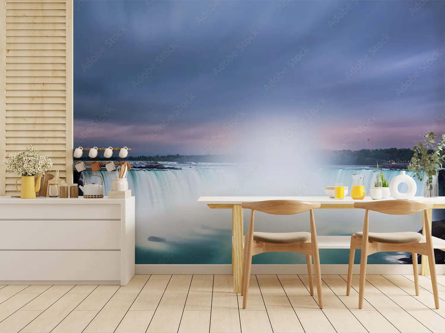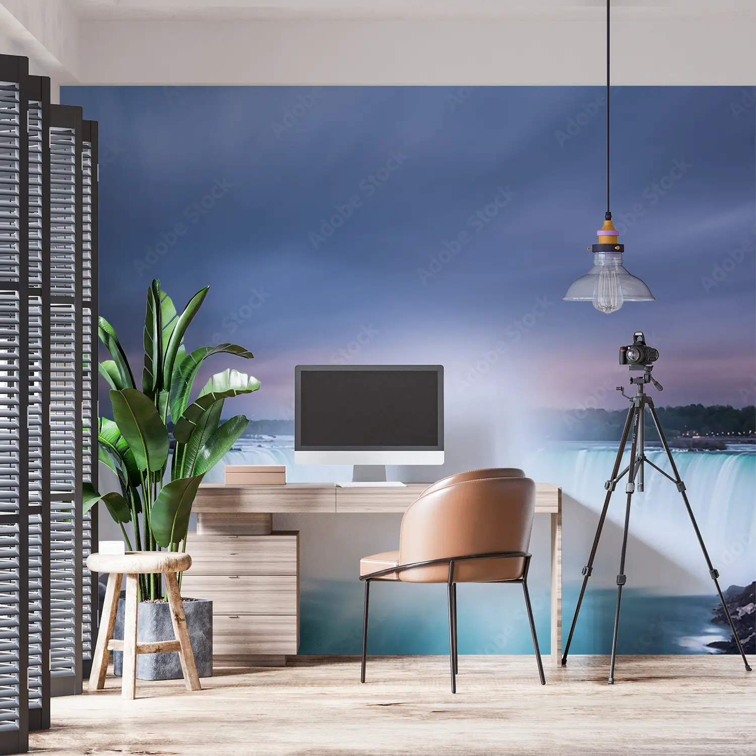 Immerse yourself in the tranquil beauty of a waterfall cascading beneath a vibrant rainbow in the sky. This captivating image brings a sense of peace and wonder to any living space, enhancing its aesthetic appeal. Complementary colors to consider for your decor include shades of blue, white, and earth tones to complement this stunning natural scene.