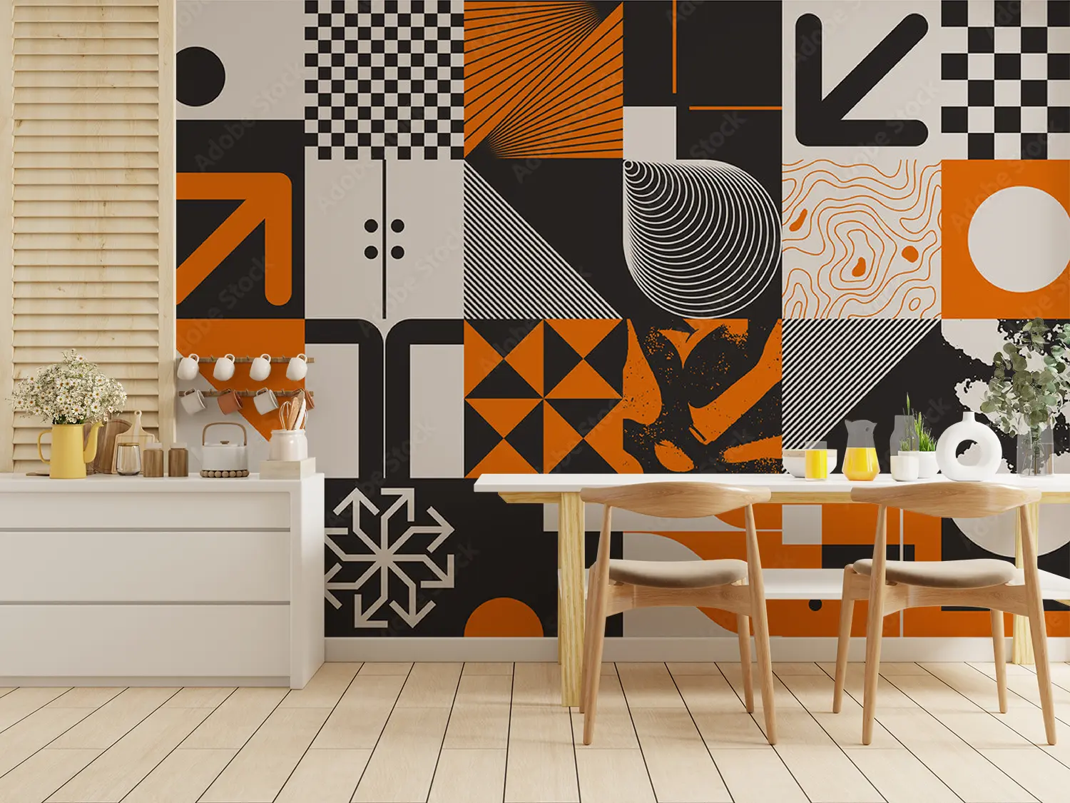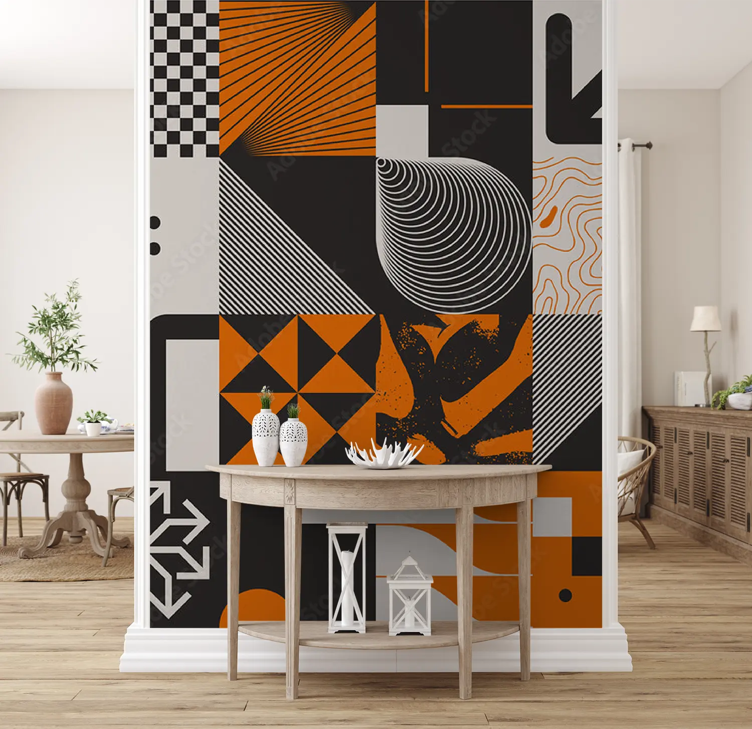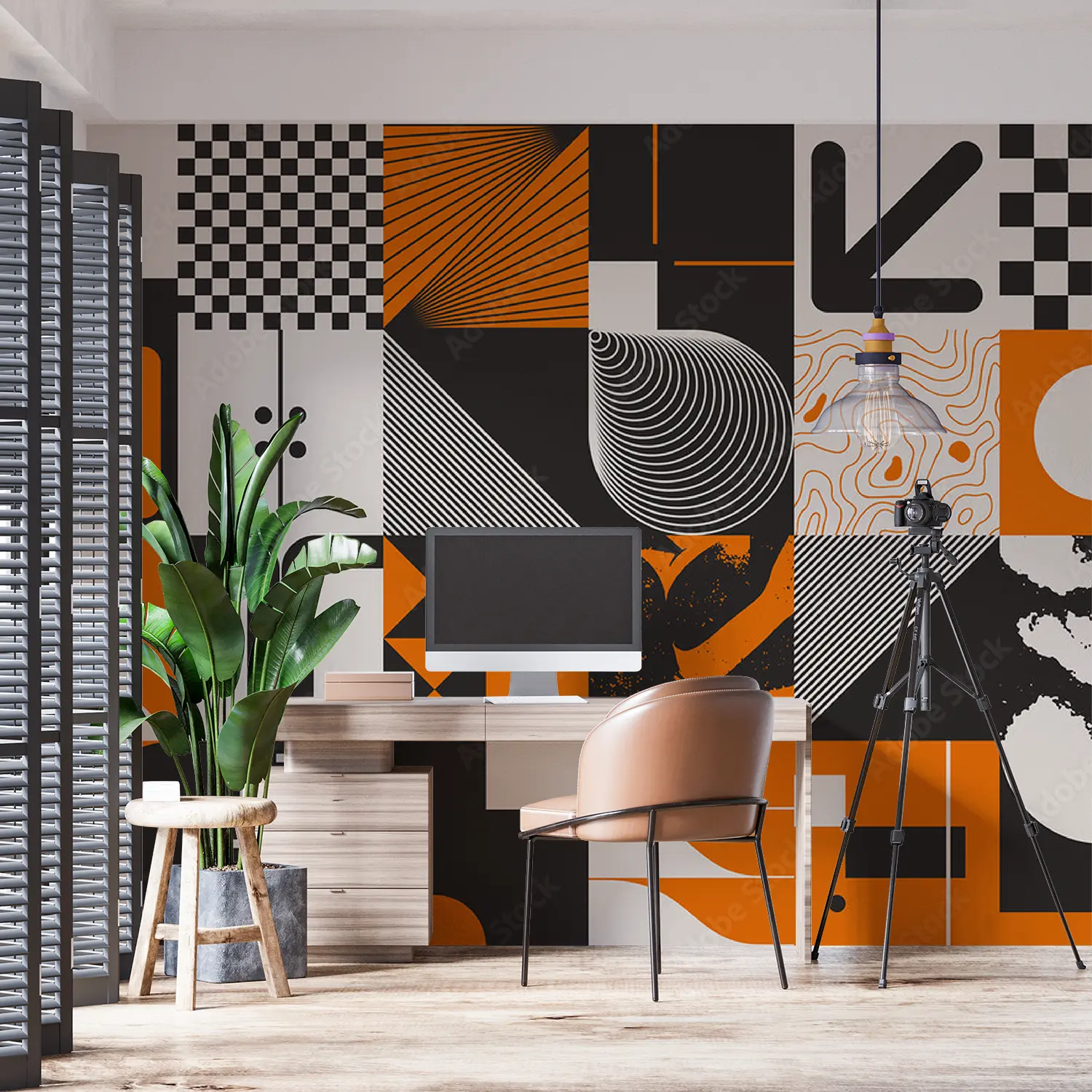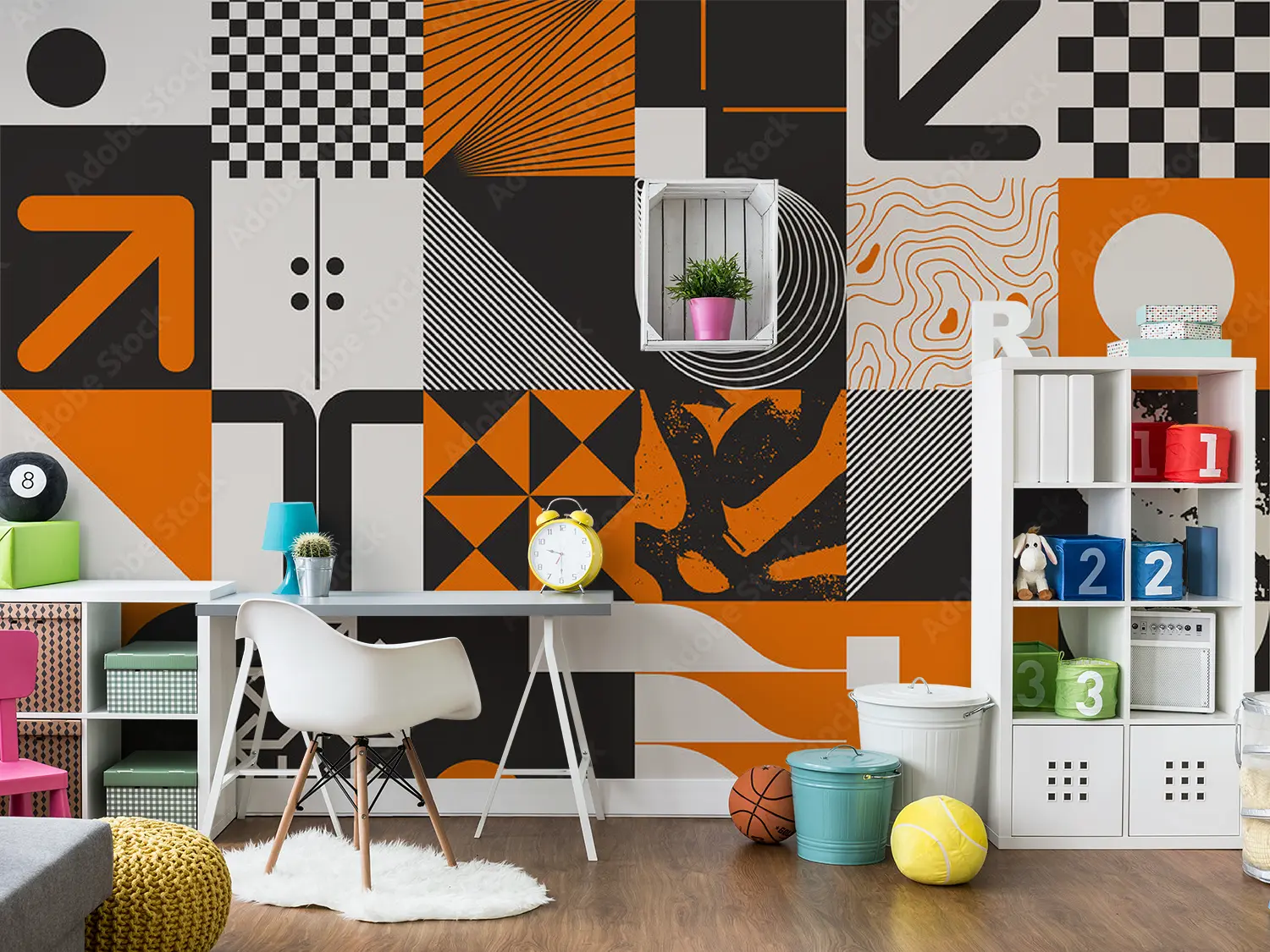 Elevate your space with this dynamic wall art featuring a stylish skateboarder graphic on a striking black and orange geometric background. The bold design adds a modern touch to any room, perfect for those seeking a vibrant and trendy aesthetic. Complementary colors include shades of brown, grey, and cream to enhance the overall look of your home decor.