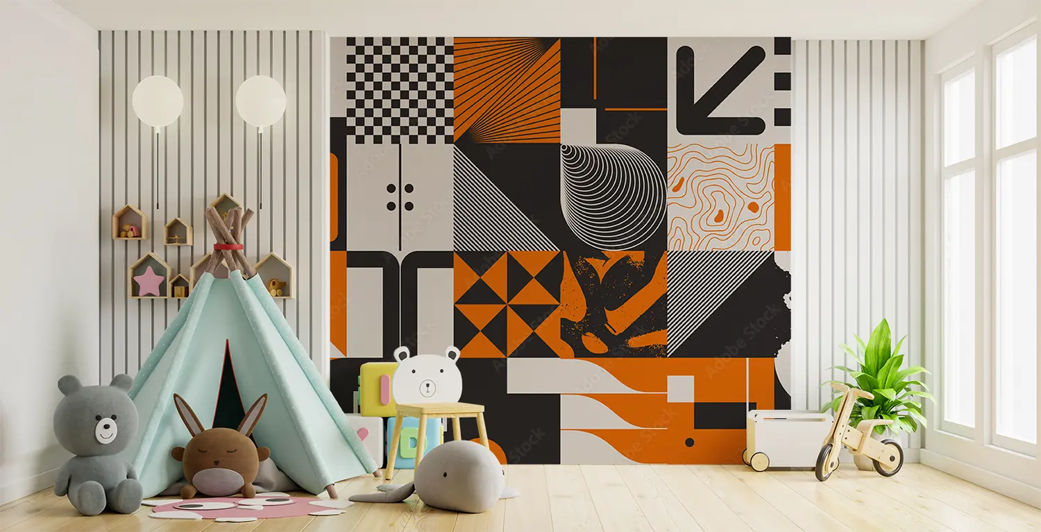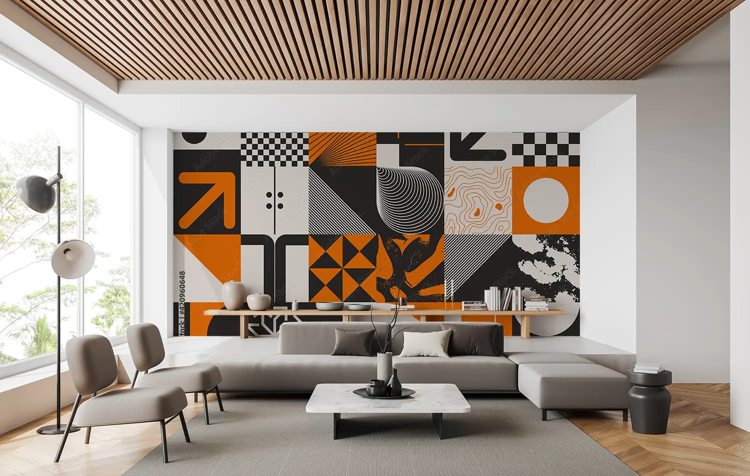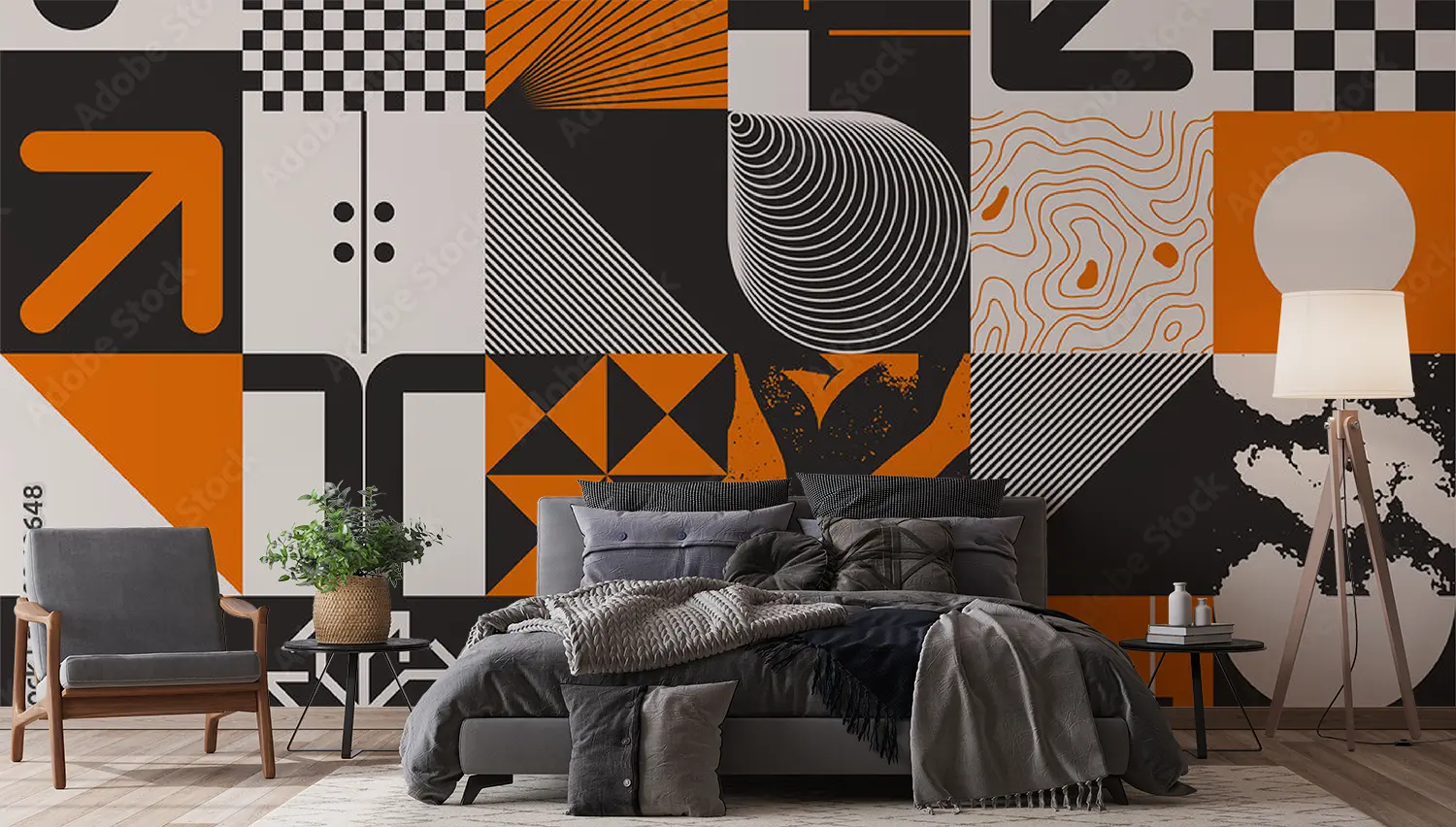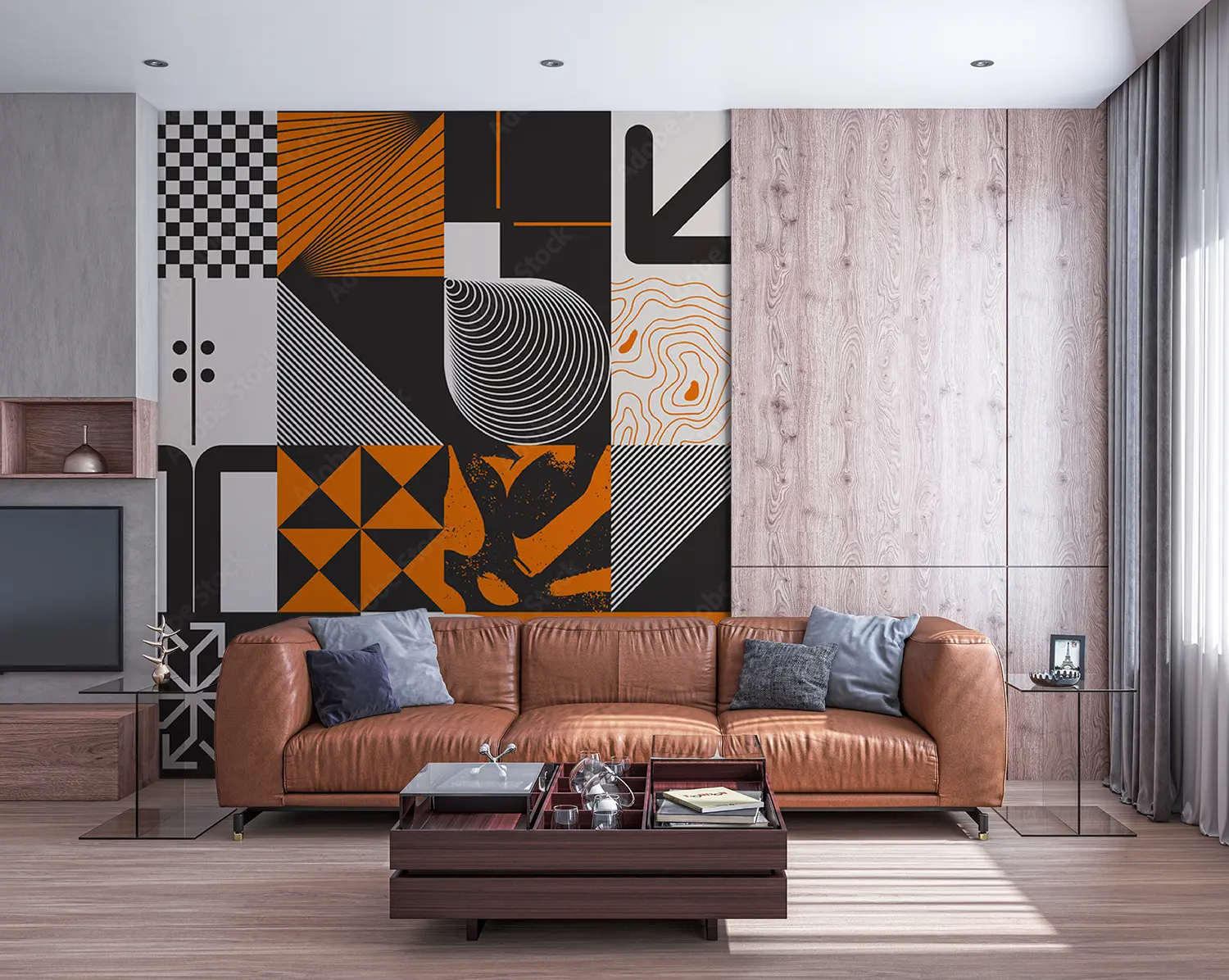 Elevate your space with this dynamic wall art featuring a stylish skateboarder graphic on a striking black and orange geometric background. The bold design adds a modern touch to any room, perfect for those seeking a vibrant and trendy aesthetic. Complementary colors include shades of brown, grey, and cream to enhance the overall look of your home decor.