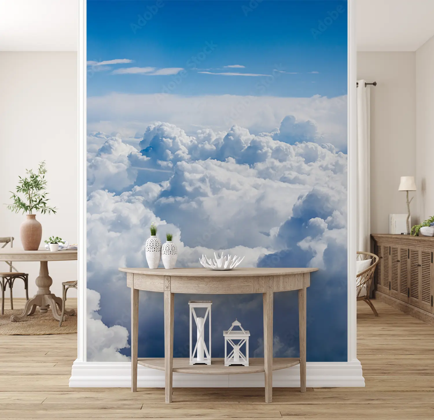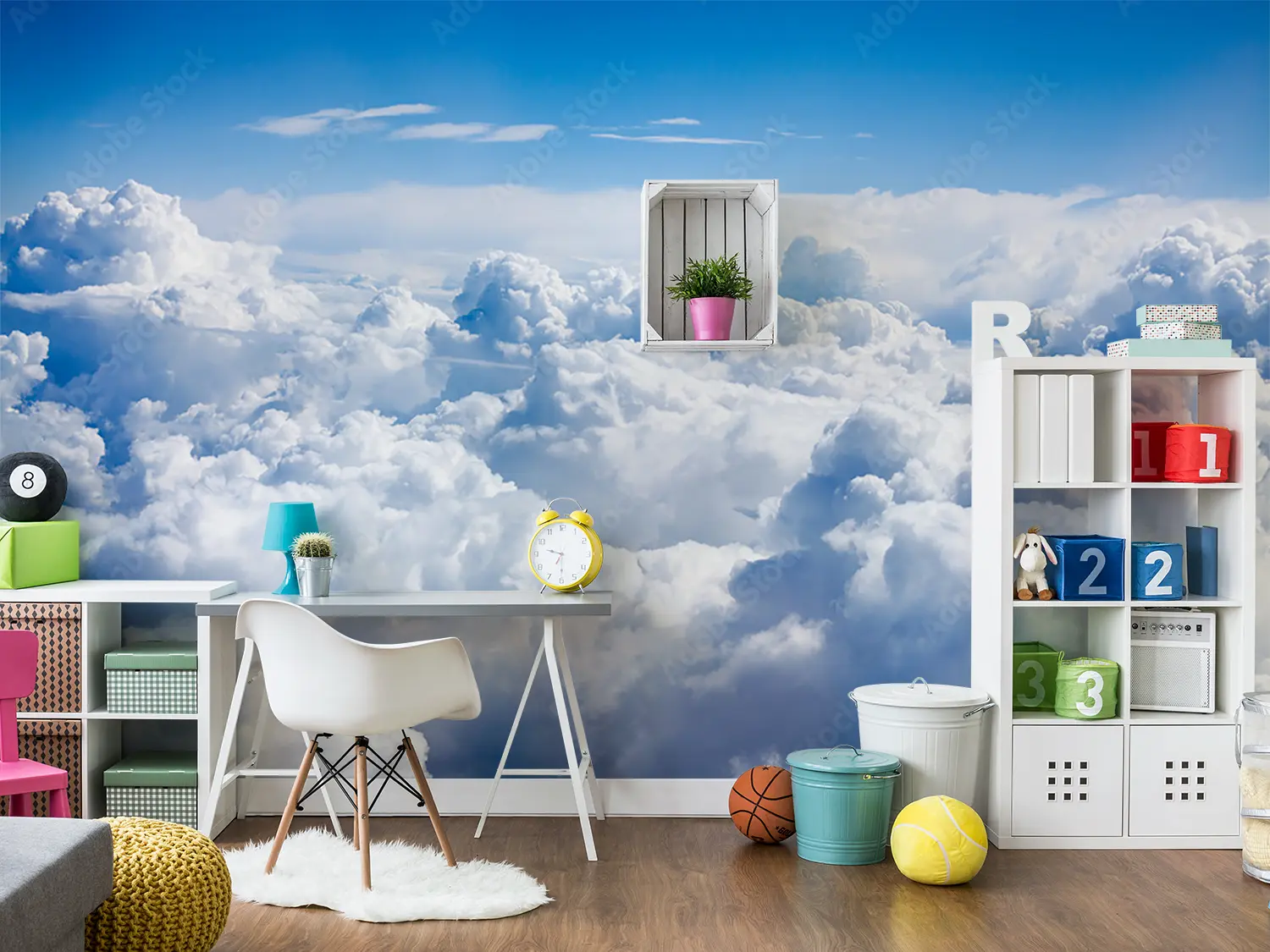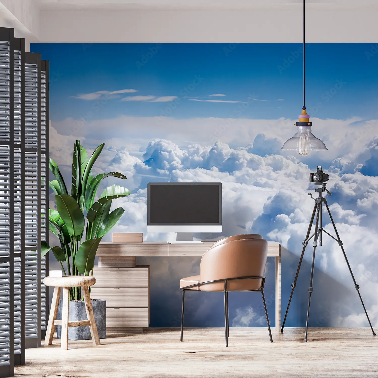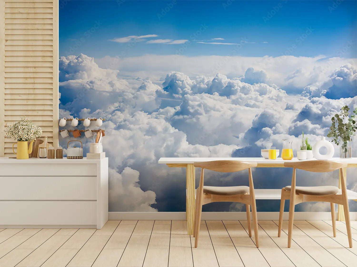 Transform your space with a serene wall featuring a captivating view of a blue sky adorned with fluffy white clouds. This mural exudes a sense of calm and tranquility, perfect for creating a peaceful atmosphere in any room. Pair it with accents in shades of blue, white, and soft gray to enhance its aesthetic appeal and create a cohesive look.