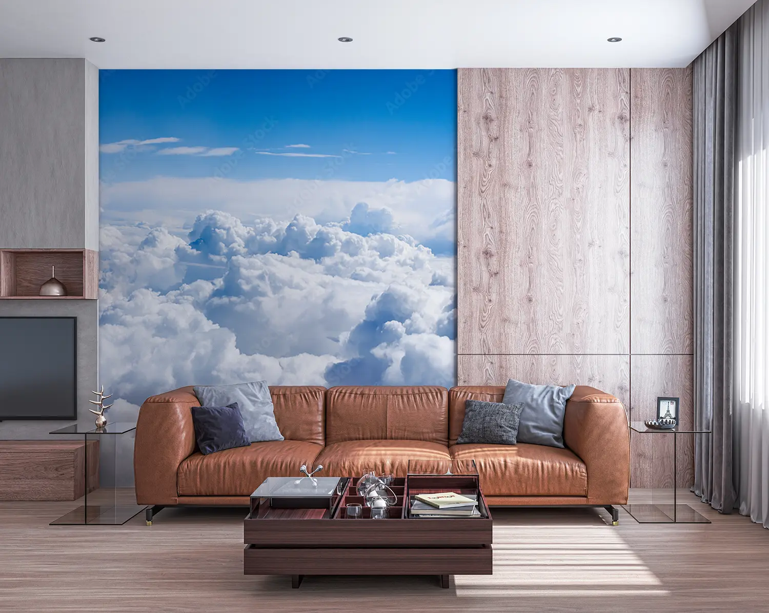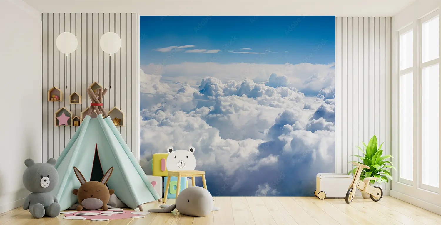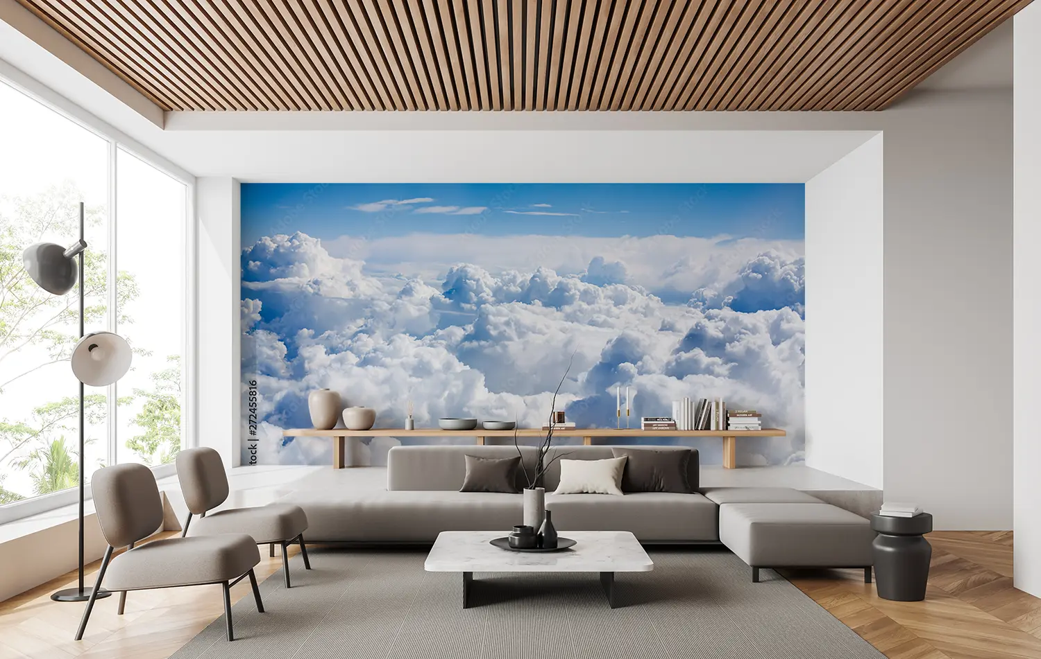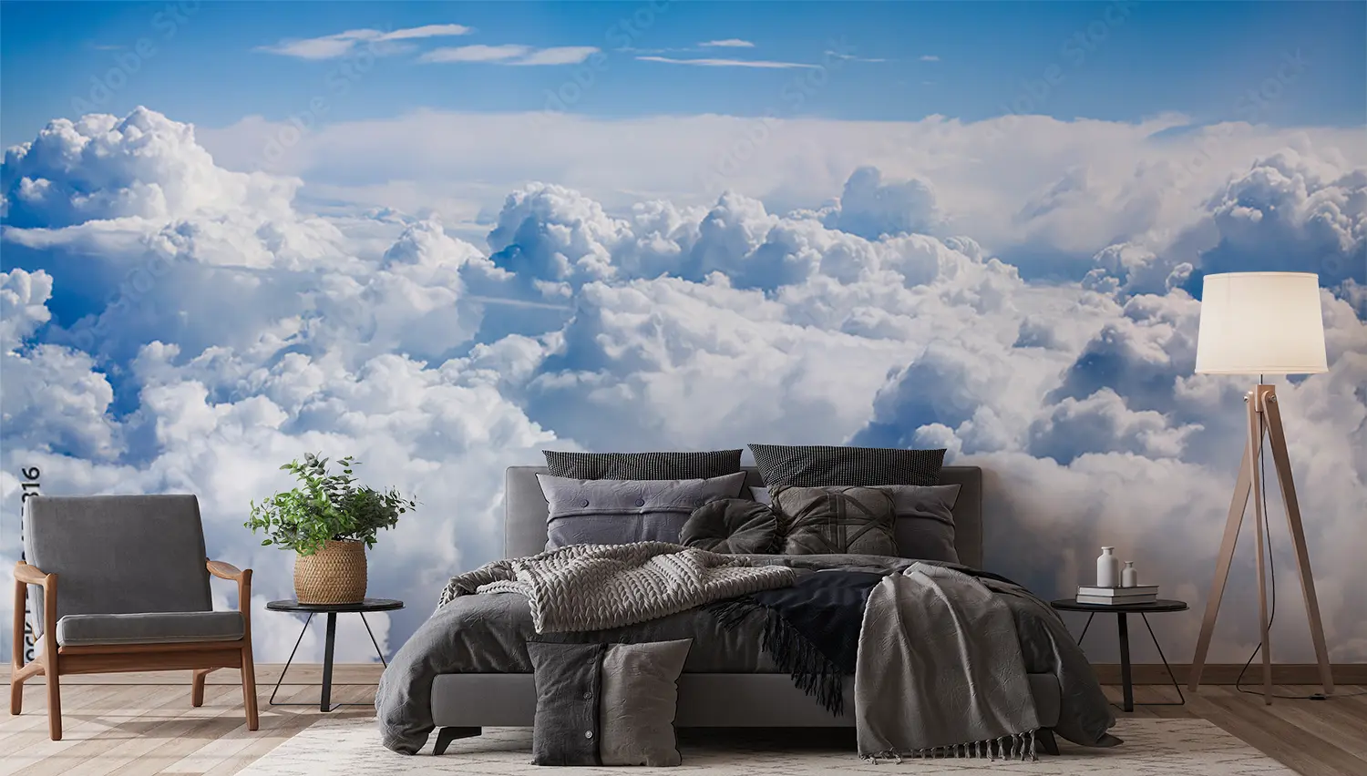 Transform your space with a serene wall featuring a captivating view of a blue sky adorned with fluffy white clouds. This mural exudes a sense of calm and tranquility, perfect for creating a peaceful atmosphere in any room. Pair it with accents in shades of blue, white, and soft gray to enhance its aesthetic appeal and create a cohesive look.