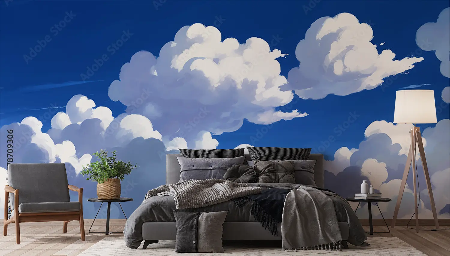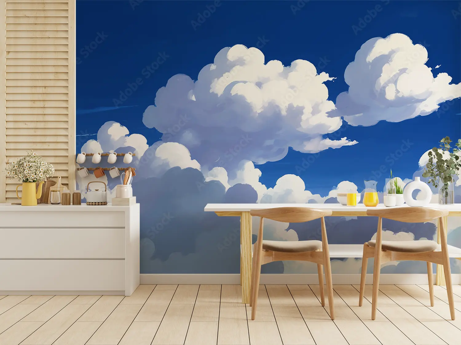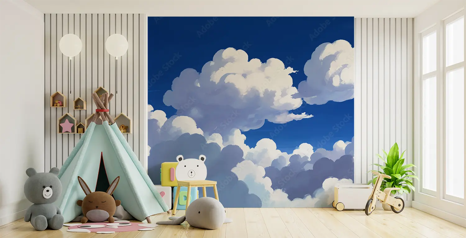 Transform your space with a captivating painting of a serene sky adorned with fluffy clouds and a distant plane. This art piece brings a sense of tranquility and adventure to any room, perfect for those who appreciate the beauty of nature. Complementary colors include shades of blue, white, and subtle hints of grey for a harmonious decor scheme.