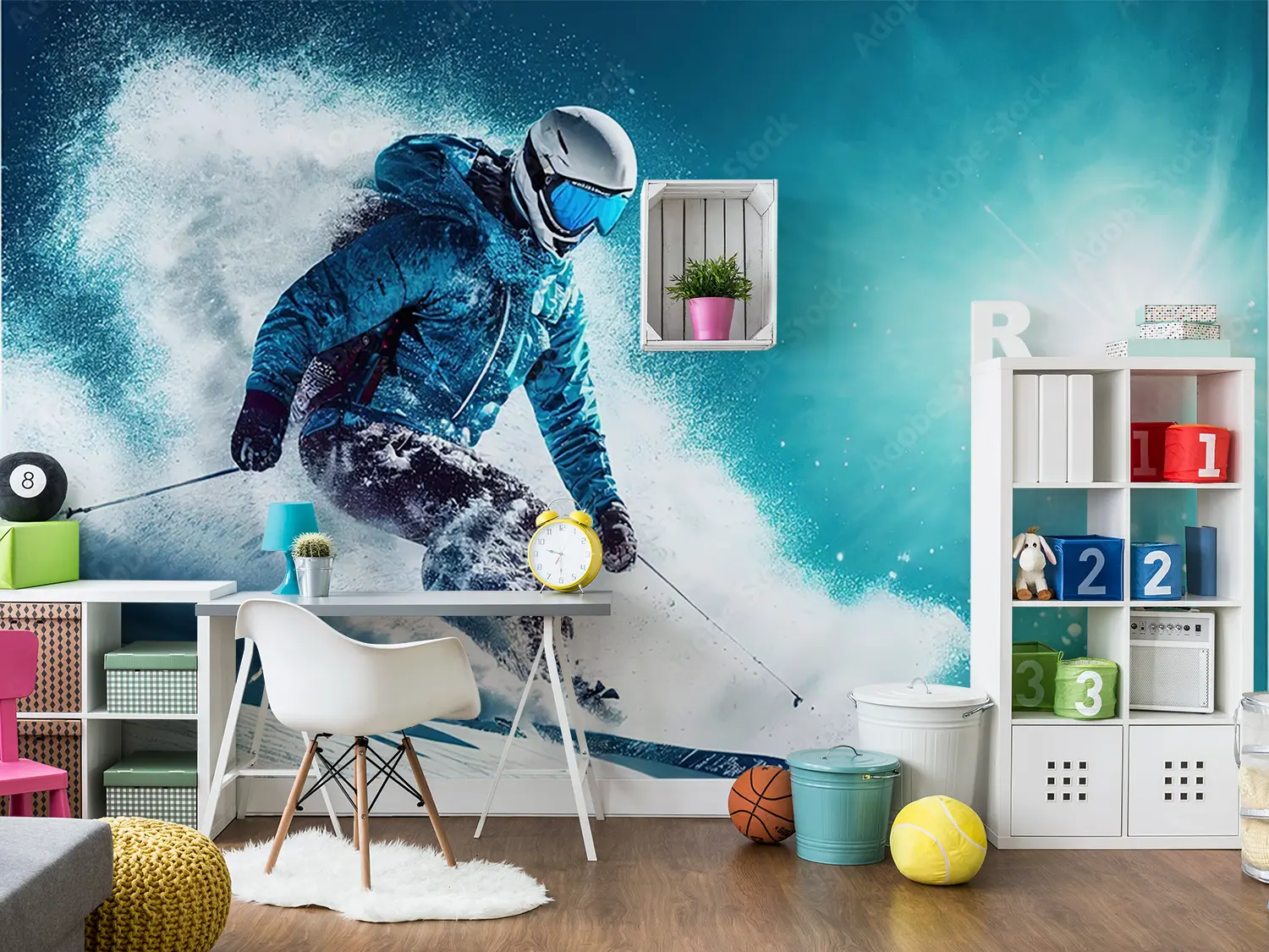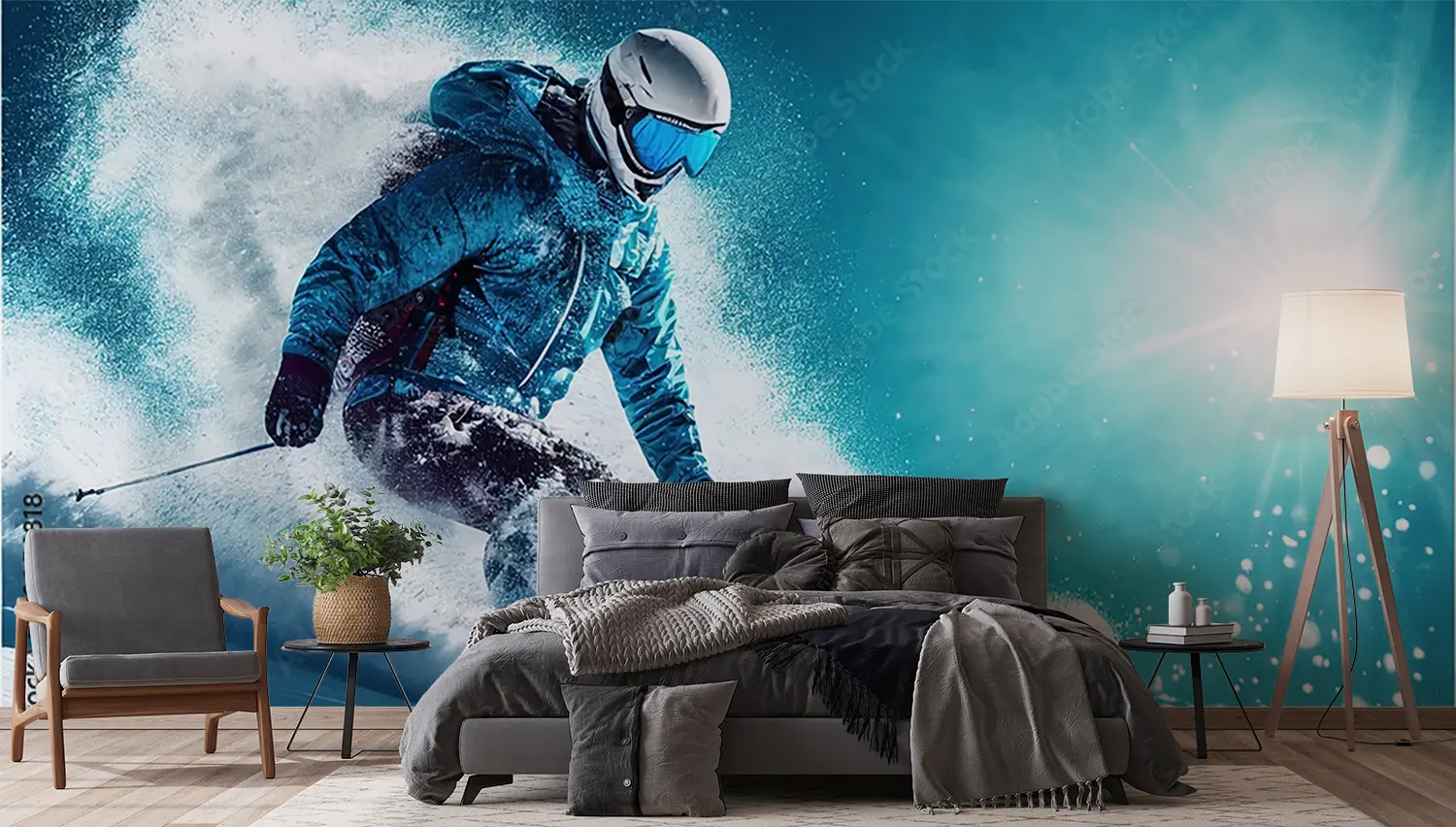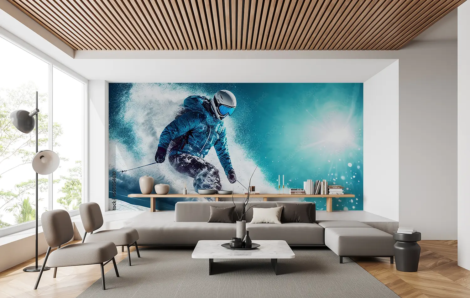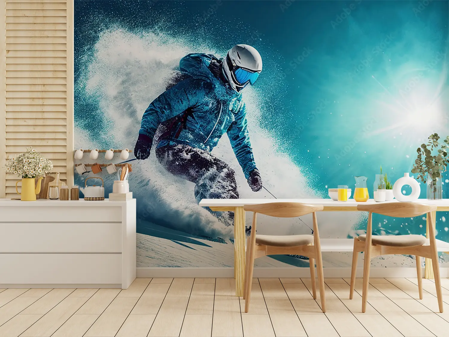 Transform your space with the exhilarating beauty of a skier gliding down a snowy mountain under a bright sun. This captivating image captures the essence of outdoor adventure and winter sports, adding a dynamic touch to your home decor. Complementary colors include shades of blue, white, and grey to evoke a sense of freshness and tranquility.