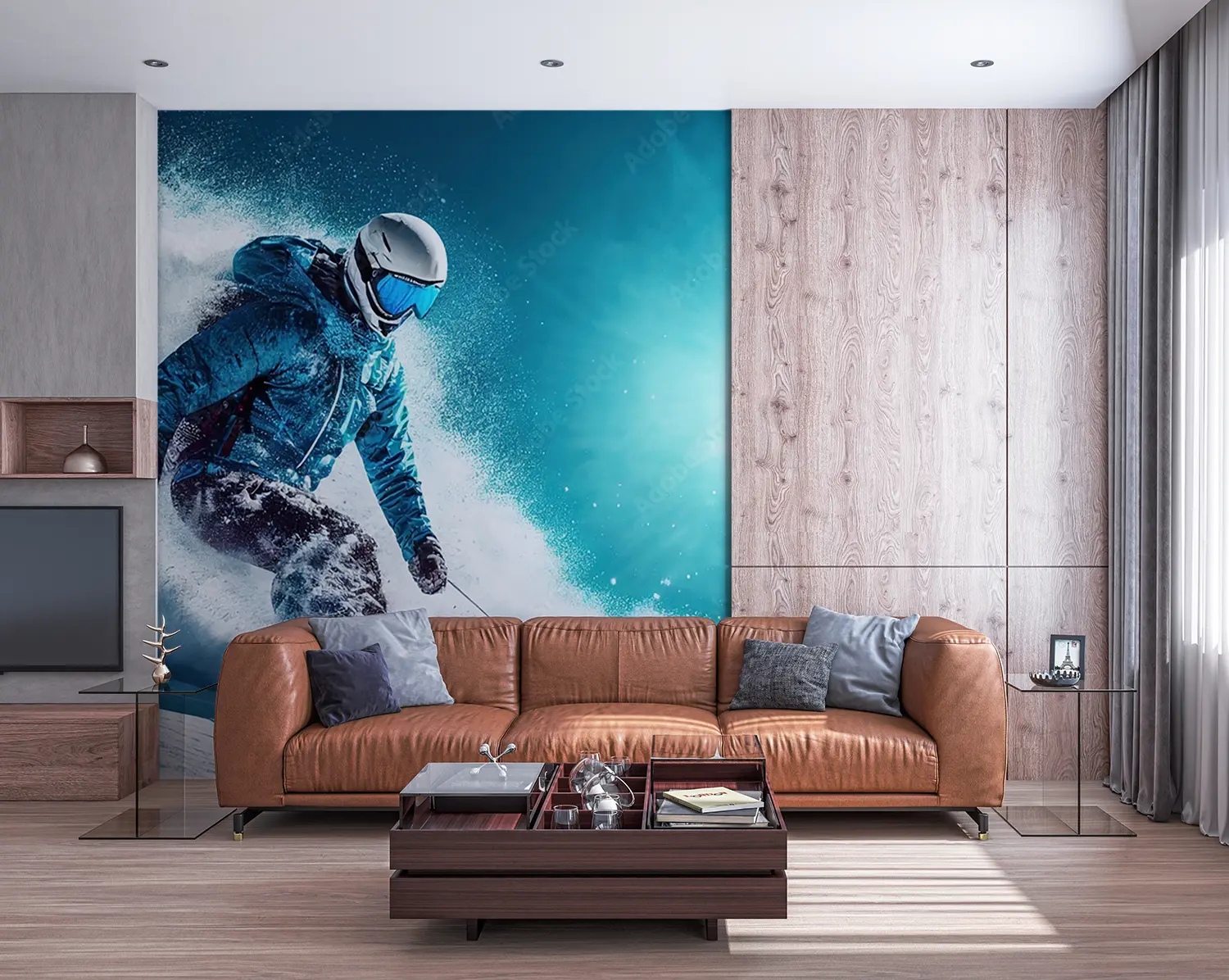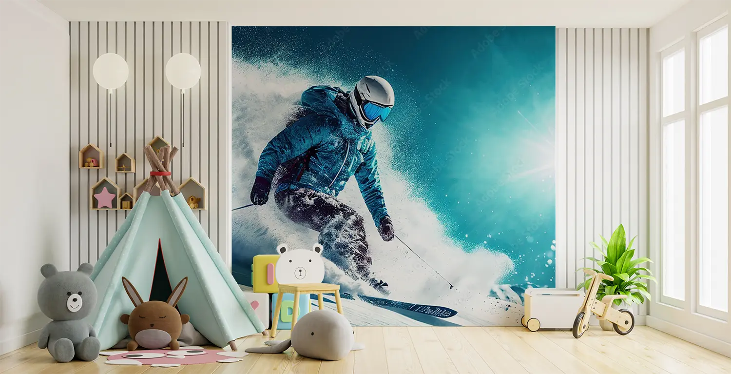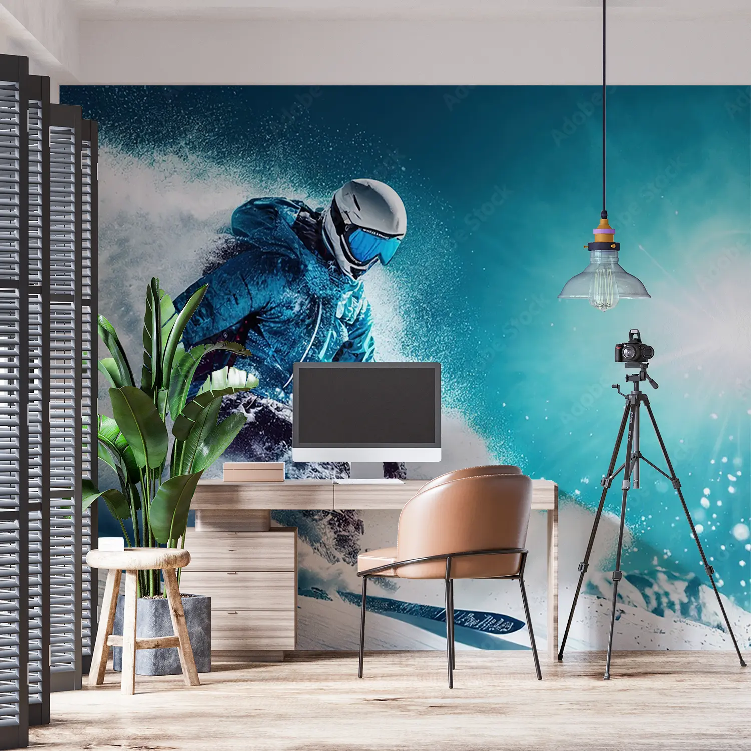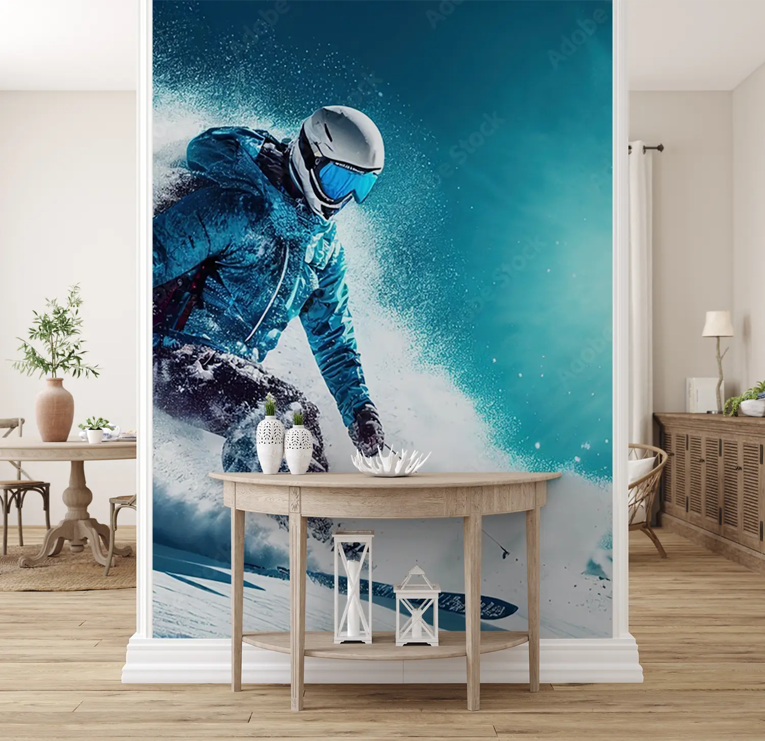 Transform your space with the exhilarating beauty of a skier gliding down a snowy mountain under a bright sun. This captivating image captures the essence of outdoor adventure and winter sports, adding a dynamic touch to your home decor. Complementary colors include shades of blue, white, and grey to evoke a sense of freshness and tranquility.