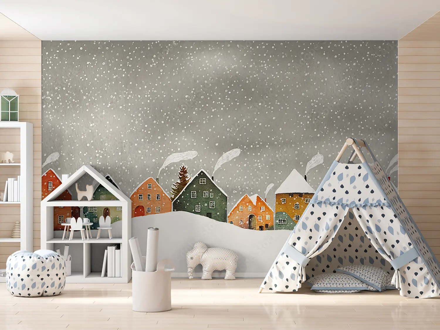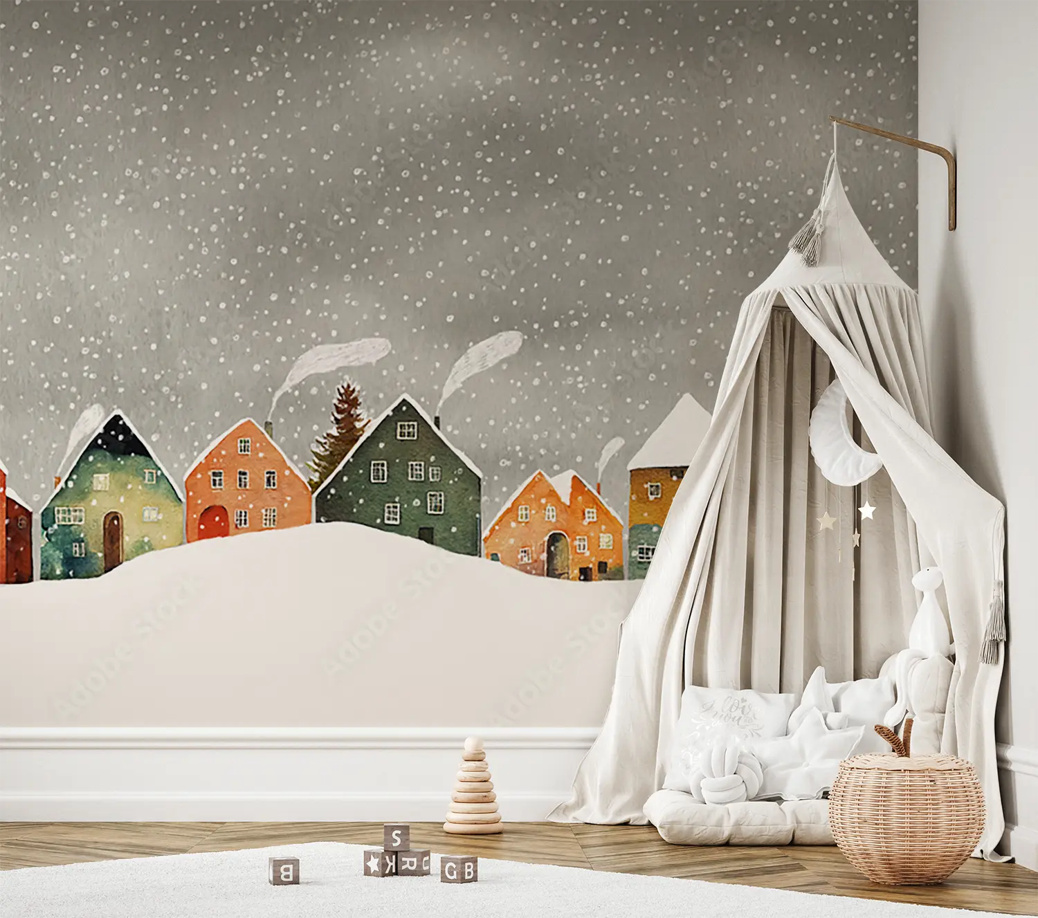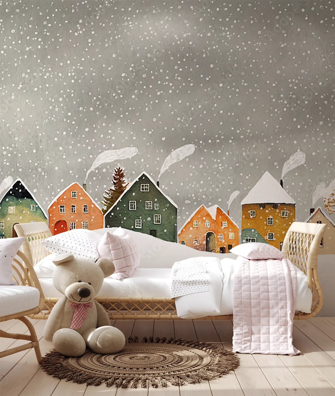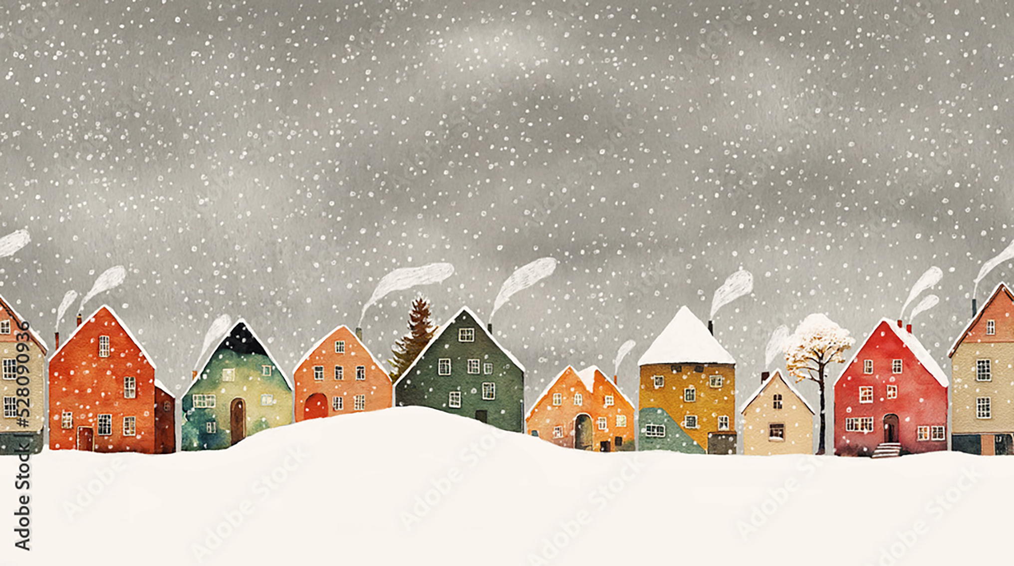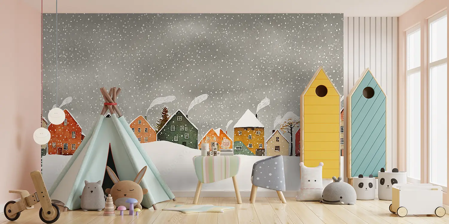 Transform your living space with this enchanting wall art featuring a charming row of houses in a snowy setting. The serene sky background adds a touch of tranquility to any room. Complementary colors to consider for your decor include warm browns, soft whites, and accents of deep red for a cozy and inviting atmosphere. Upgrade your home with this picturesque winter scene.