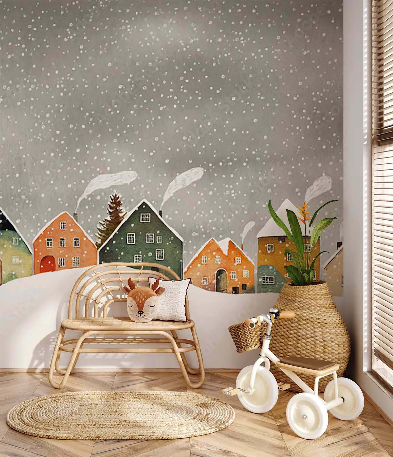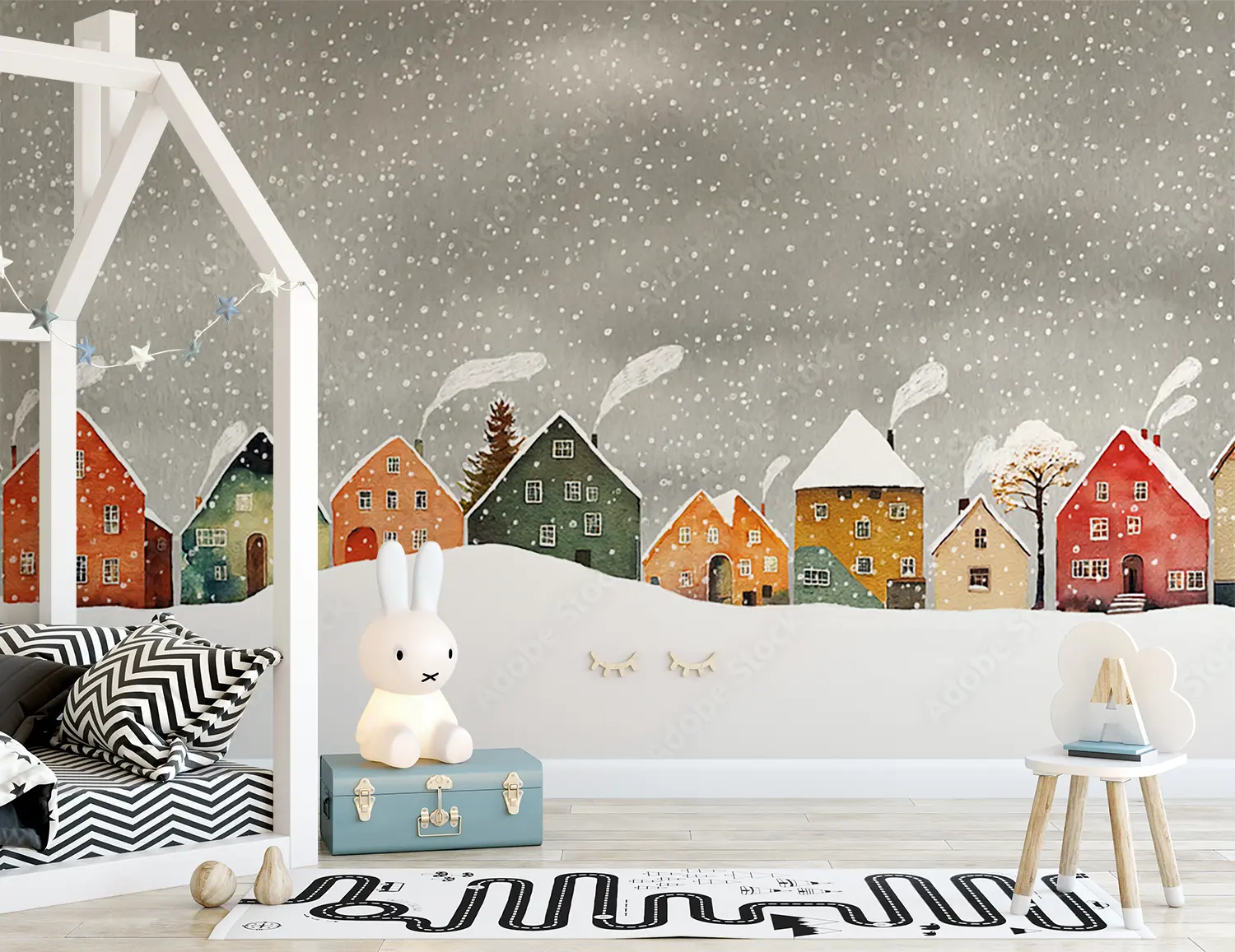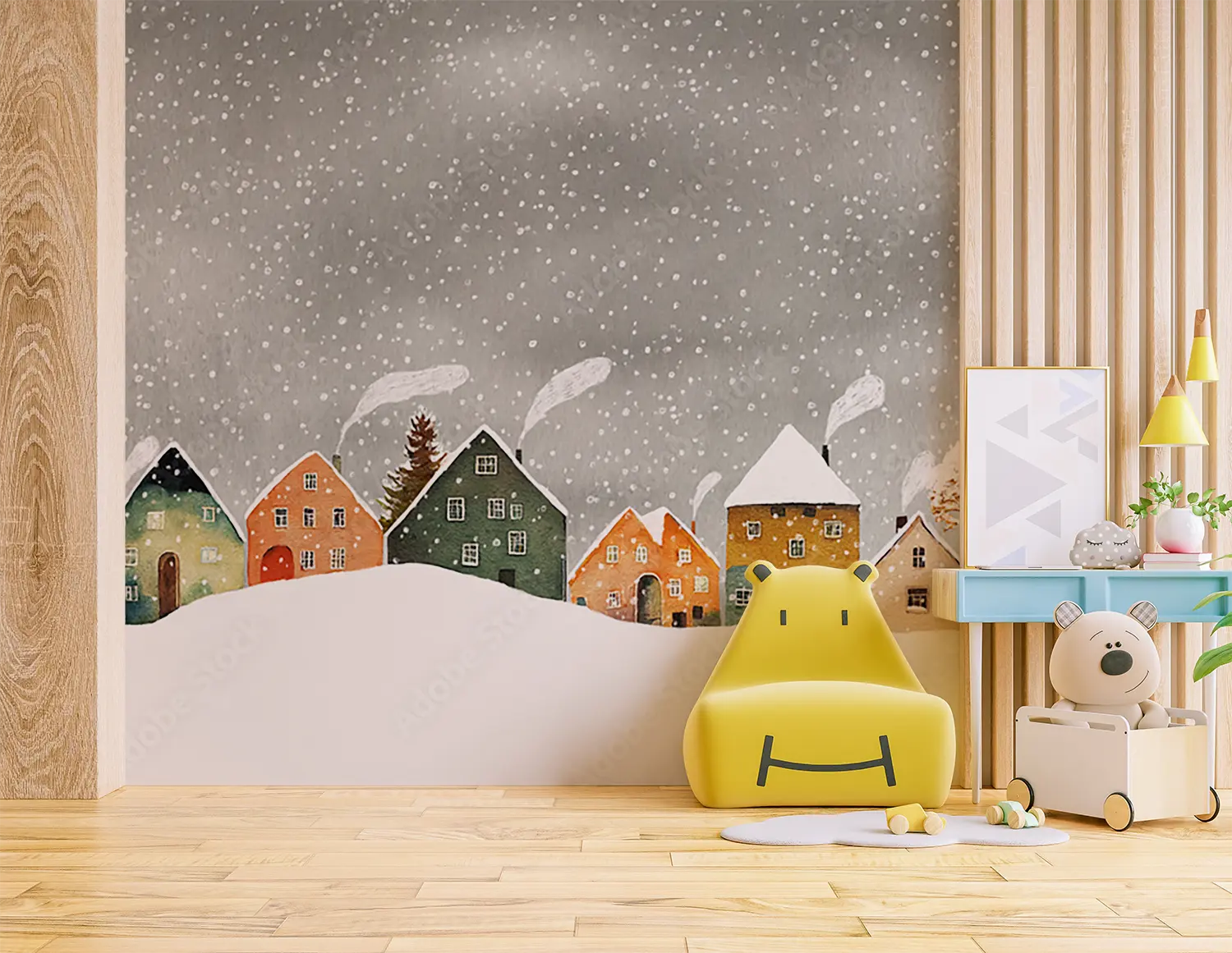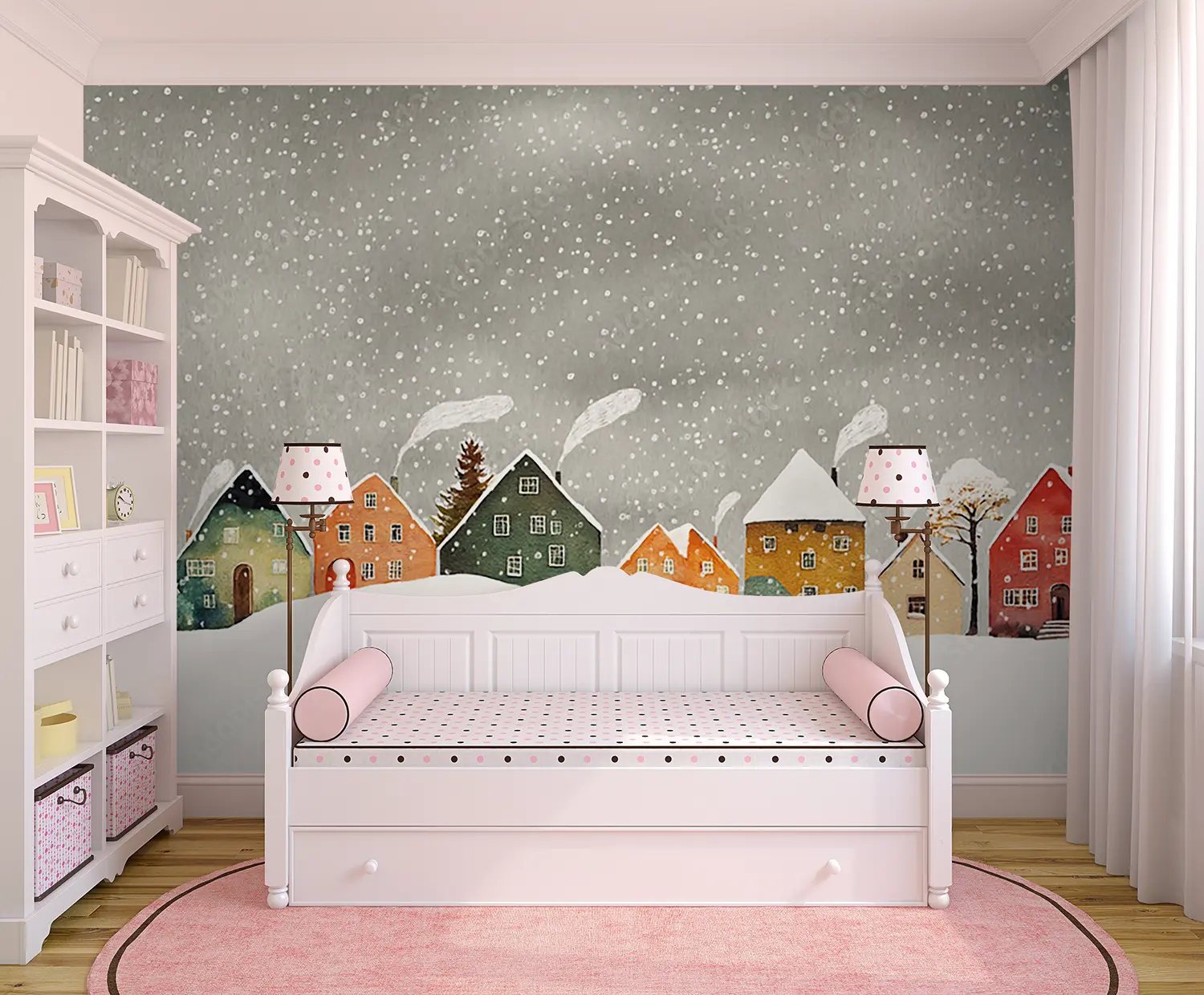 Transform your living space with this enchanting wall art featuring a charming row of houses in a snowy setting. The serene sky background adds a touch of tranquility to any room. Complementary colors to consider for your decor include warm browns, soft whites, and accents of deep red for a cozy and inviting atmosphere. Upgrade your home with this picturesque winter scene.