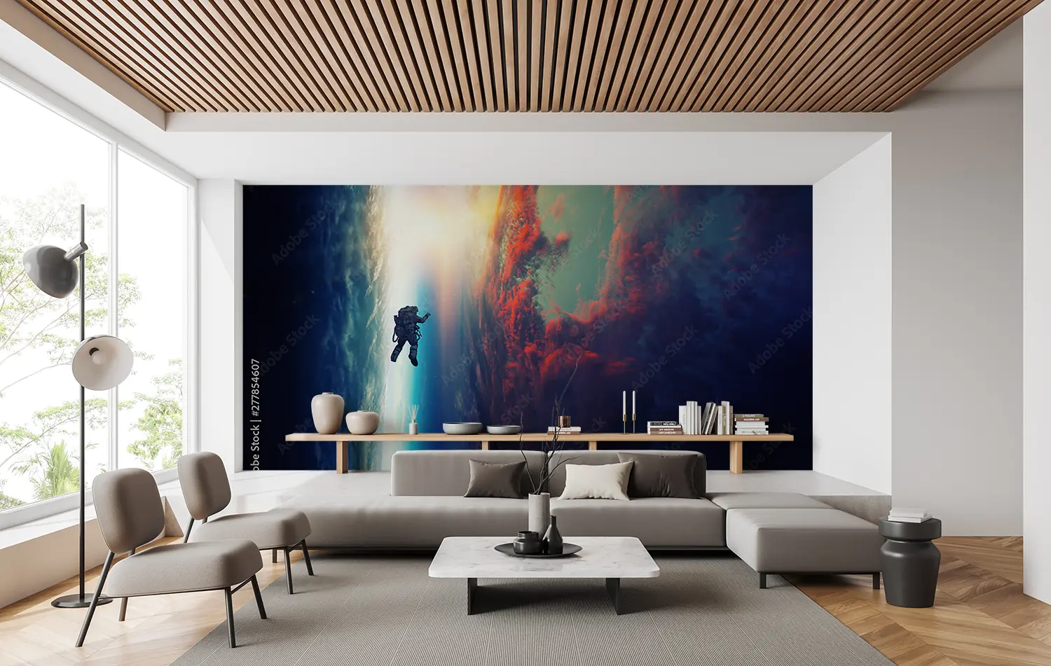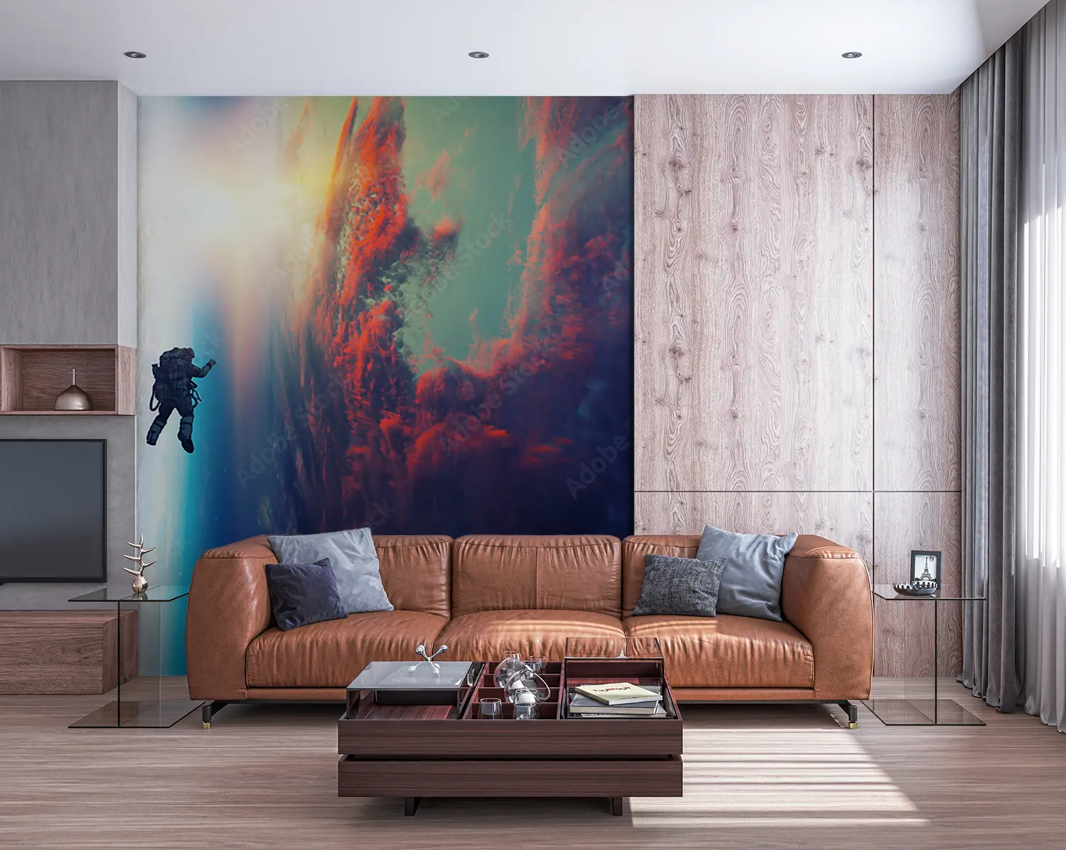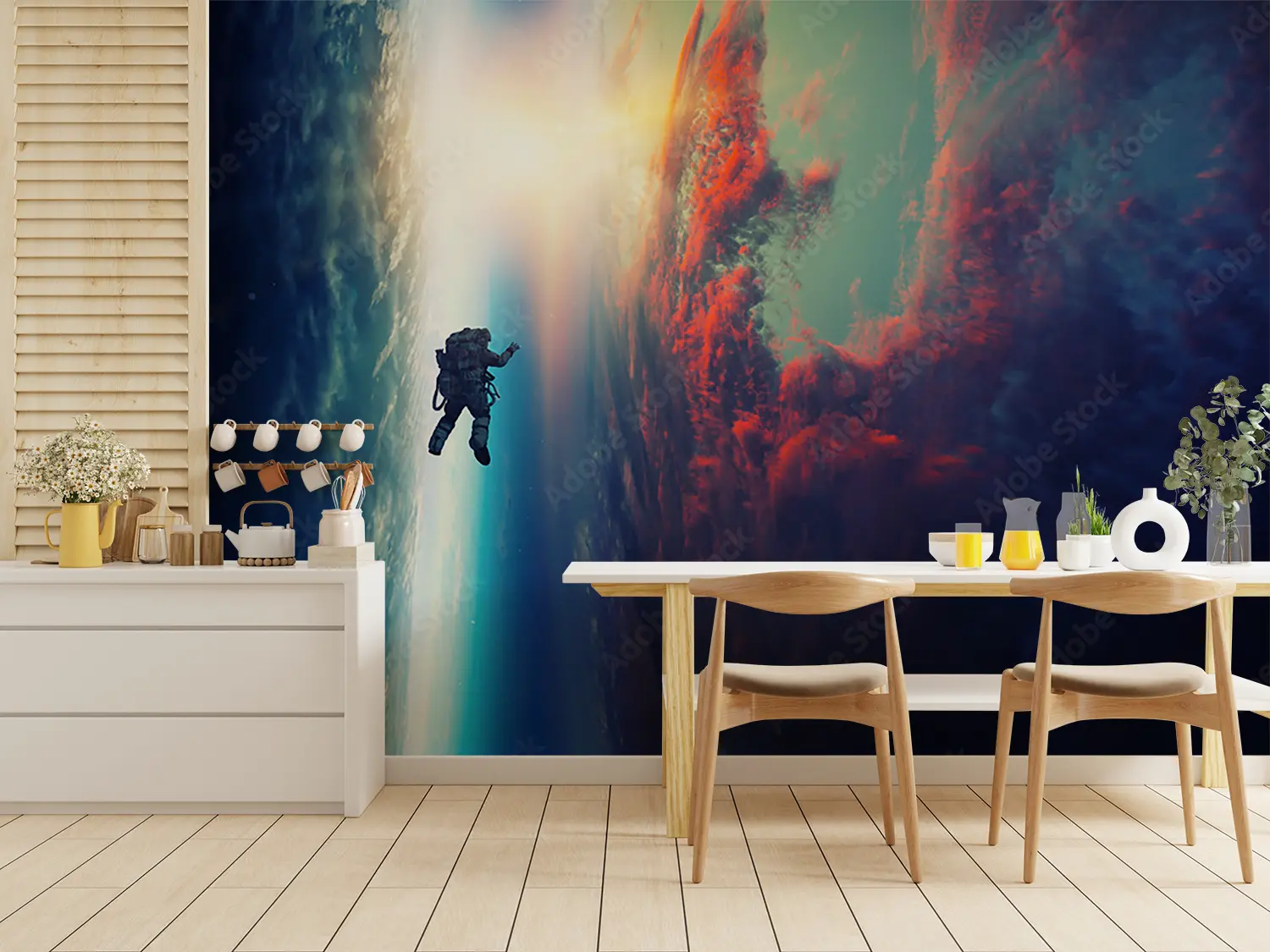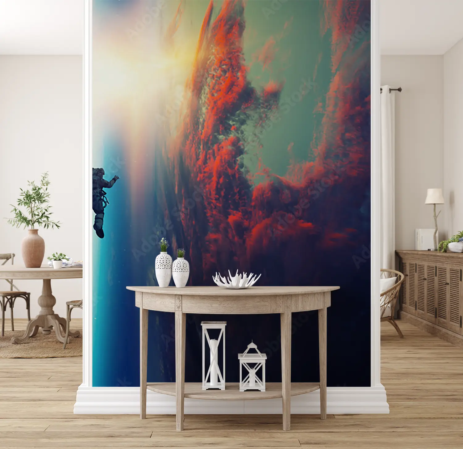 Transform your space with this captivating image of a man in a space suit floating in the air. This mural adds an adventurous and futuristic touch to any room, perfect for space enthusiasts or those seeking a unique decor element. Complementary colors like deep navy blue, silver, and hints of red can enhance the cosmic atmosphere of this artwork.