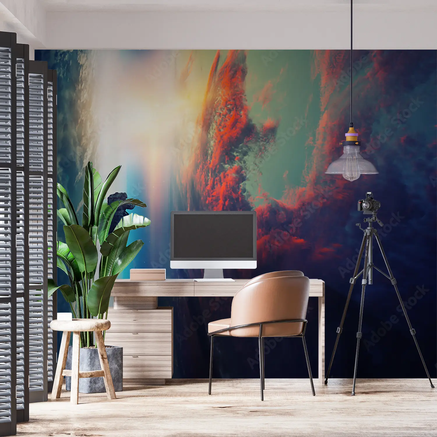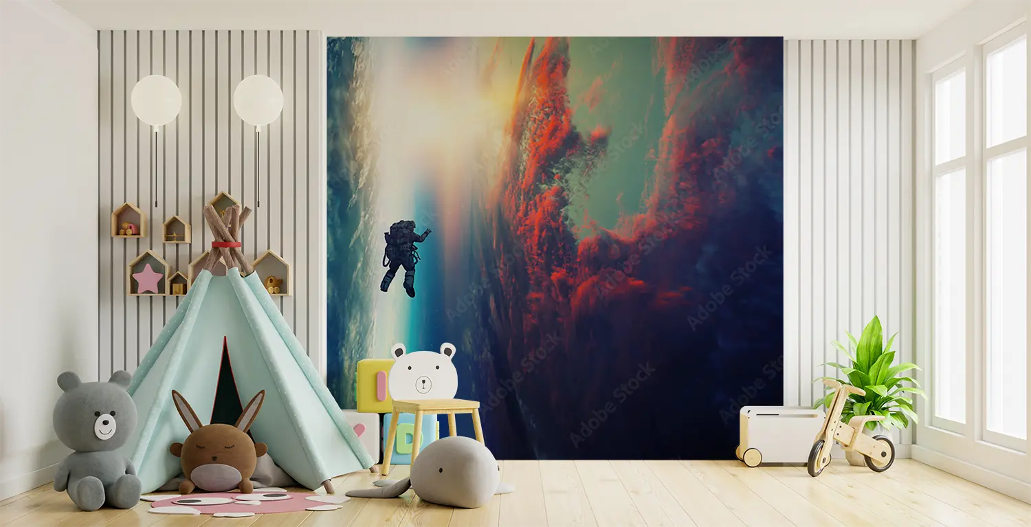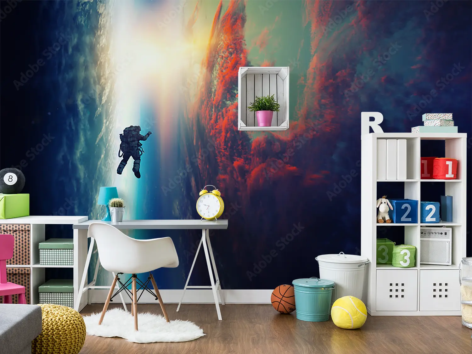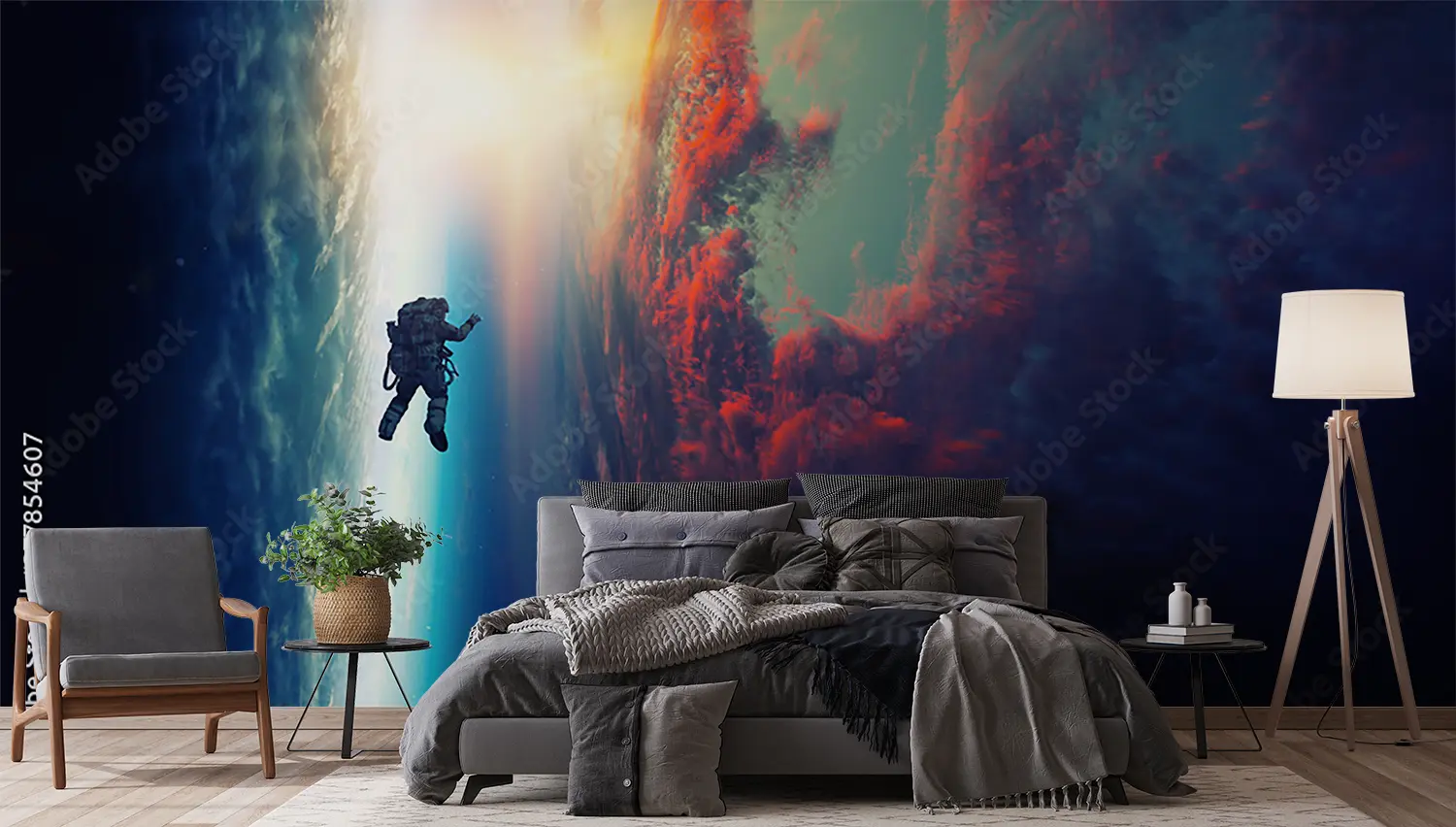 Transform your space with this captivating image of a man in a space suit floating in the air. This mural adds an adventurous and futuristic touch to any room, perfect for space enthusiasts or those seeking a unique decor element. Complementary colors like deep navy blue, silver, and hints of red can enhance the cosmic atmosphere of this artwork.