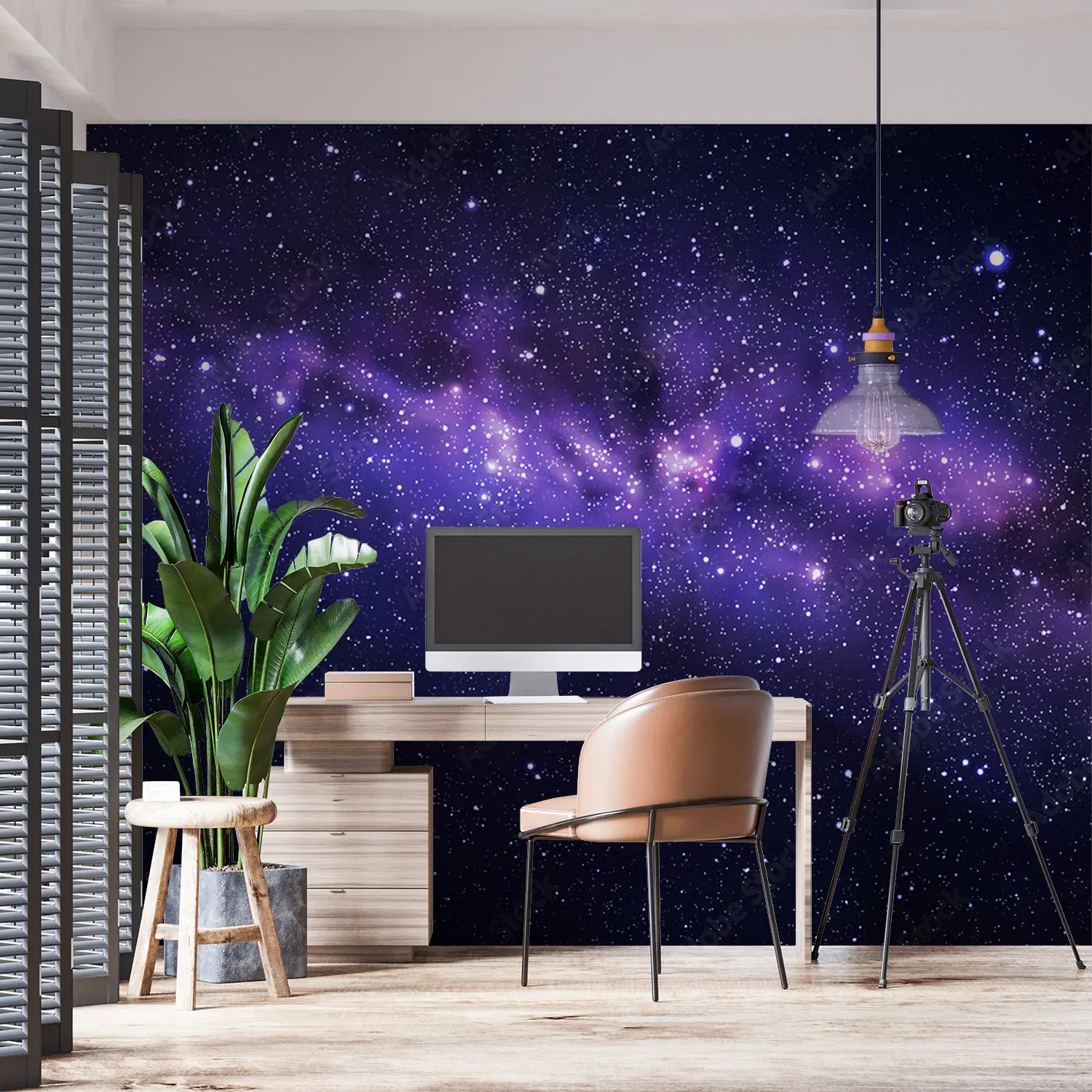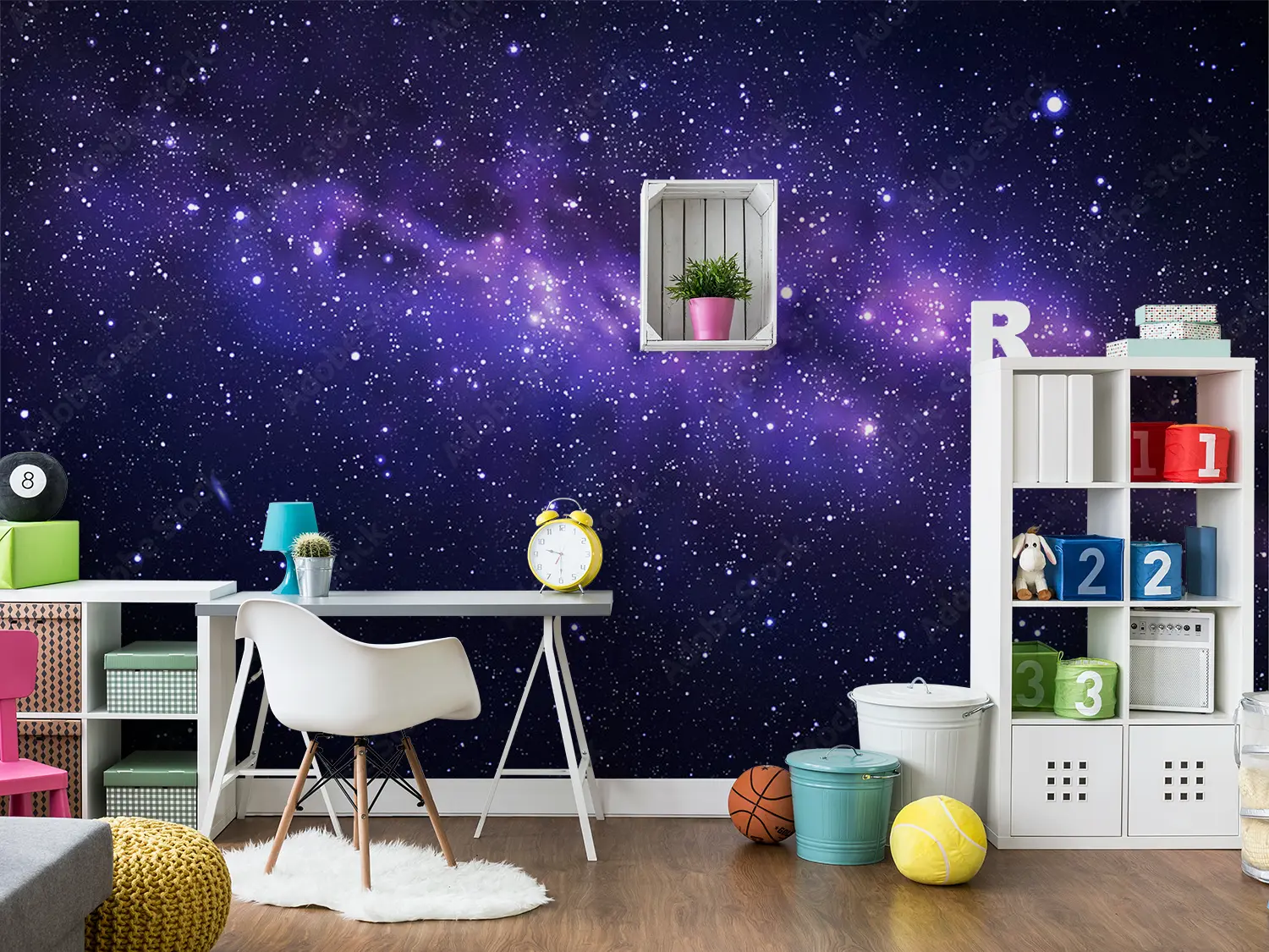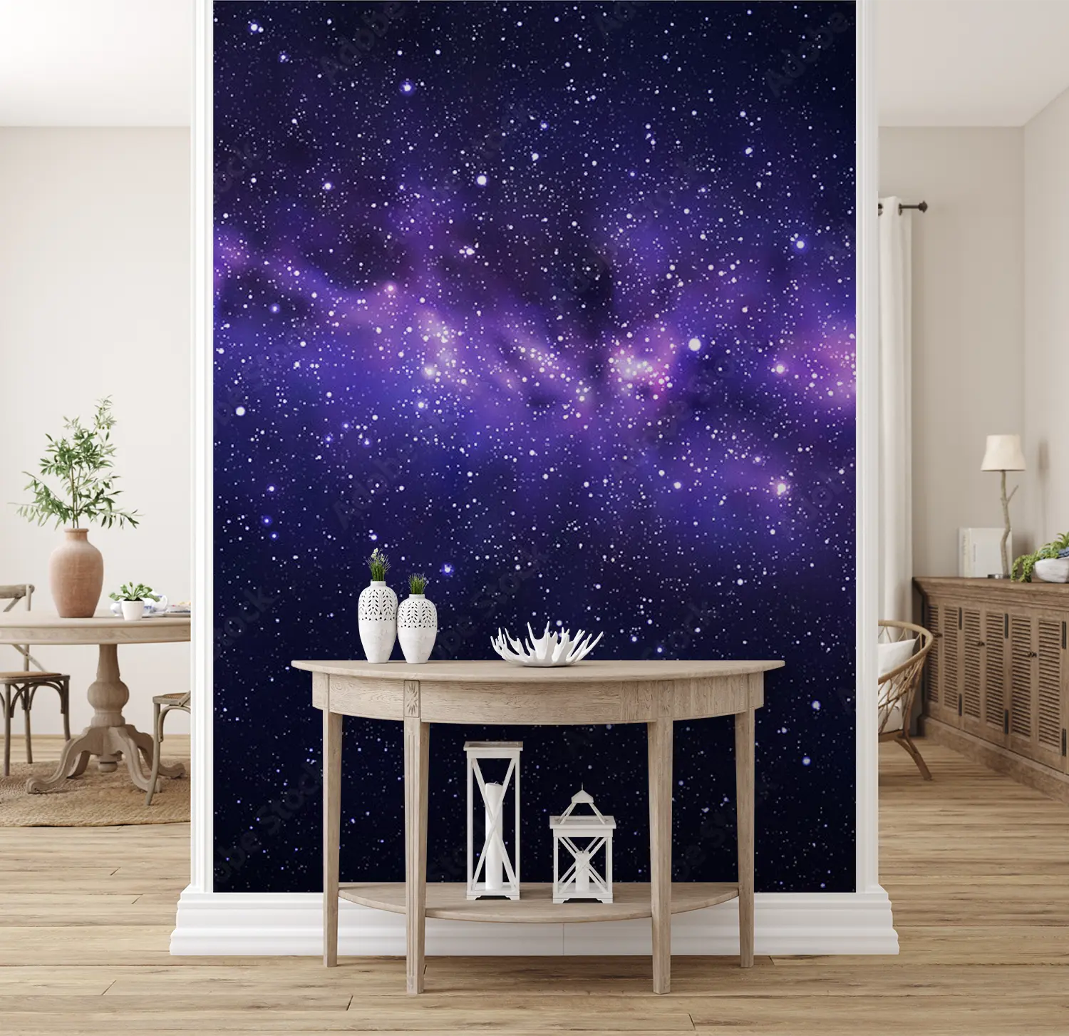 Transform your space with this captivating purple galaxy wall art featuring a mesmerizing display of stars against a deep black background. Add a touch of cosmic beauty to your home decor with this stunning piece. Complementary colors to consider are deep blues, soft purples, and rich blacks for a cohesive and enchanting aesthetic.