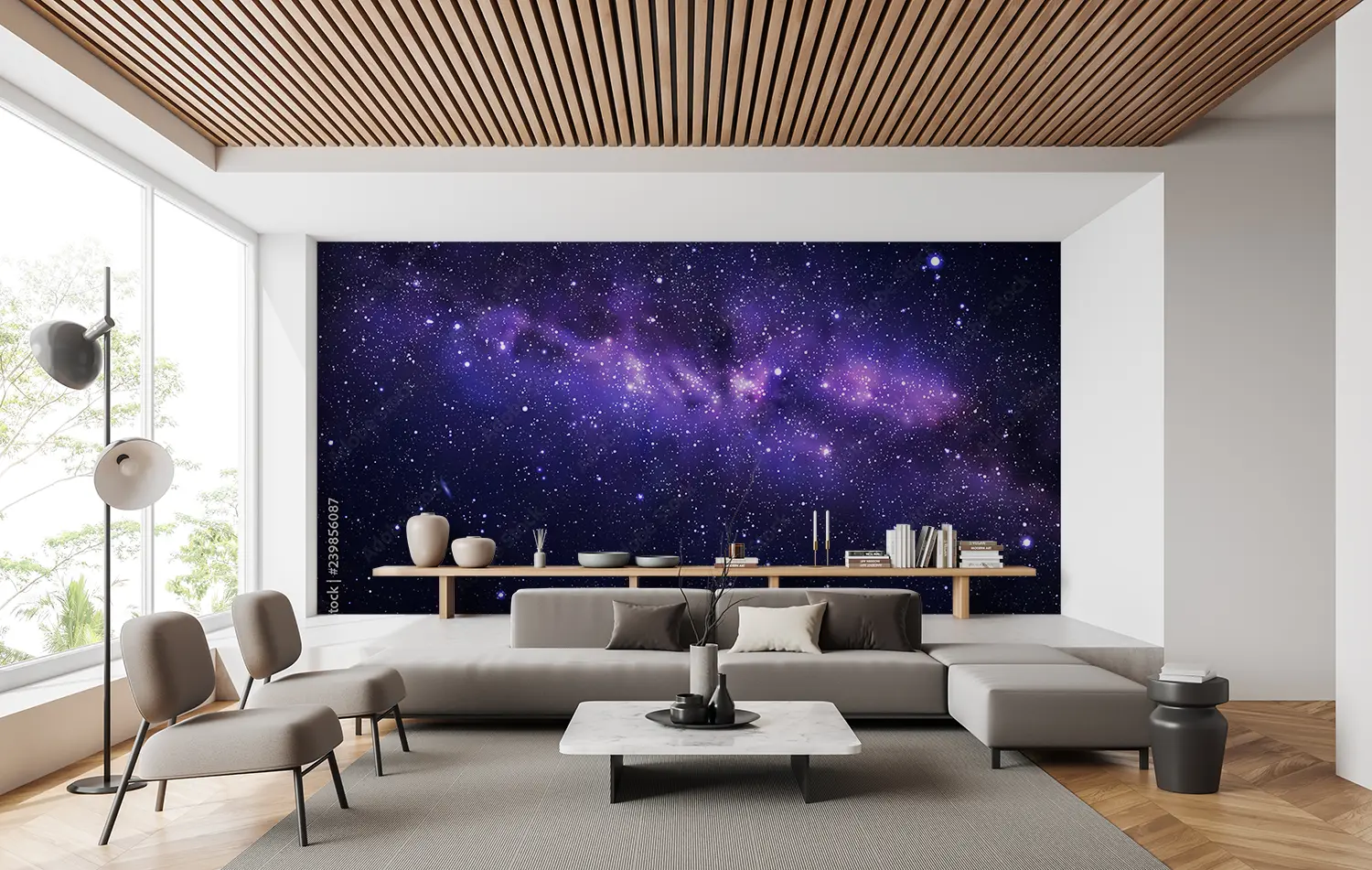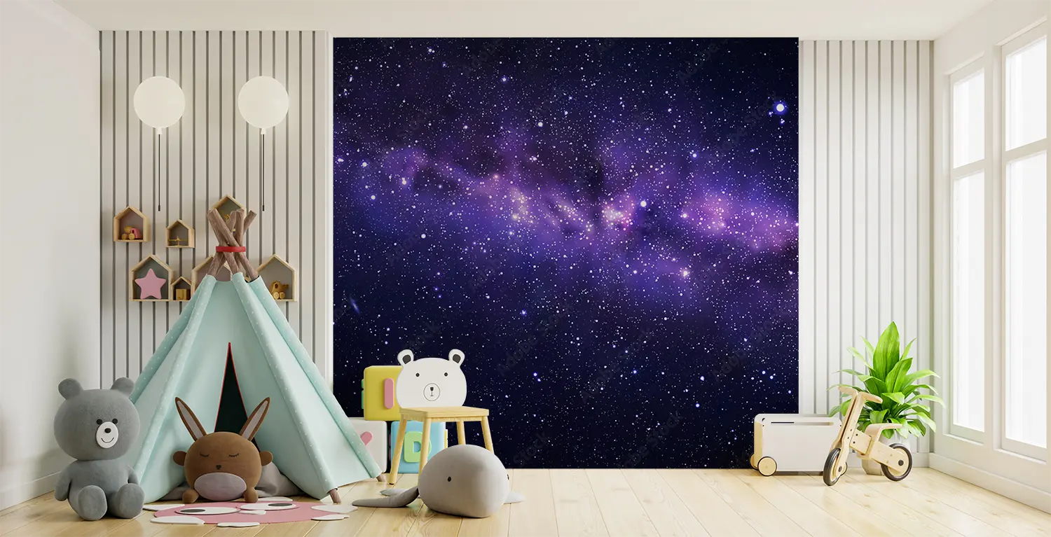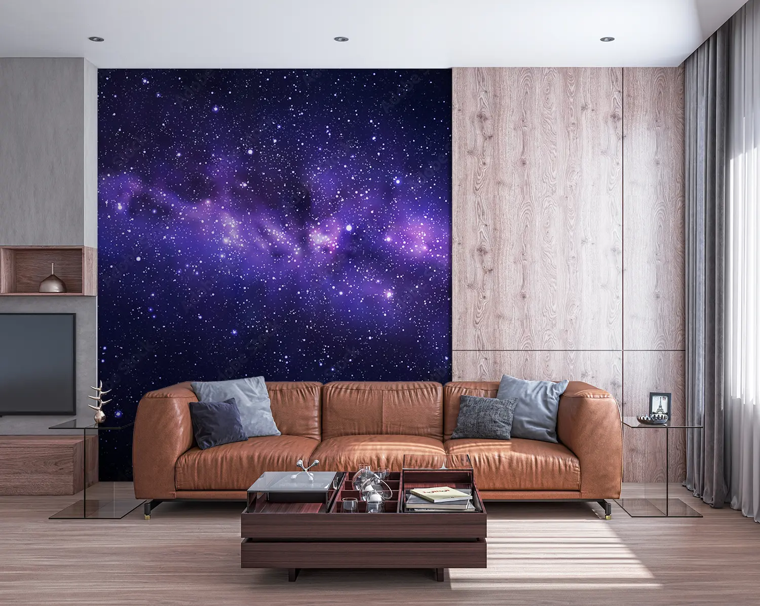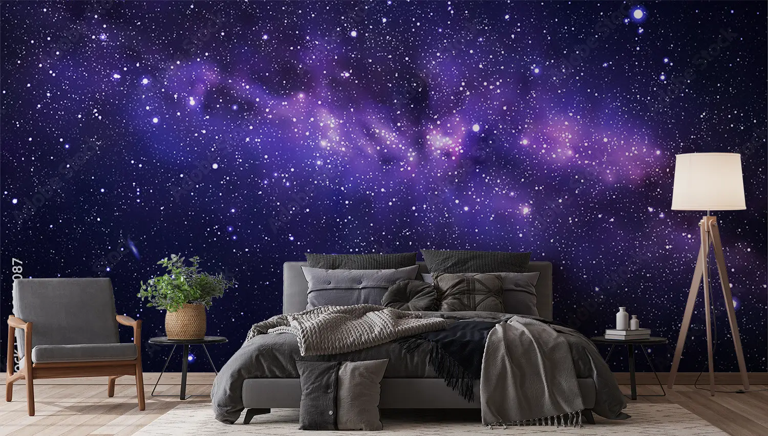 Transform your space with this captivating purple galaxy wall art featuring a mesmerizing display of stars against a deep black background. Add a touch of cosmic beauty to your home decor with this stunning piece. Complementary colors to consider are deep blues, soft purples, and rich blacks for a cohesive and enchanting aesthetic.