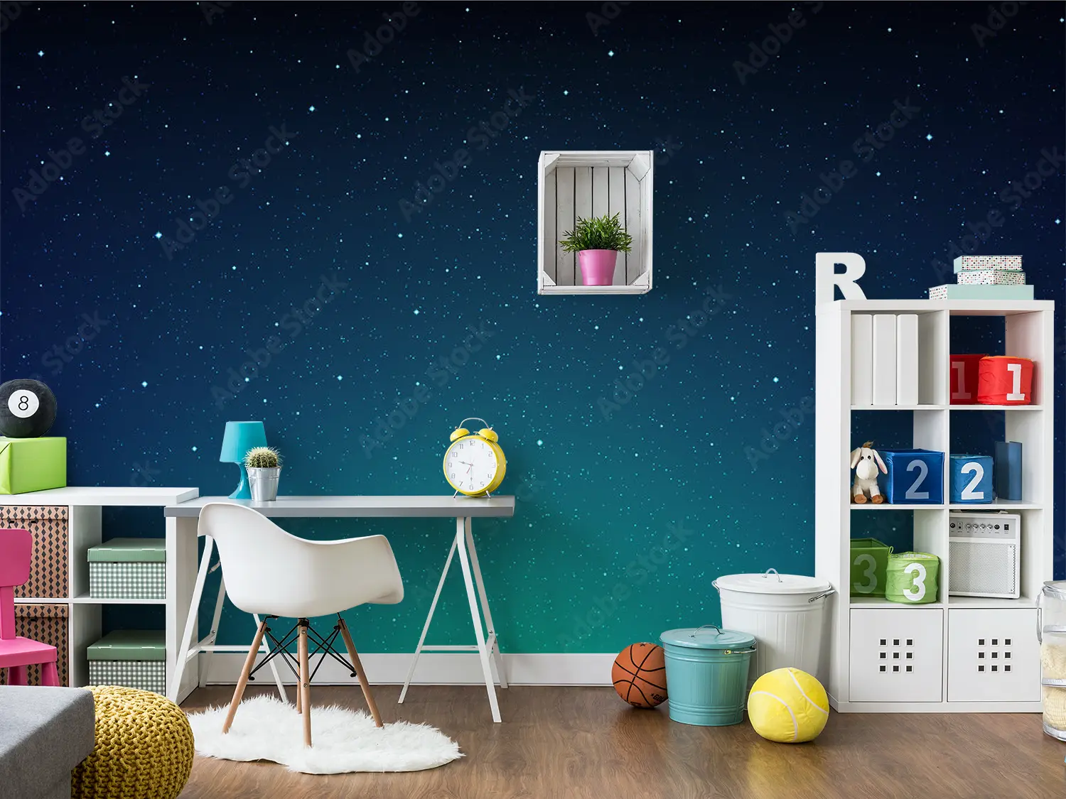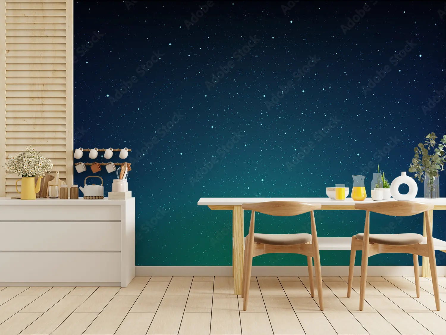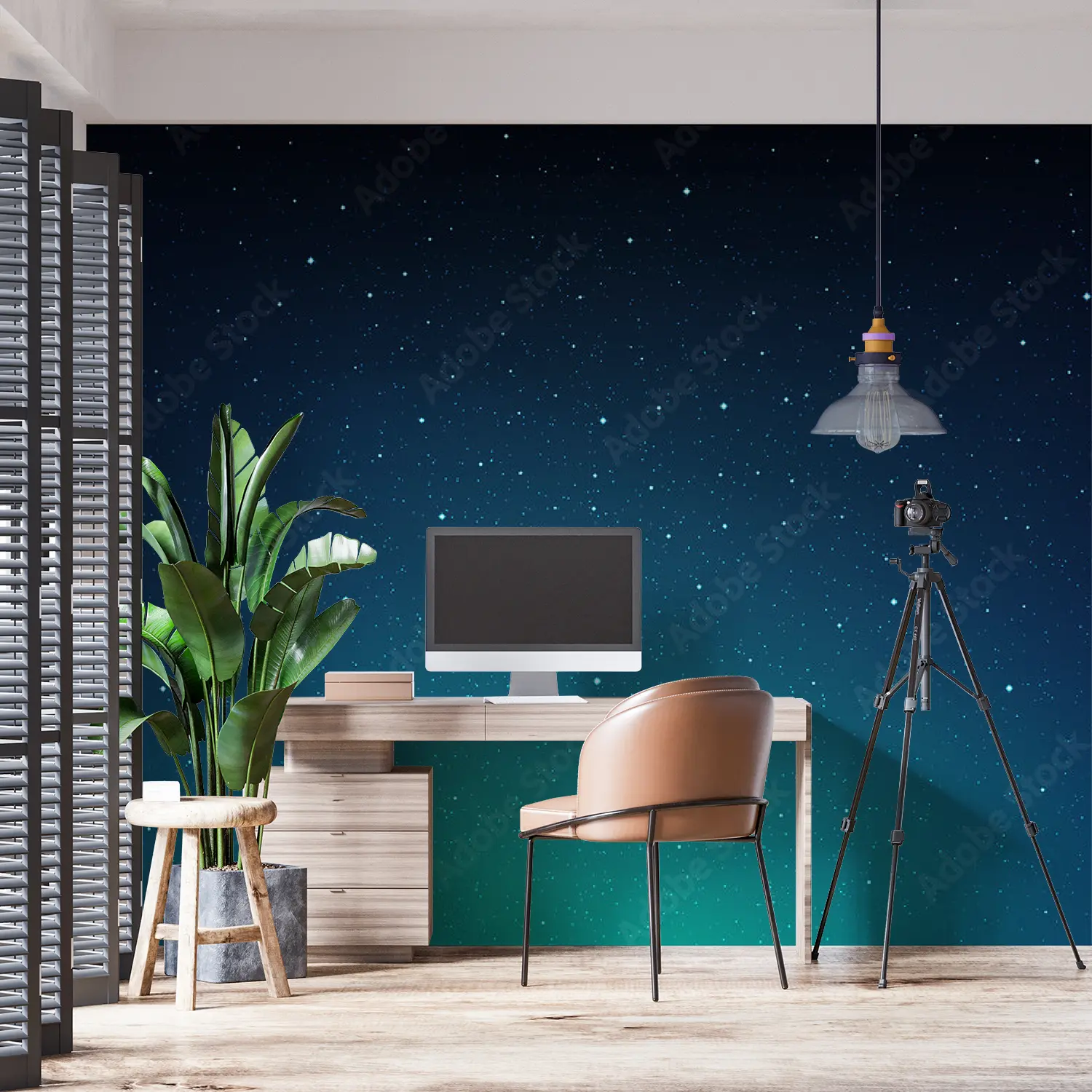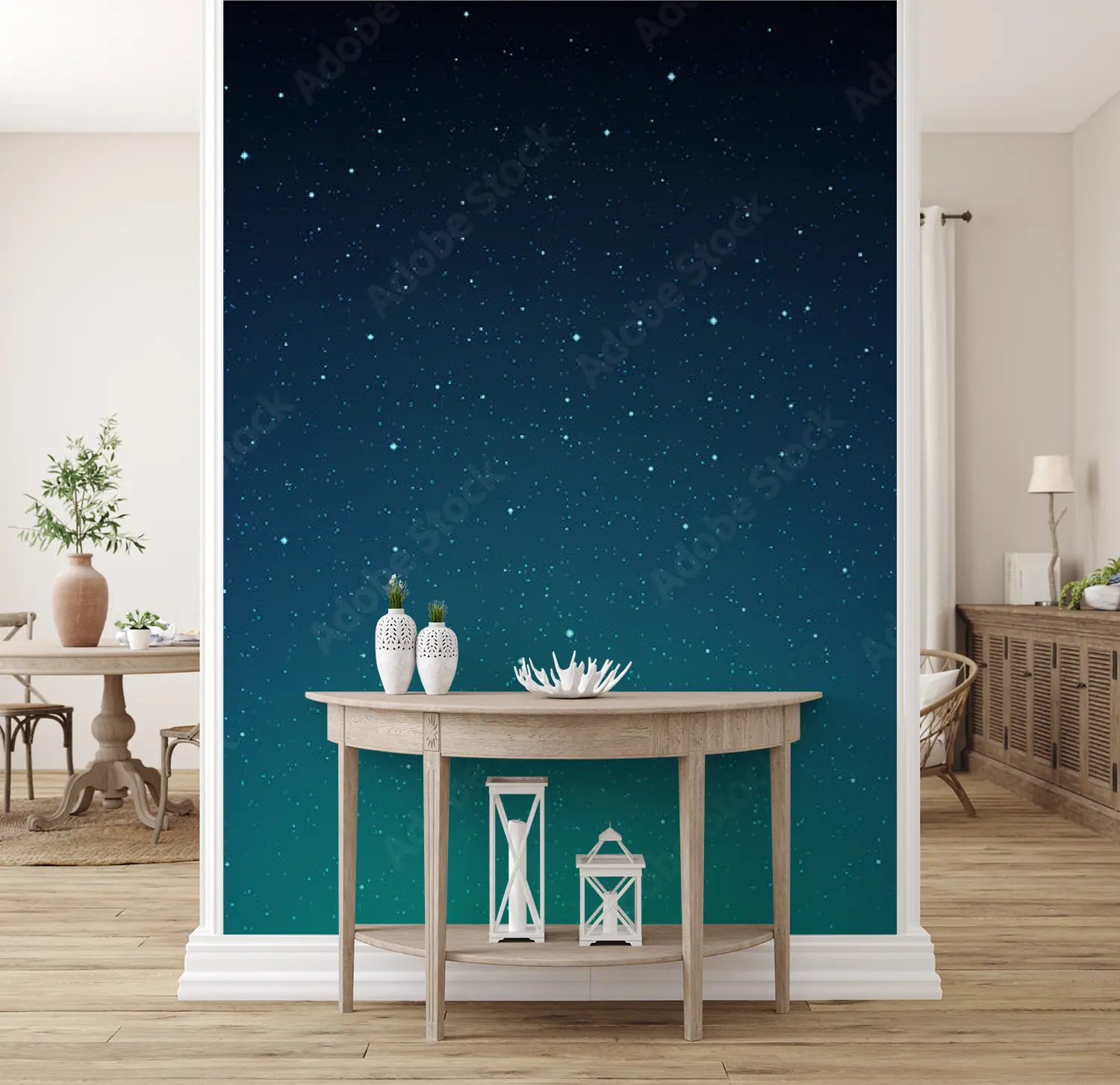 Transform your space with a mesmerizing wall art featuring a serene blue sky filled with twinkling stars against a lush green background. This captivating piece adds a touch of whimsy and tranquility to any room, creating a dreamy atmosphere. Complementary colors to consider for accents include deep navy blue, emerald green, and shimmering silver.