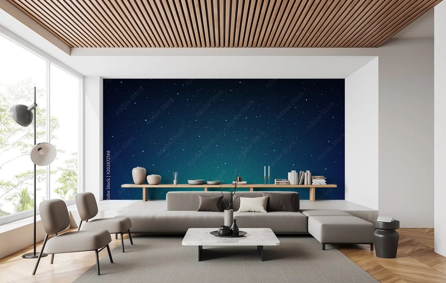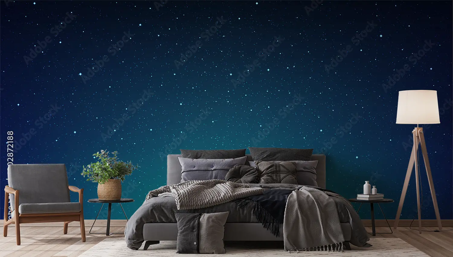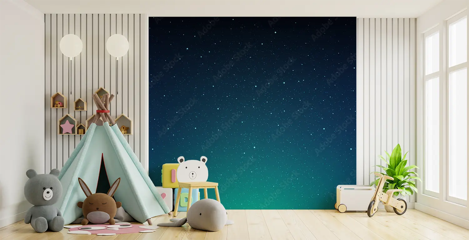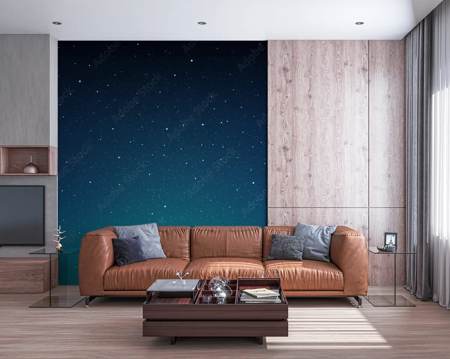 Transform your space with a mesmerizing wall art featuring a serene blue sky filled with twinkling stars against a lush green background. This captivating piece adds a touch of whimsy and tranquility to any room, creating a dreamy atmosphere. Complementary colors to consider for accents include deep navy blue, emerald green, and shimmering silver.