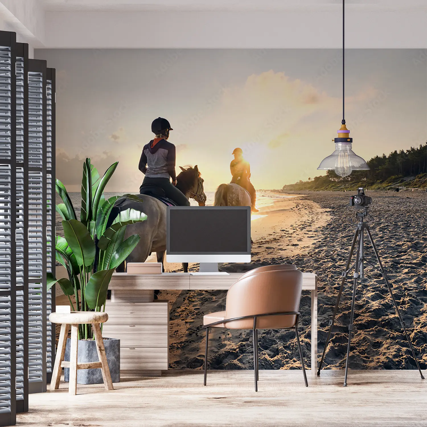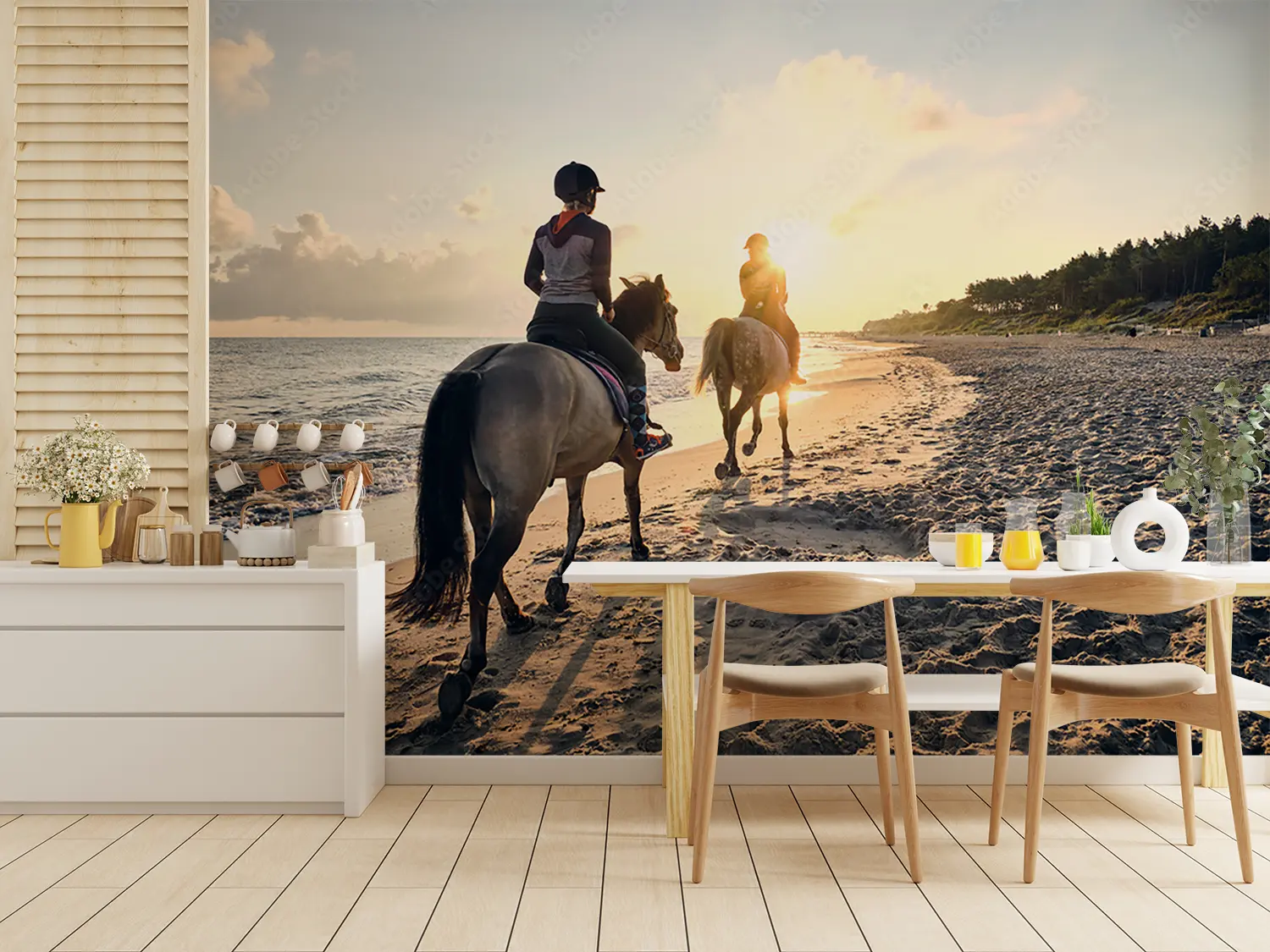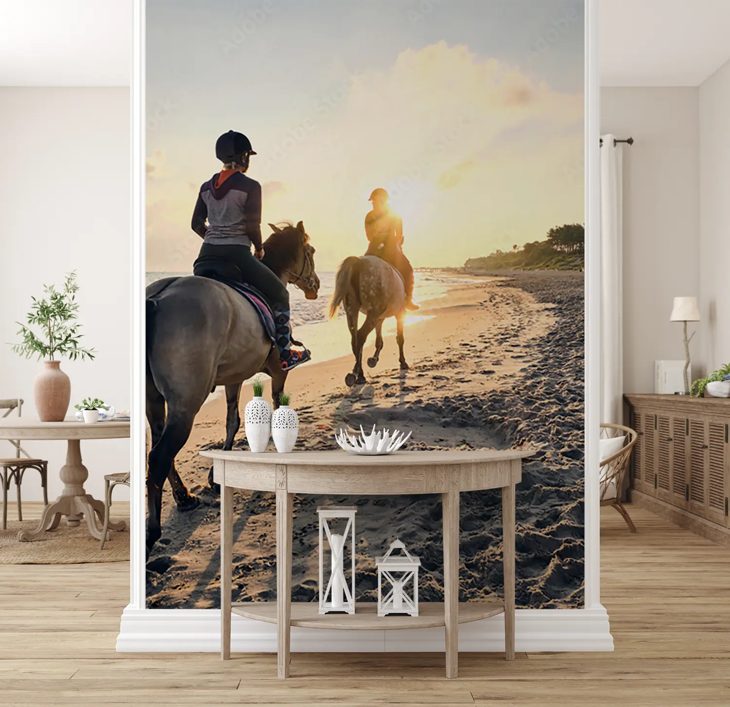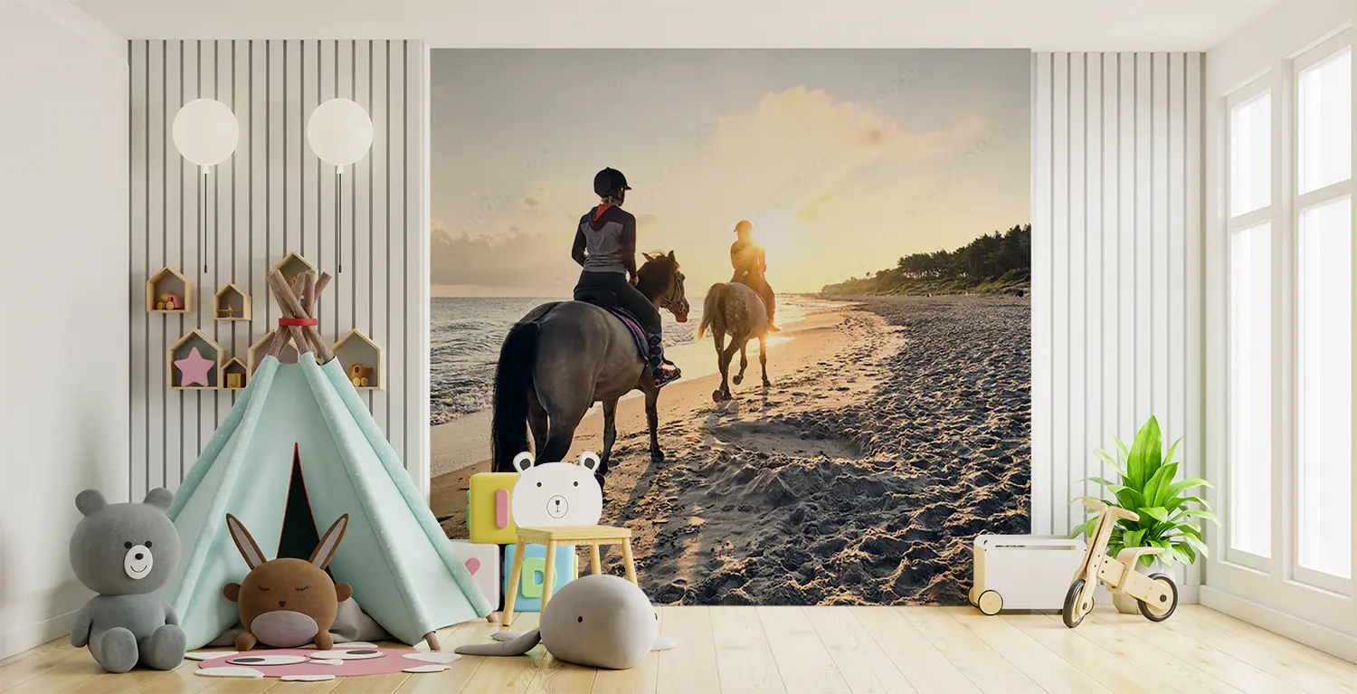 Immerse yourself in the serene beauty of a sunset beach horse riding scene with two figures gracefully trotting along the shore. This captivating image brings the tranquility of nature into your home decor, evoking a sense of wanderlust and relaxation. Complementary colors include sandy beige, deep navy blue, and soft grey to enhance the calming aesthetic of this picturesque artwork.