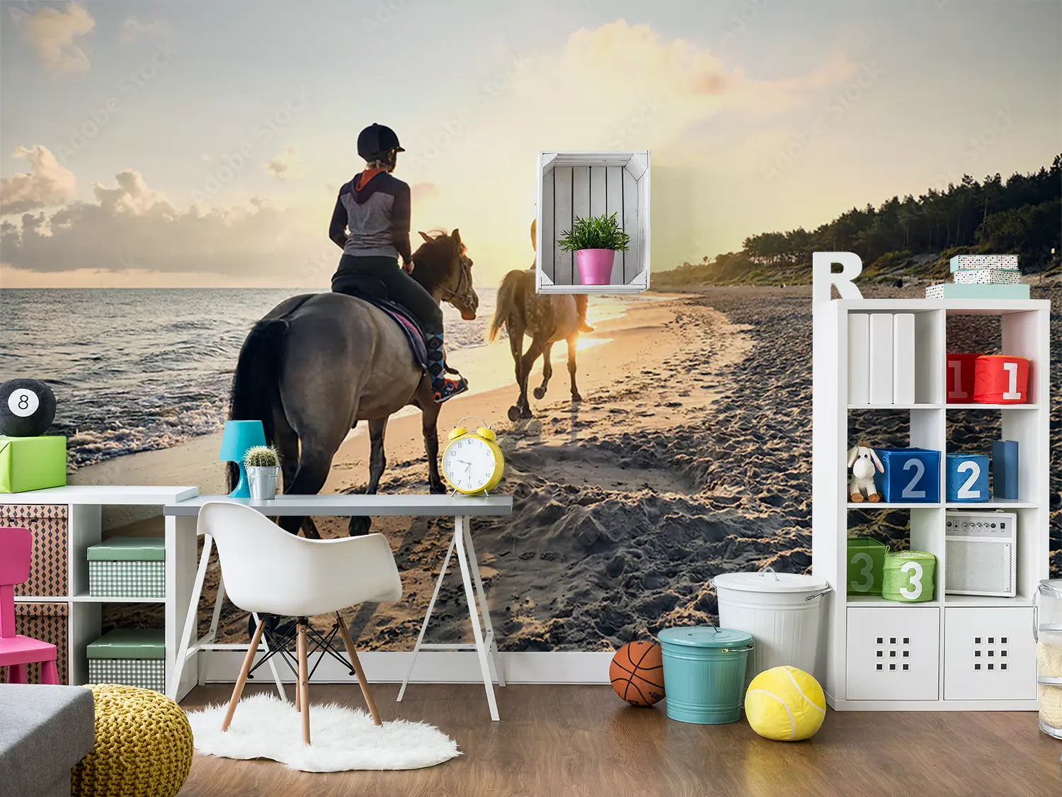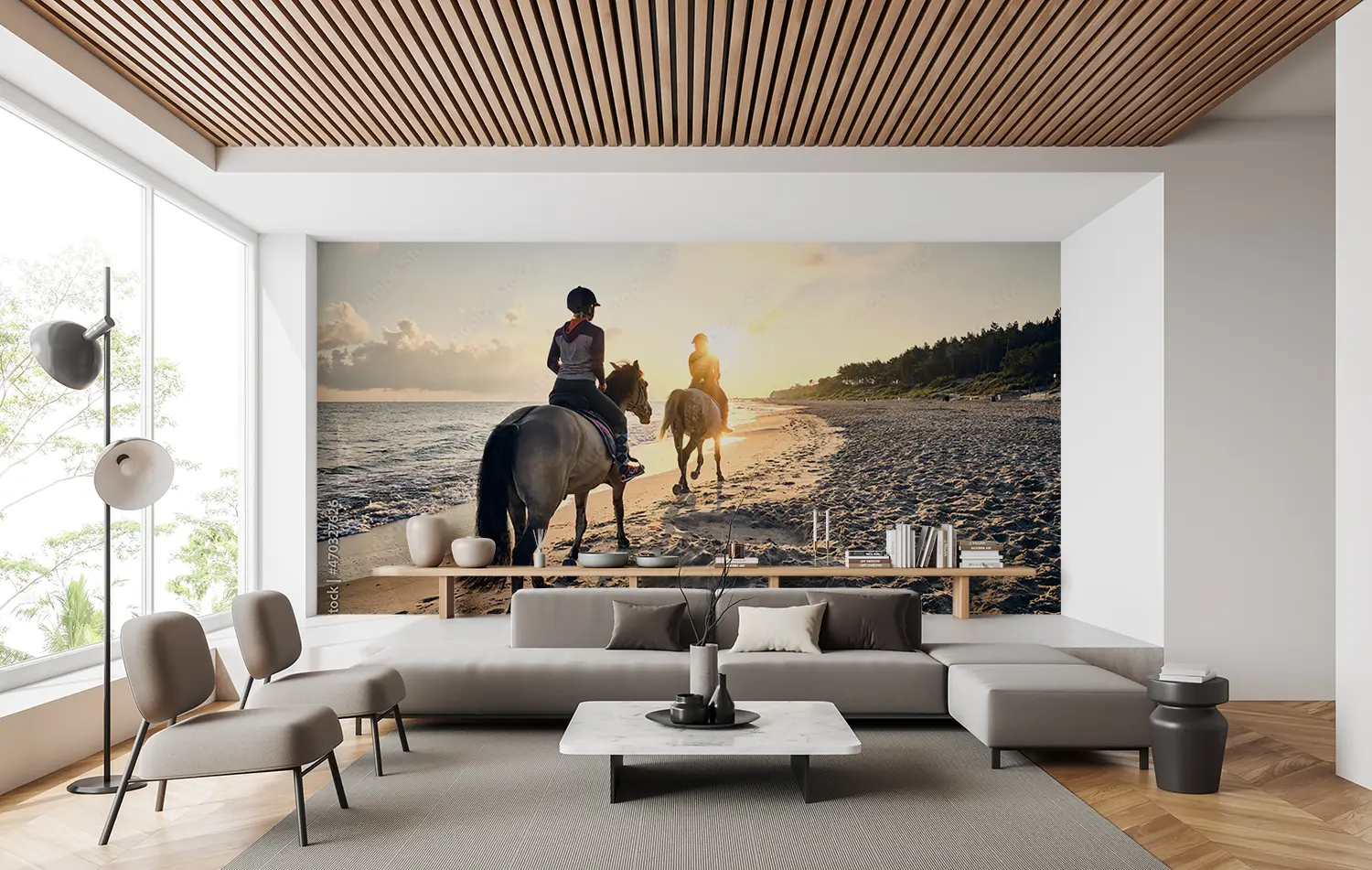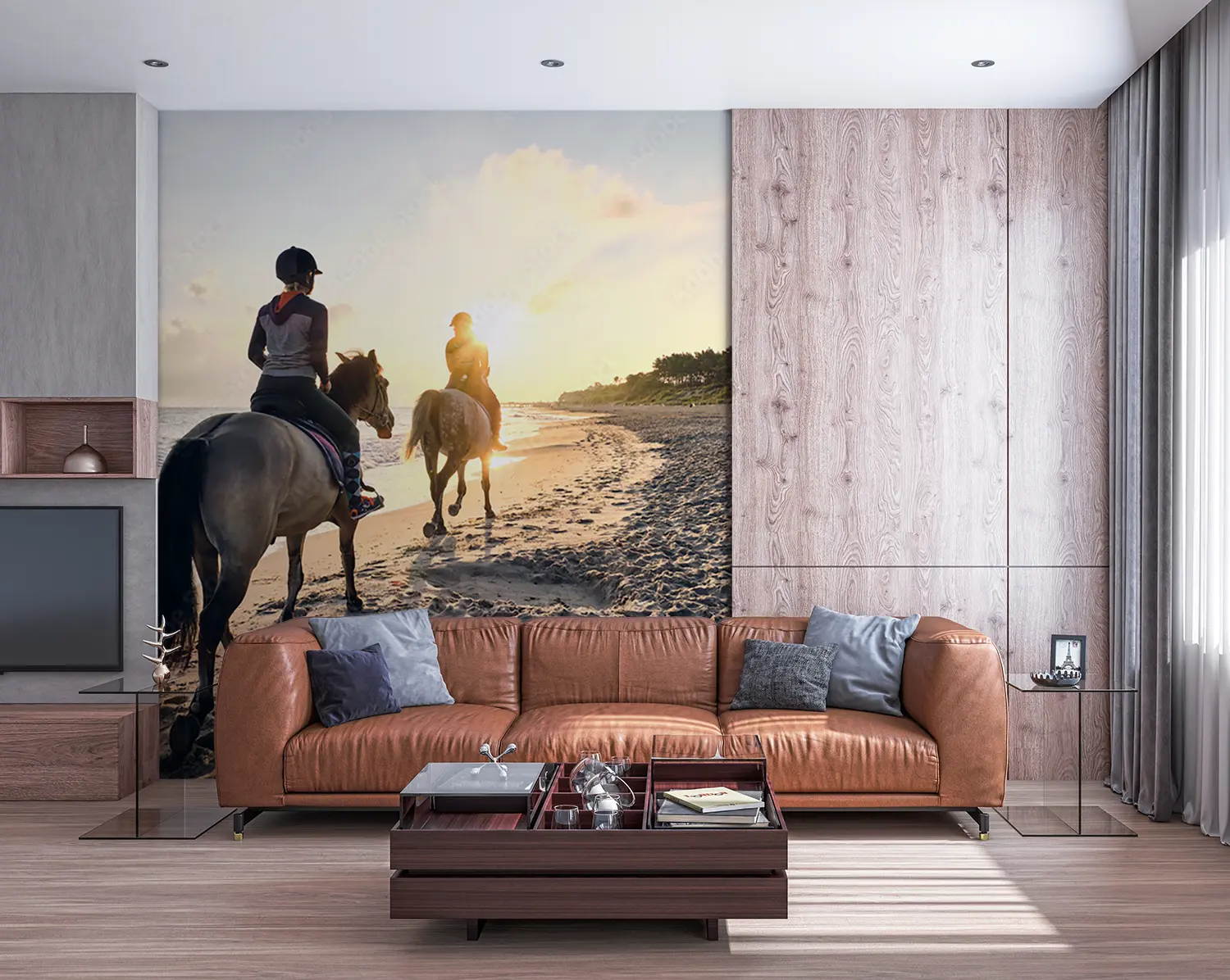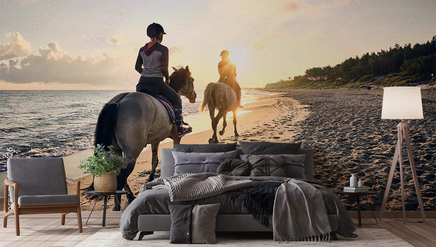Immerse yourself in the serene beauty of a sunset beach horse riding scene with two figures gracefully trotting along the shore. This captivating image brings the tranquility of nature into your home decor, evoking a sense of wanderlust and relaxation. Complementary colors include sandy beige, deep navy blue, and soft grey to enhance the calming aesthetic of this picturesque artwork.