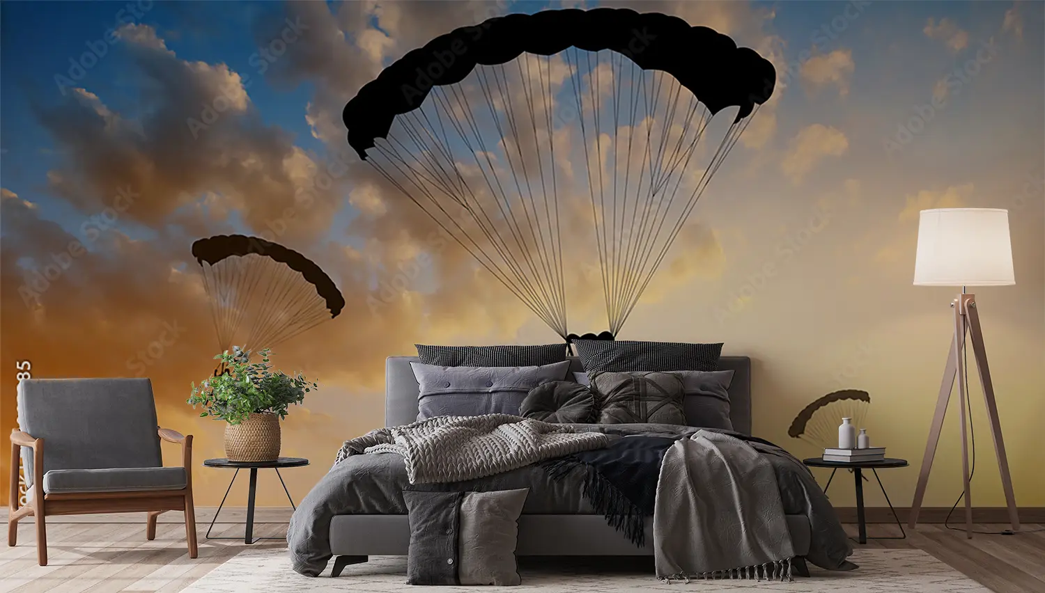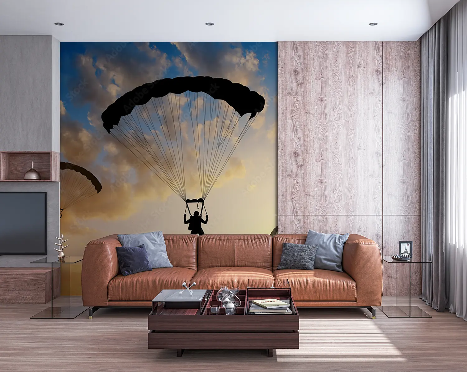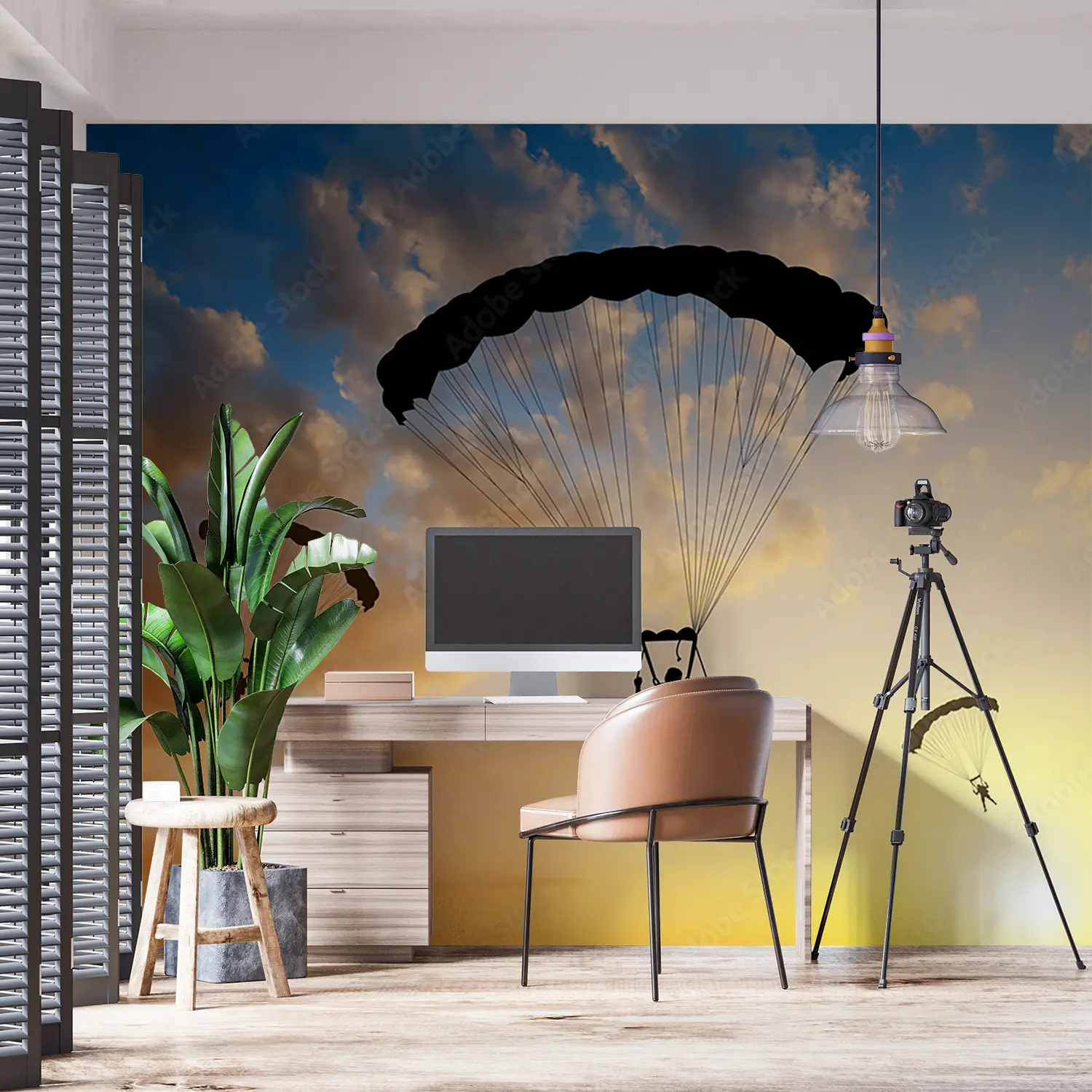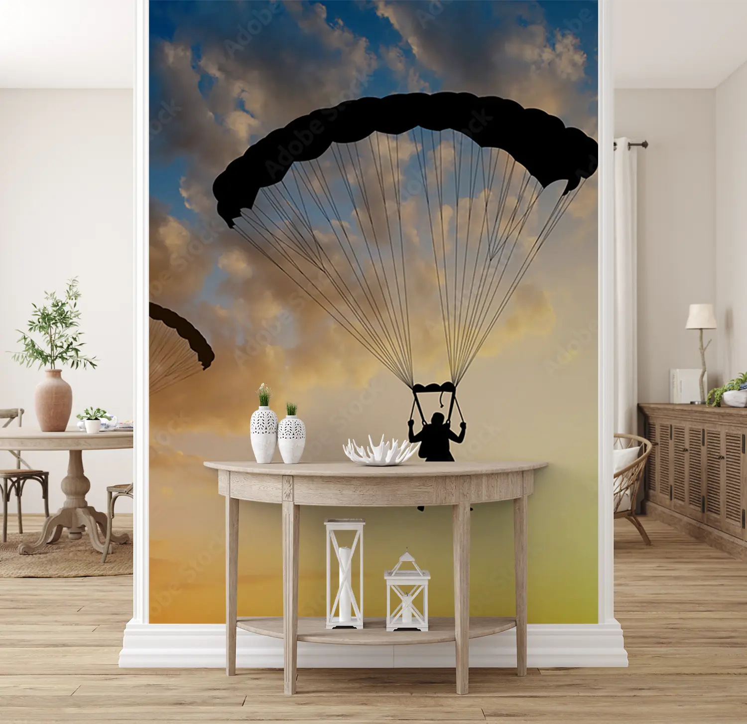 Immerse yourself in the breathtaking beauty of a sunset sky with a daring parachutist in this captivating wall art. This striking image brings a sense of adventure and freedom to your home decor, perfect for adding a touch of excitement to any room. Complementary colors to consider include warm tones like gold, navy blue, and charcoal gray.