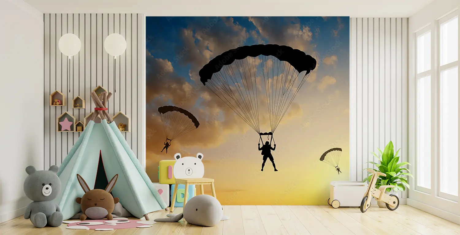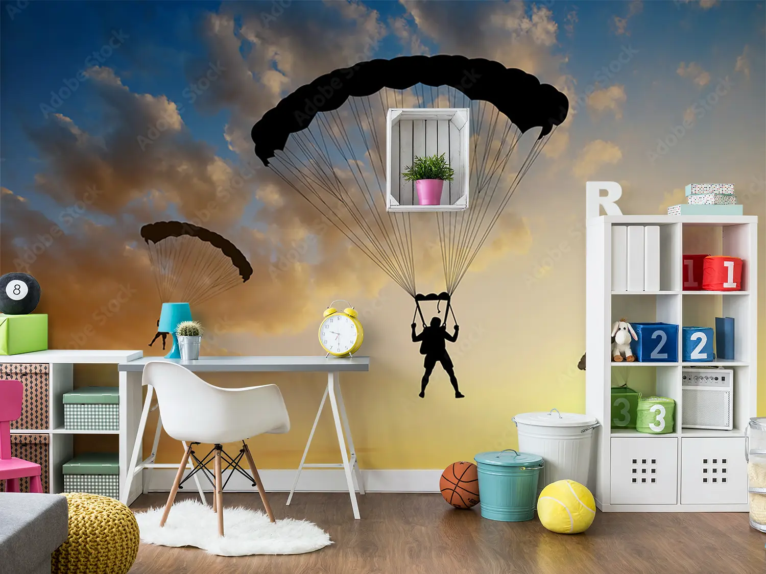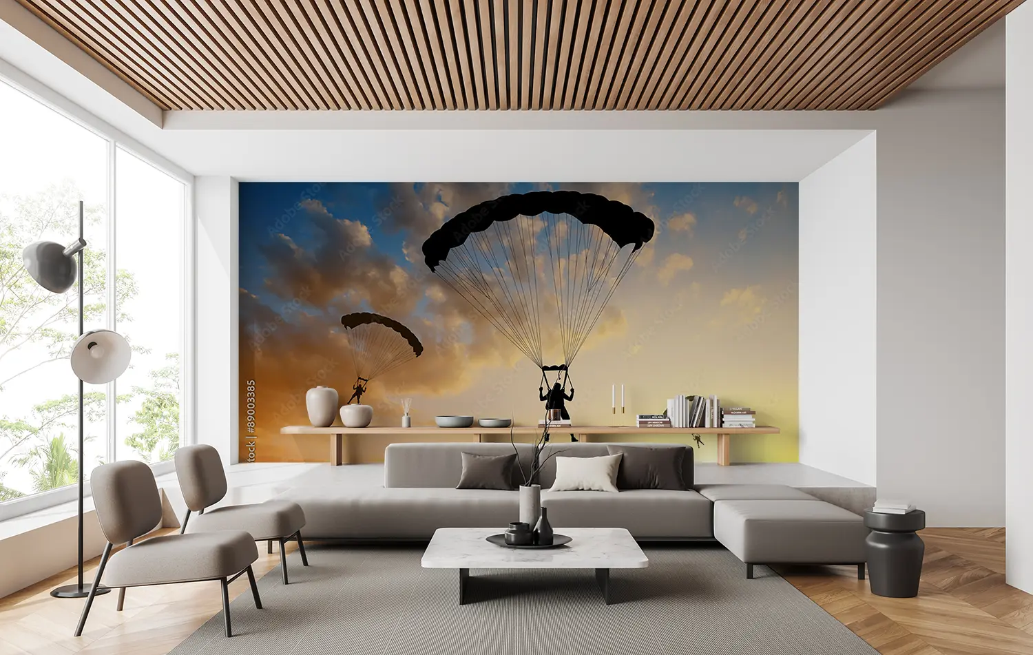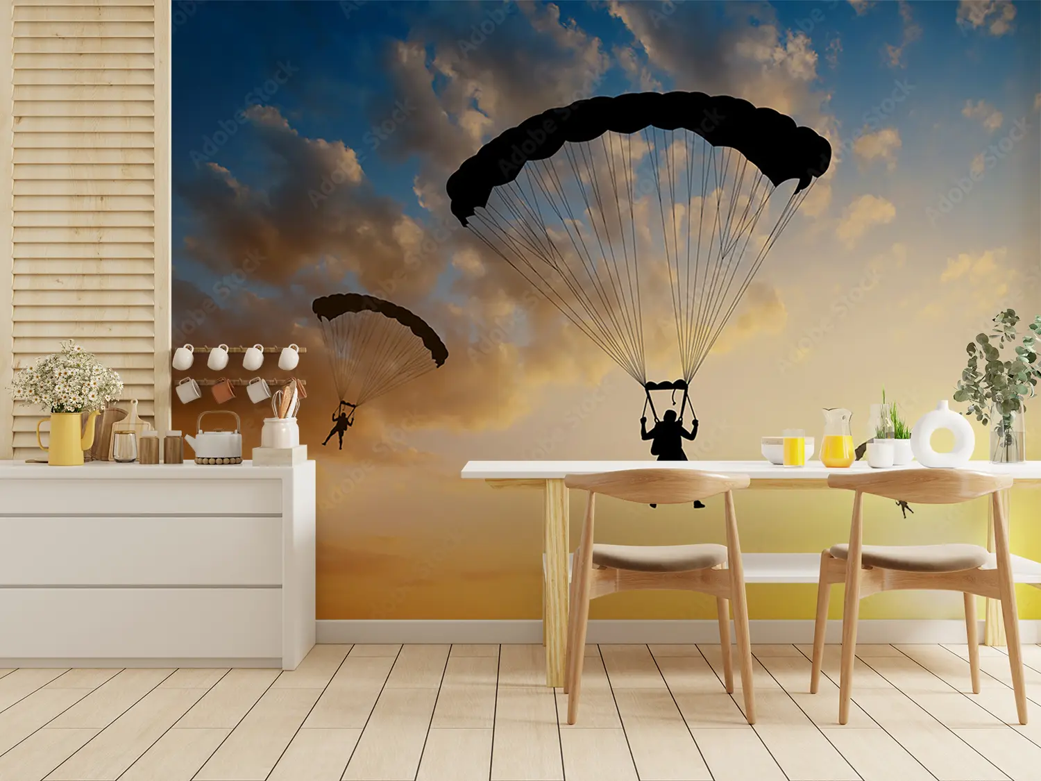 Immerse yourself in the breathtaking beauty of a sunset sky with a daring parachutist in this captivating wall art. This striking image brings a sense of adventure and freedom to your home decor, perfect for adding a touch of excitement to any room. Complementary colors to consider include warm tones like gold, navy blue, and charcoal gray.