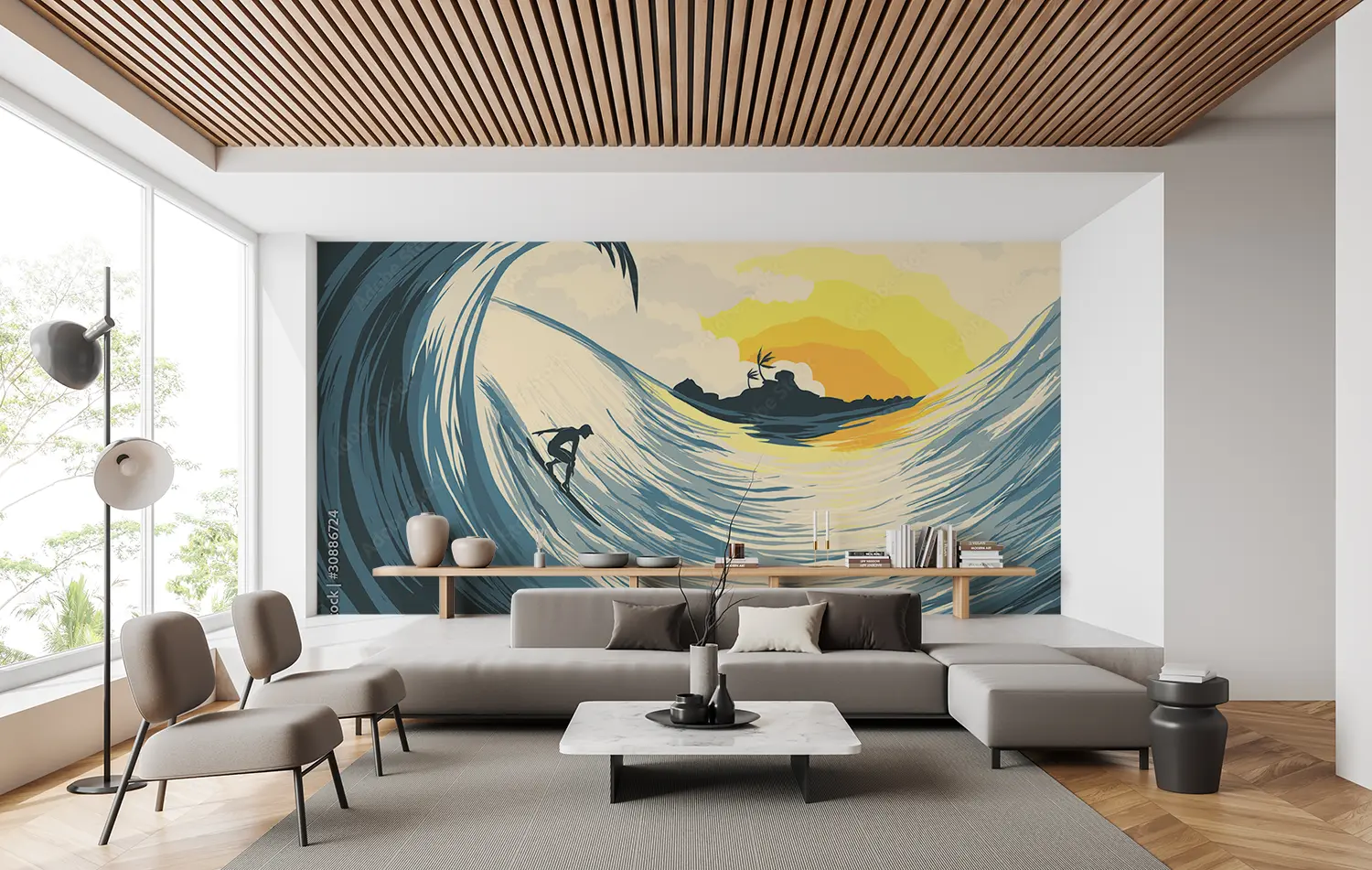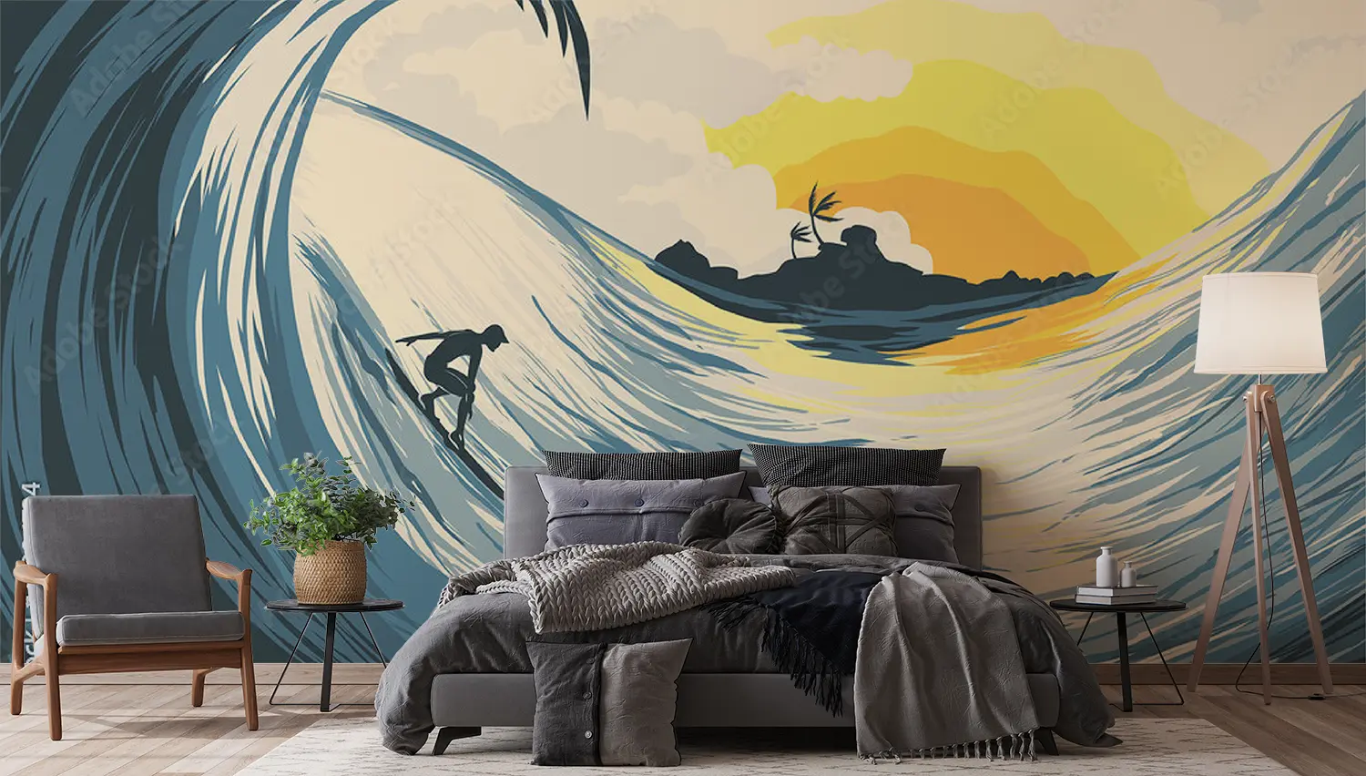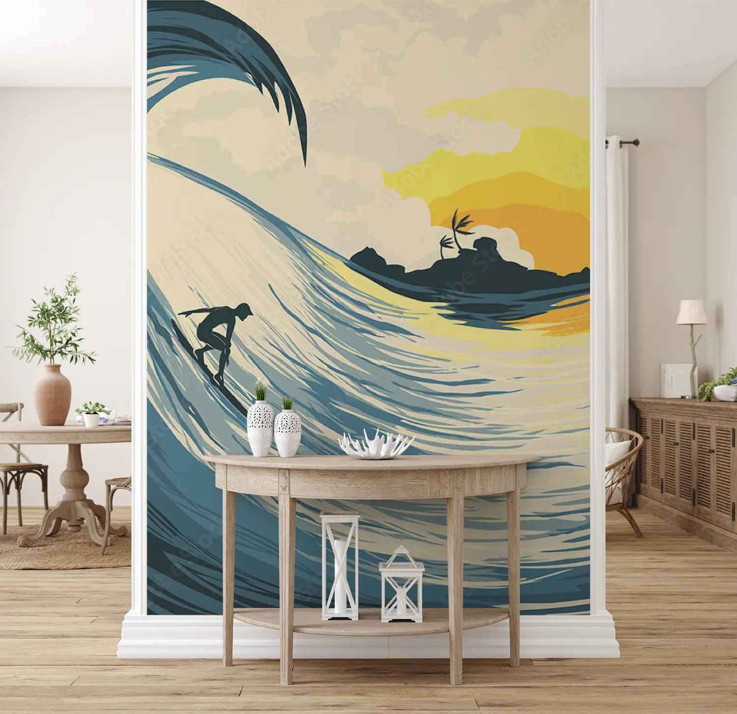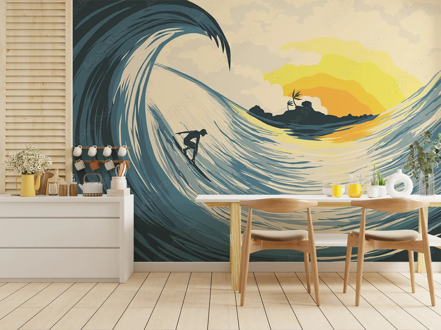 Explore the beauty of a serene sunset scene with a skilled surfer riding a majestic ocean wave on a vibrant surfboard. This captivating artwork adds a touch of adventure and relaxation to any home decor, perfect for a living room or office space. Complementary colors include shades of blue, yellow, and earthy tones to enhance the overall aesthetic appeal.