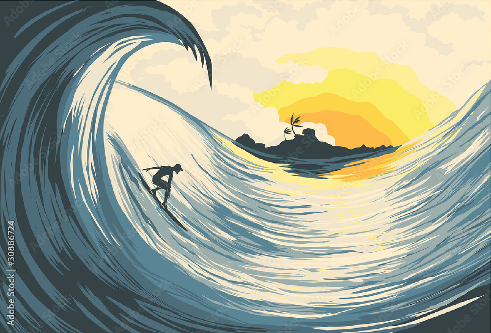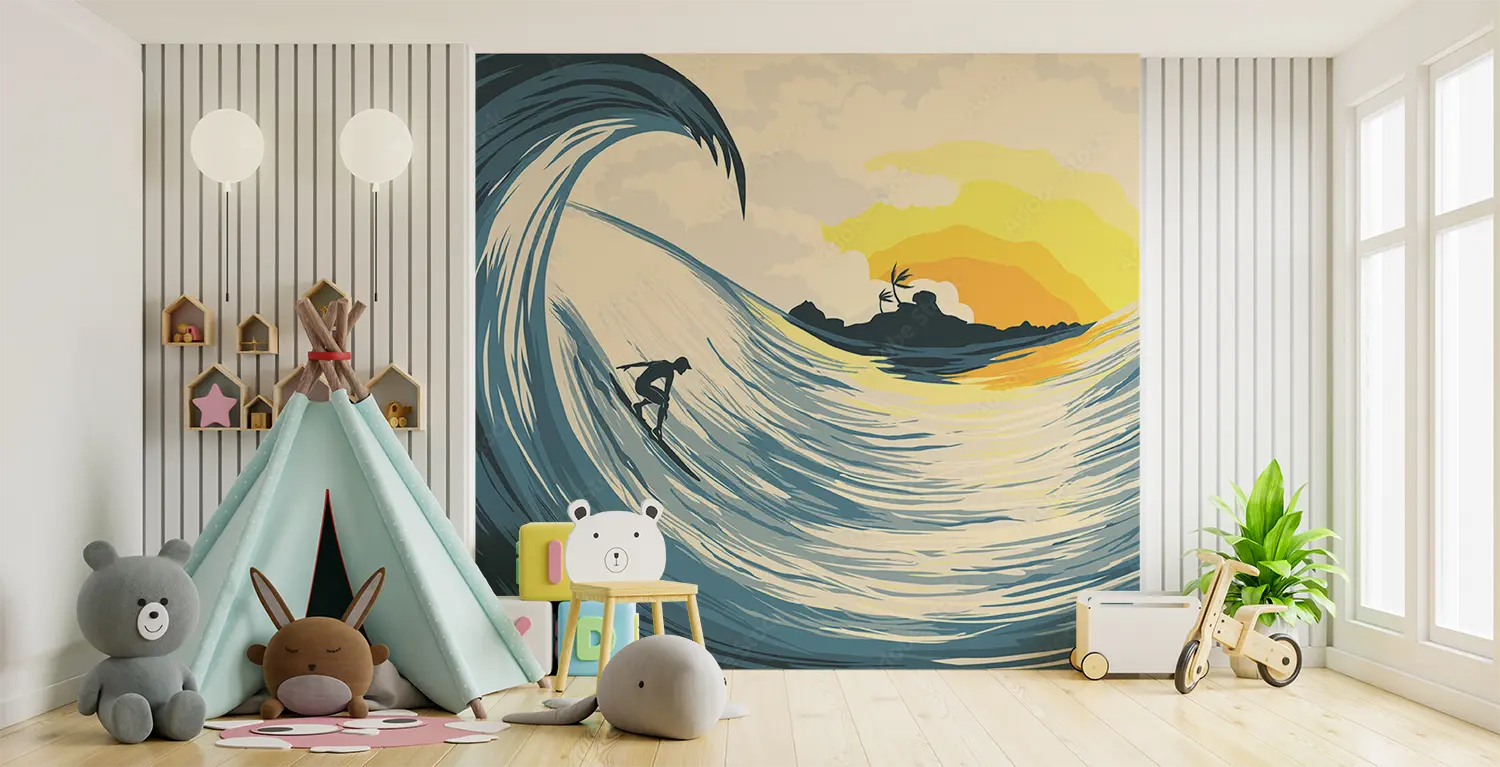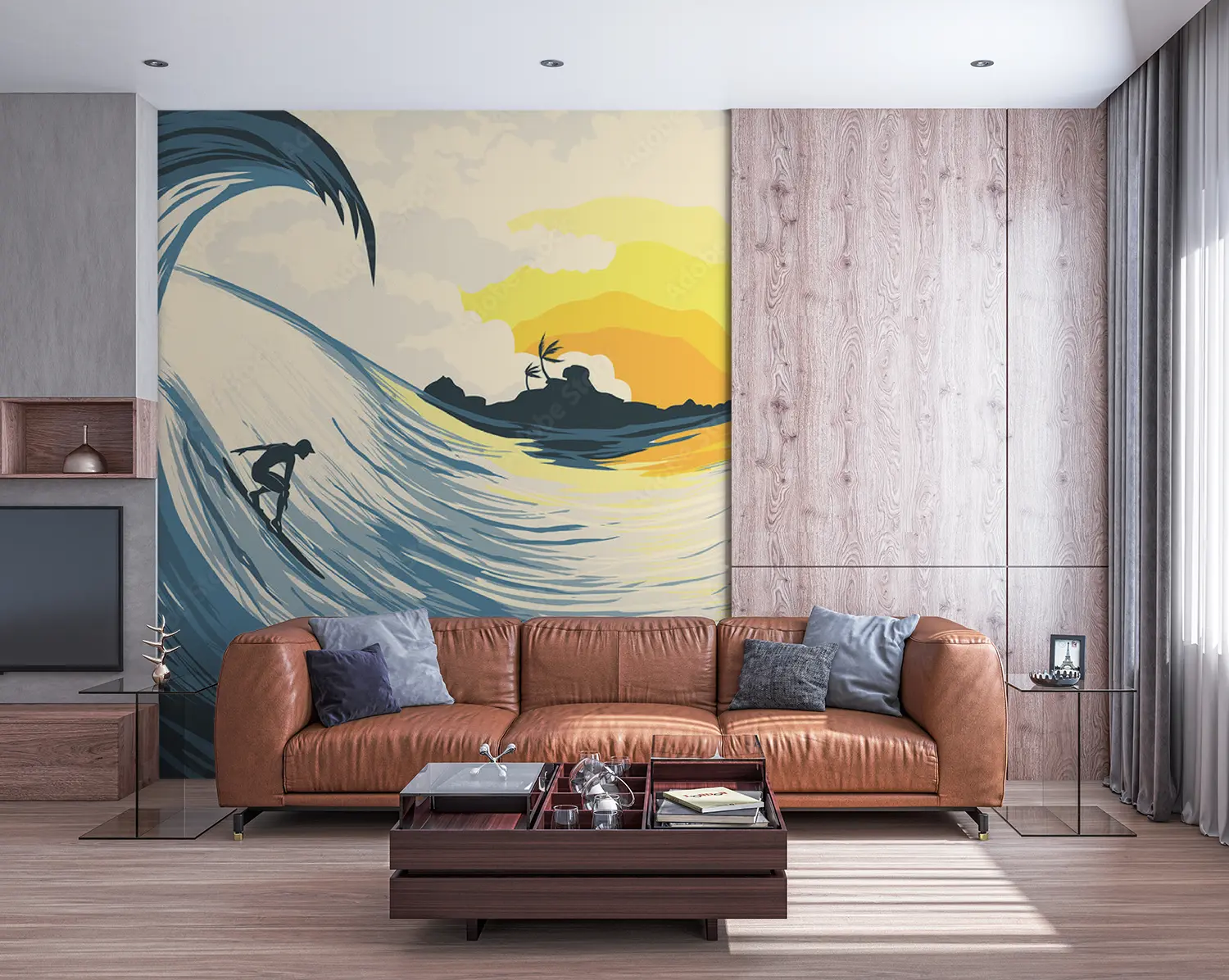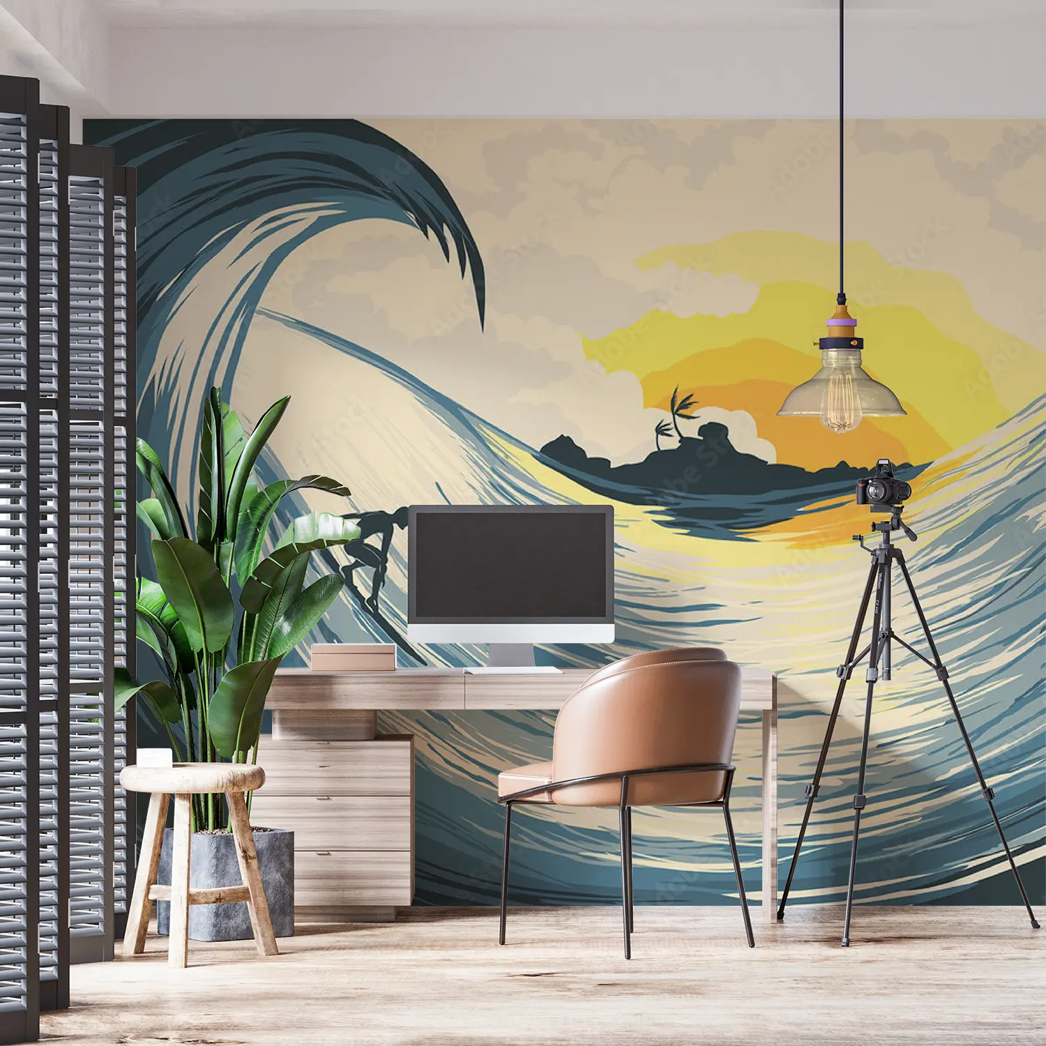 Explore the beauty of a serene sunset scene with a skilled surfer riding a majestic ocean wave on a vibrant surfboard. This captivating artwork adds a touch of adventure and relaxation to any home decor, perfect for a living room or office space. Complementary colors include shades of blue, yellow, and earthy tones to enhance the overall aesthetic appeal.